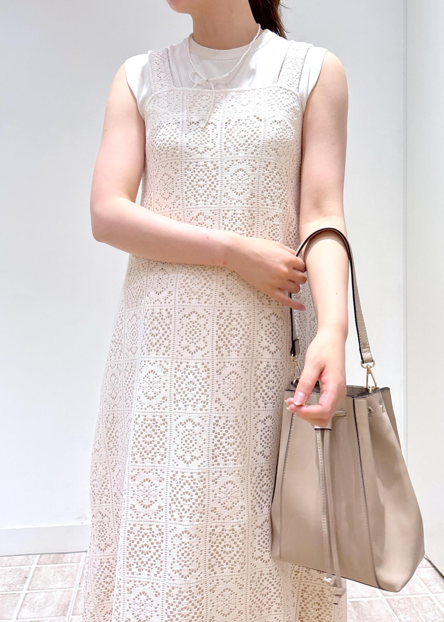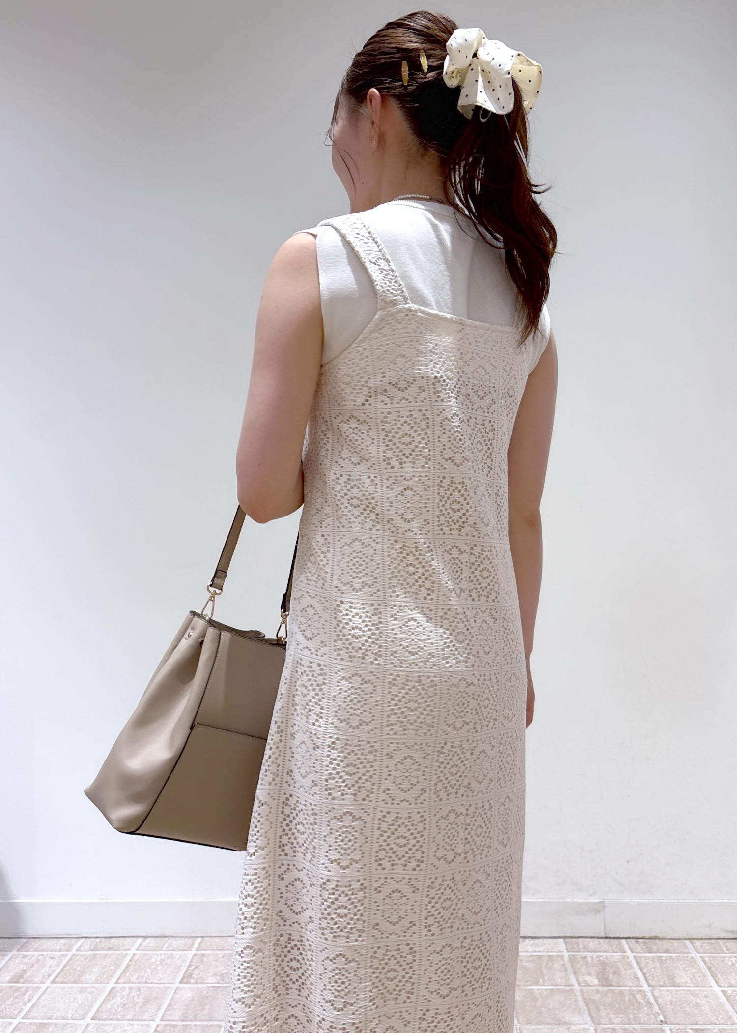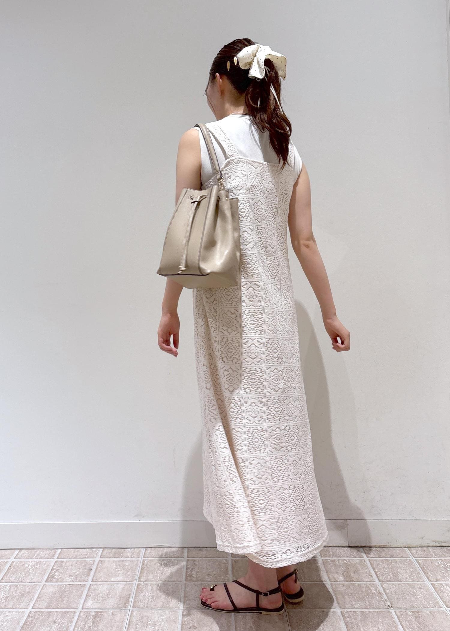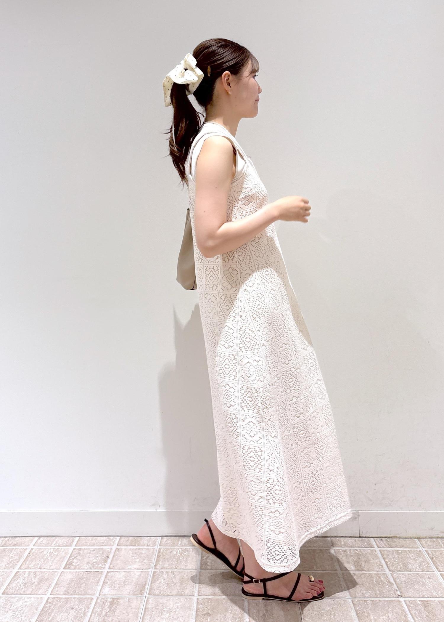 レース素材が可愛らしいワンピースを甘めに着て見ました◎ワンピースはラインを拾いにくいので、ヘアをポニーテールにすることでメリハリをつけました◎