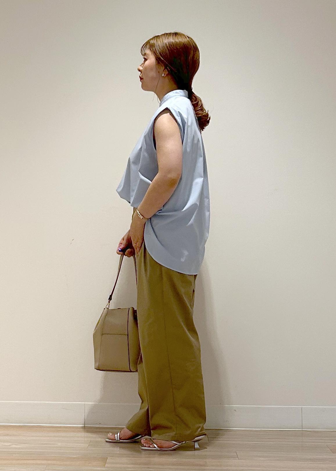 低身長*バンドカラーノースリーブシャツ×チノタックワイドパンツ