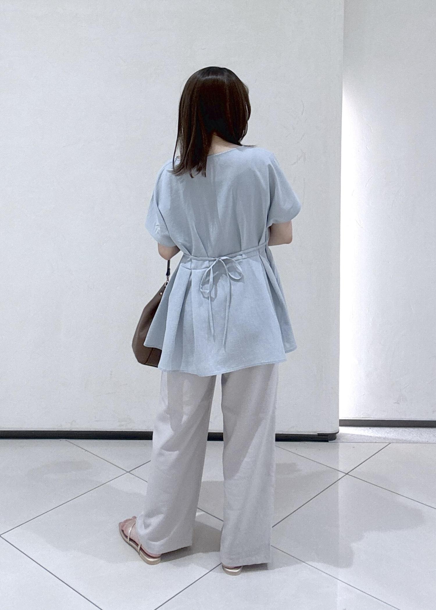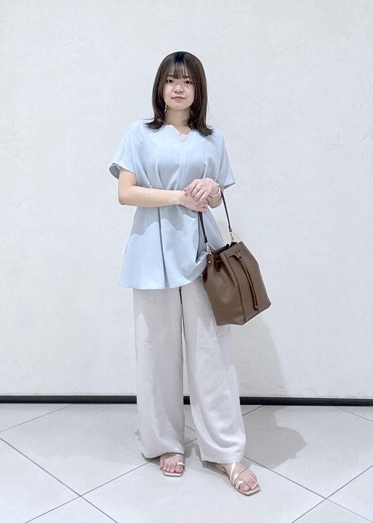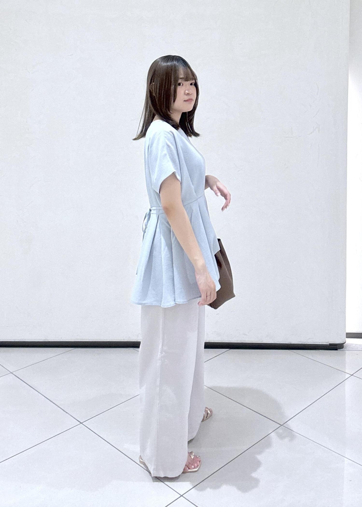 トップスは淡い水色で、涼しげな印象にコーデを組みました!素材も薄手で肌への張りつきを気にせず、暑がりの私でも快適に着られました!