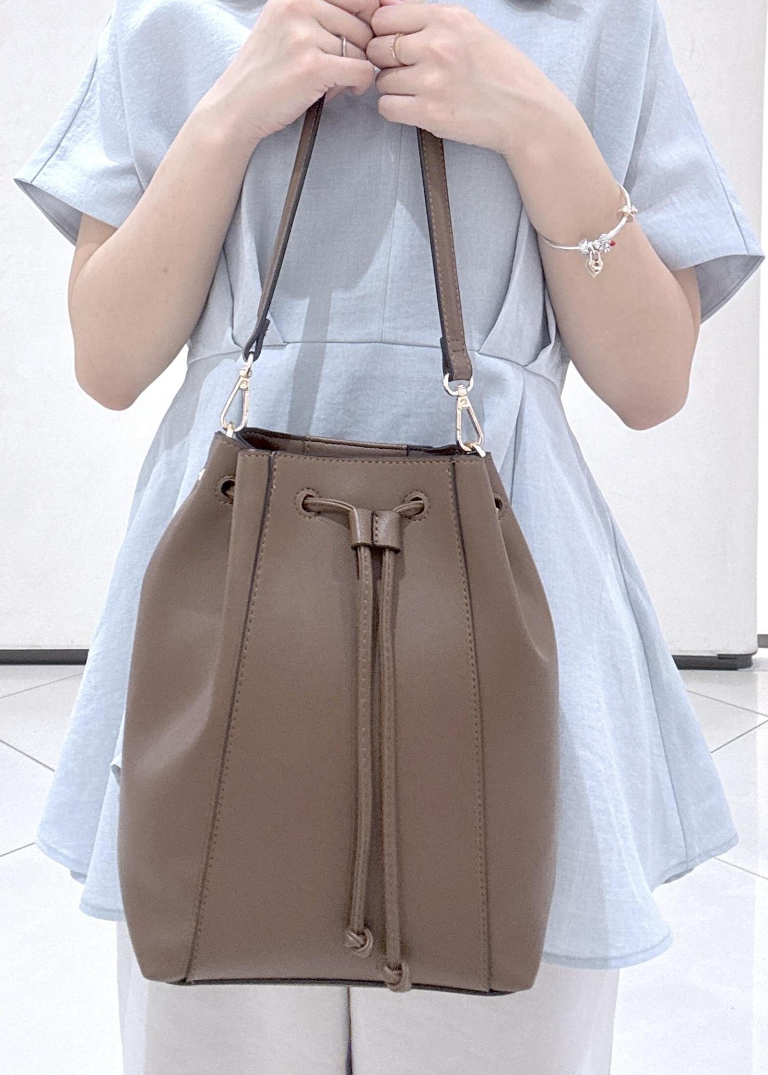 全体的に淡い色味なので、小物の締め色はブラウンを使いました!