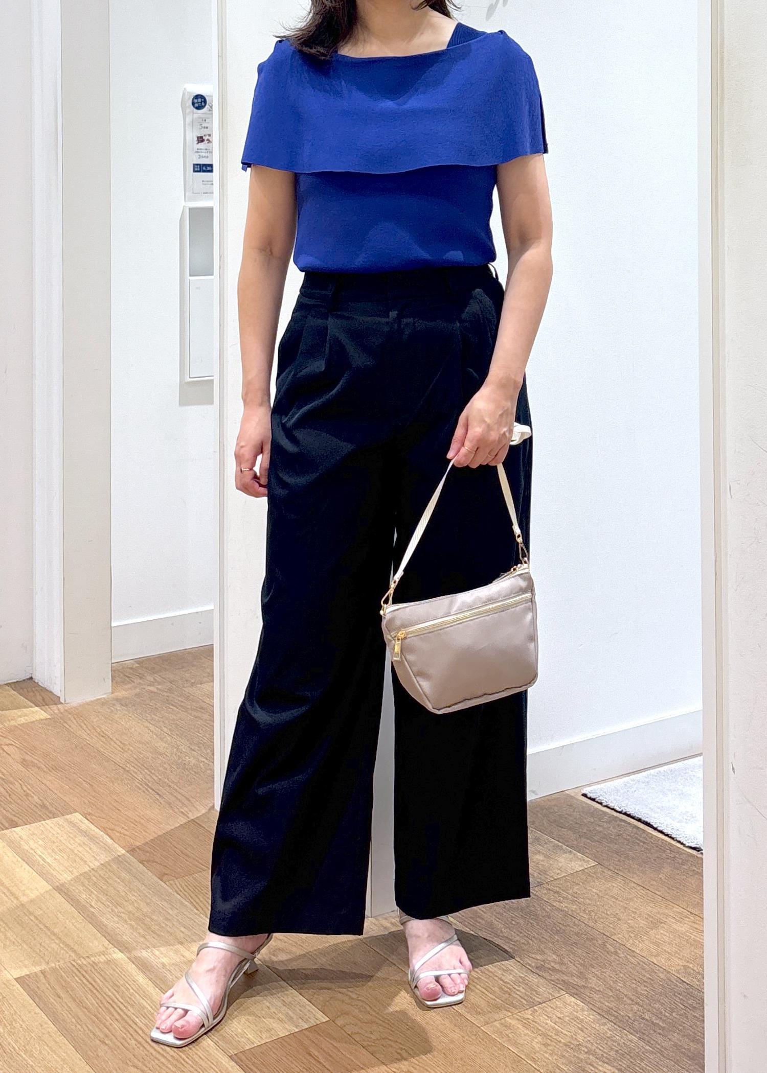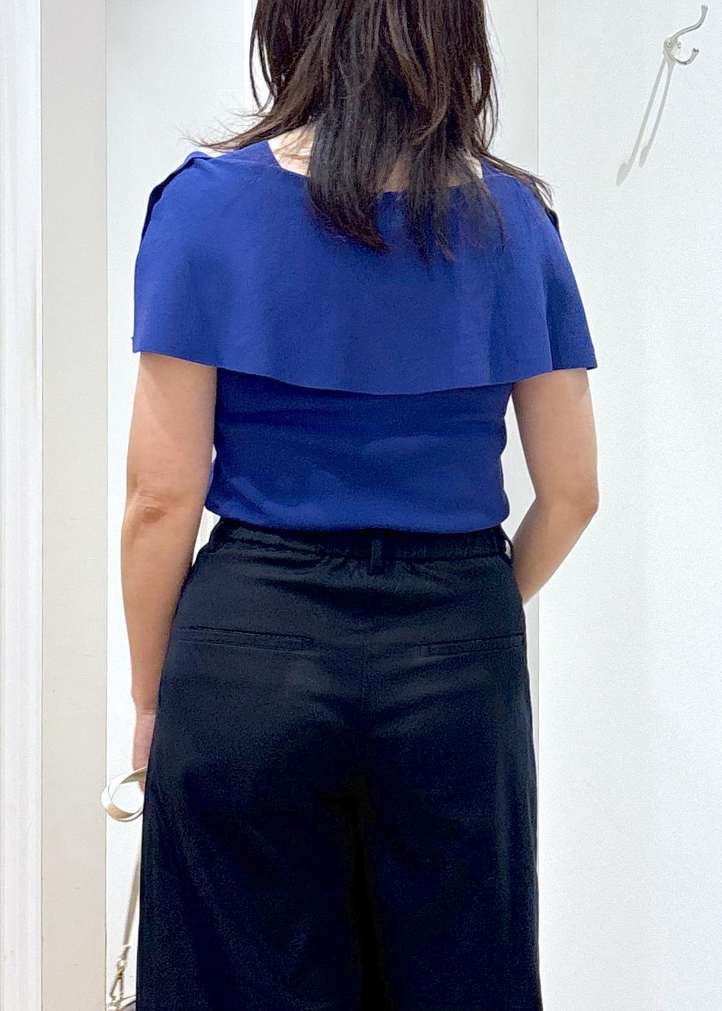 とても綺麗なブルーのニットは、ネイビーのパンツと合わせて
