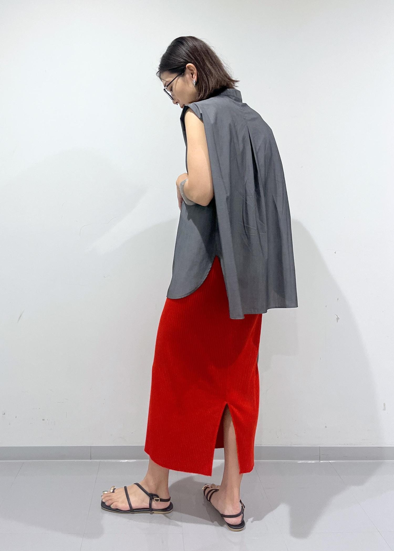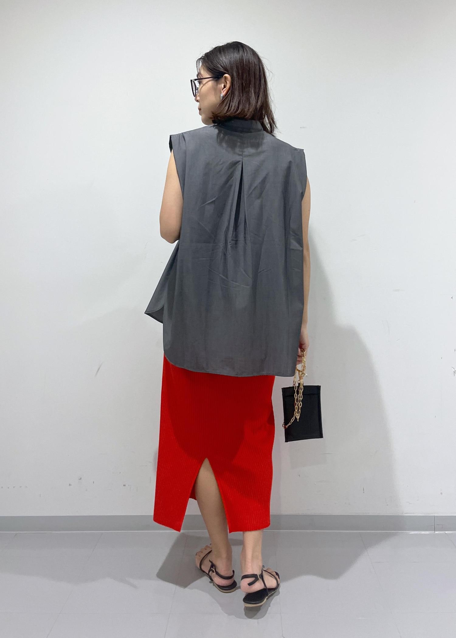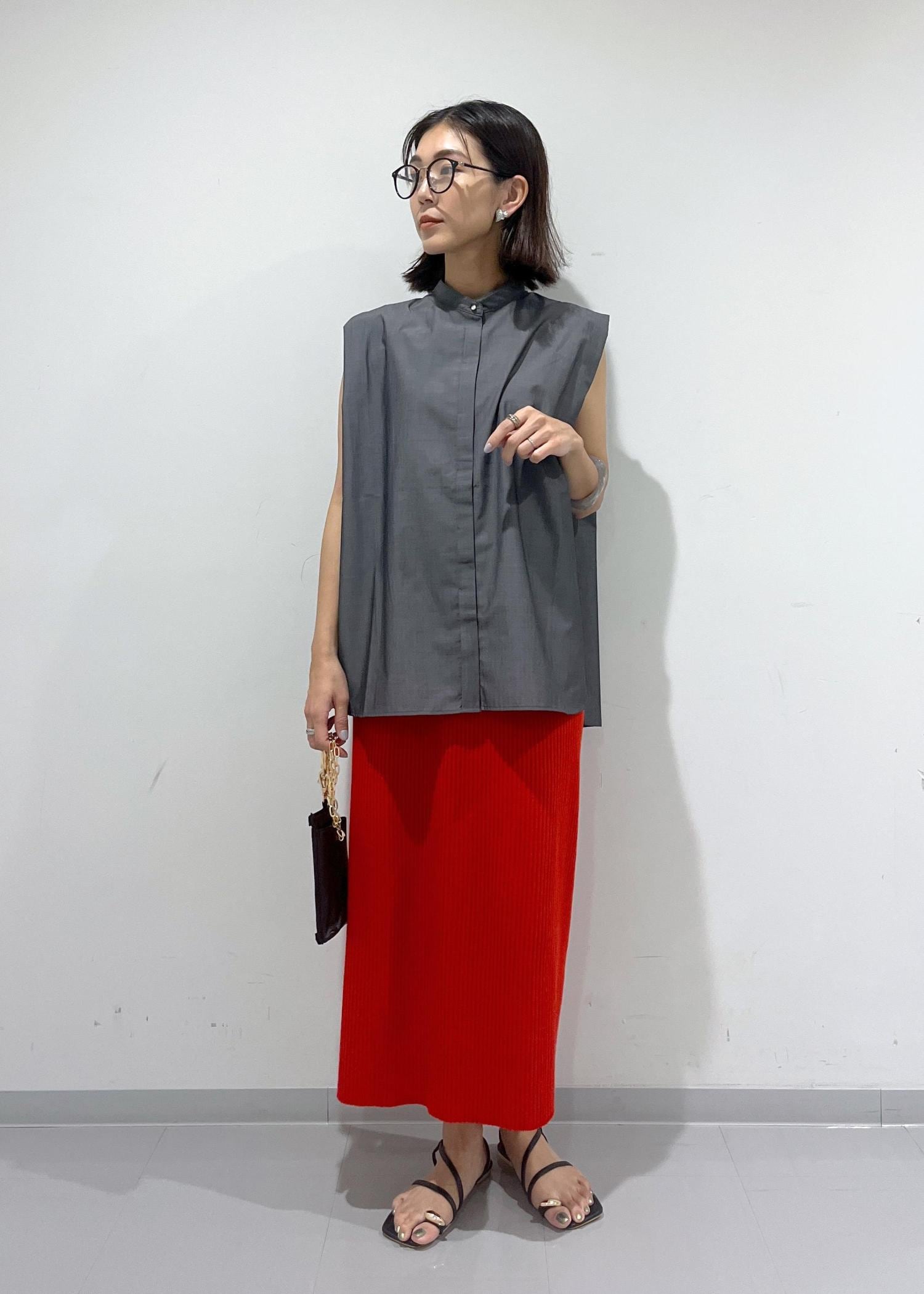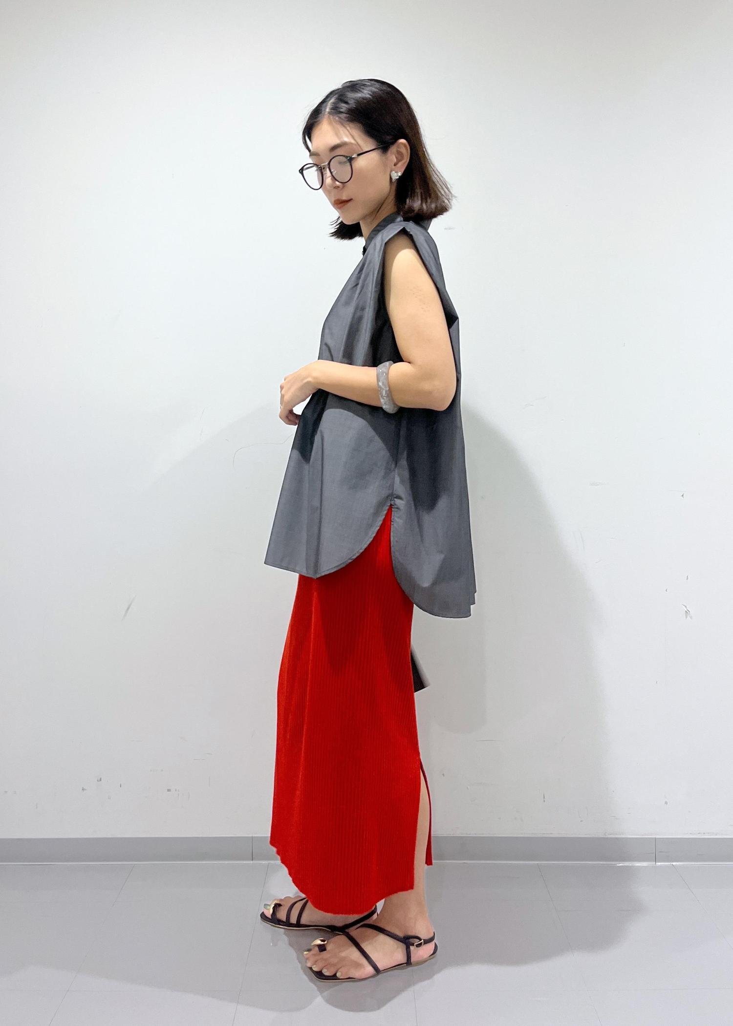 シャツの色がチャコールなので、ビビットカラーのスカートと合わせてもコントラストがキツくなりすぎず程よいカッコ良さを作ることができます。