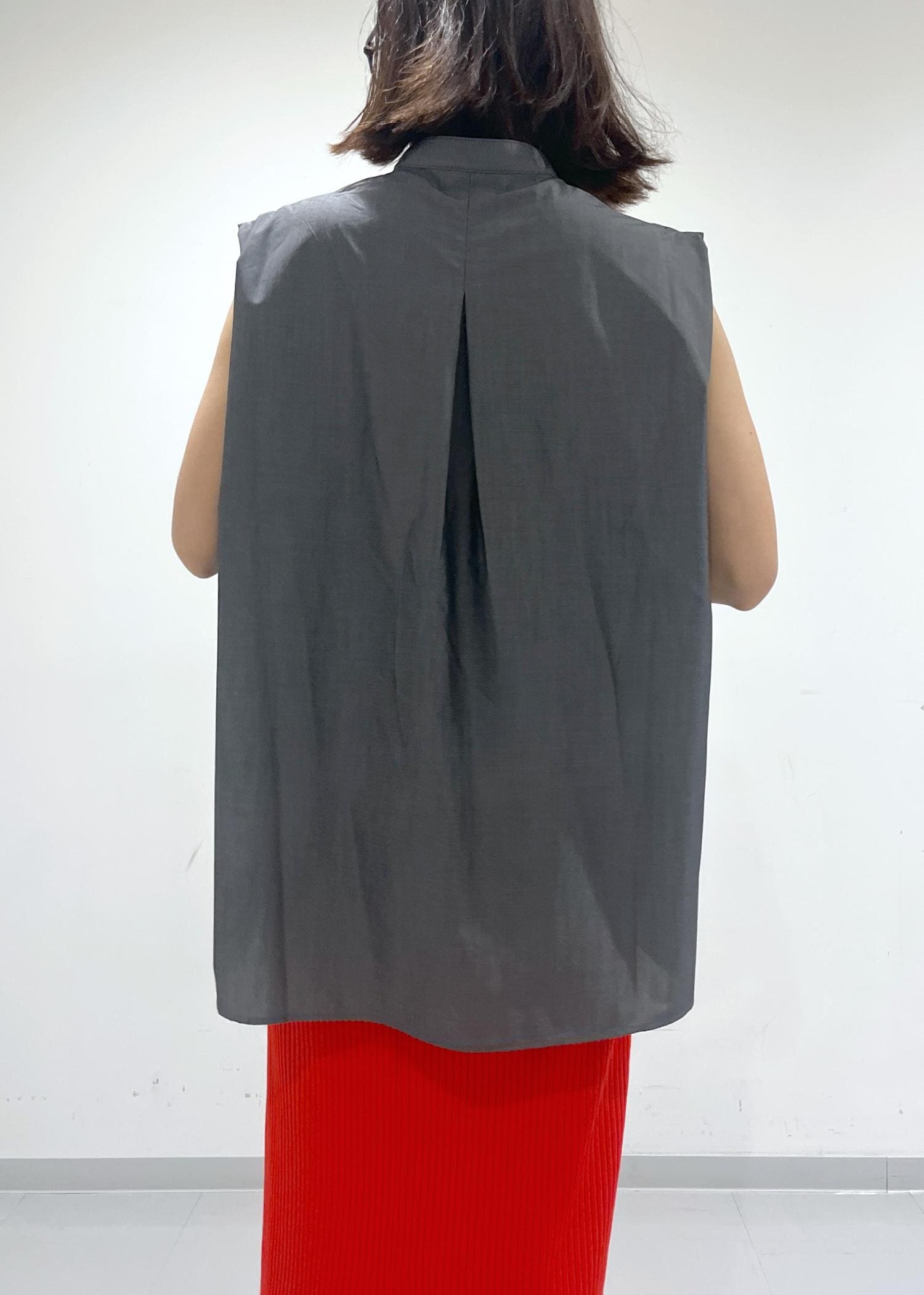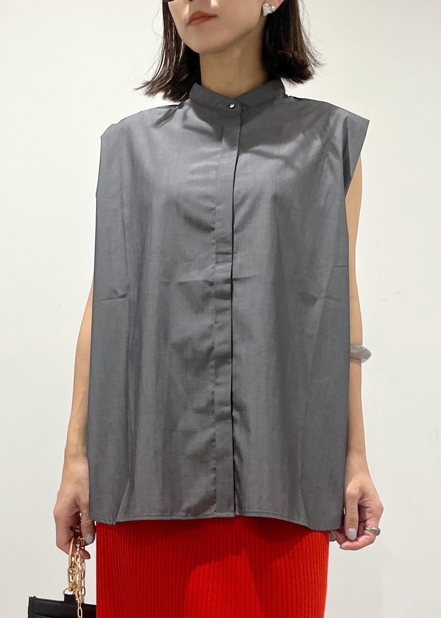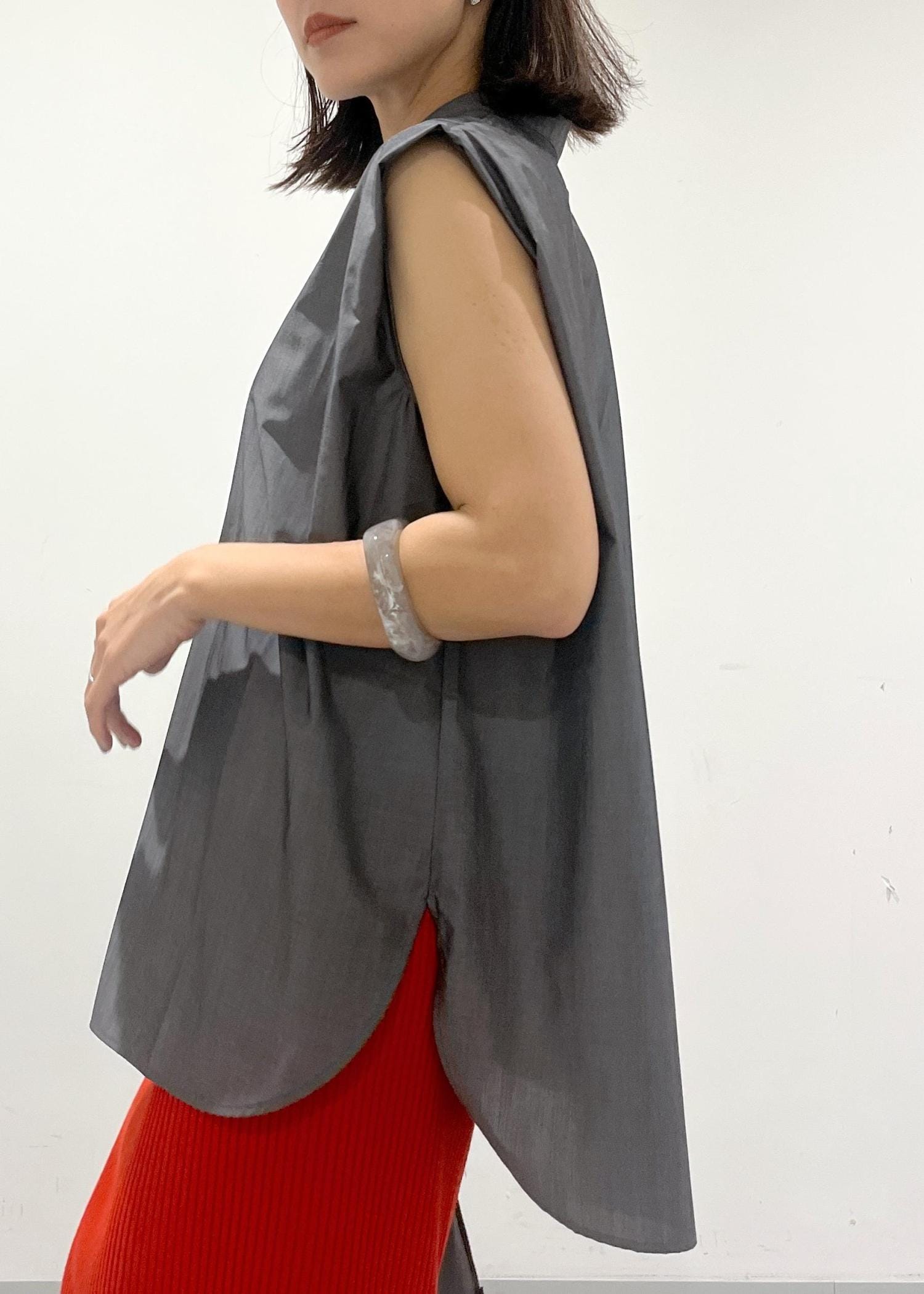 ノースリーブですが、肩がしっかり隠れるデザインでさらにサイドのタックのおかけで二の腕をすっきり見せてくれるので、ノースリーブが苦手なでも挑戦していただきやすいブラウスです。