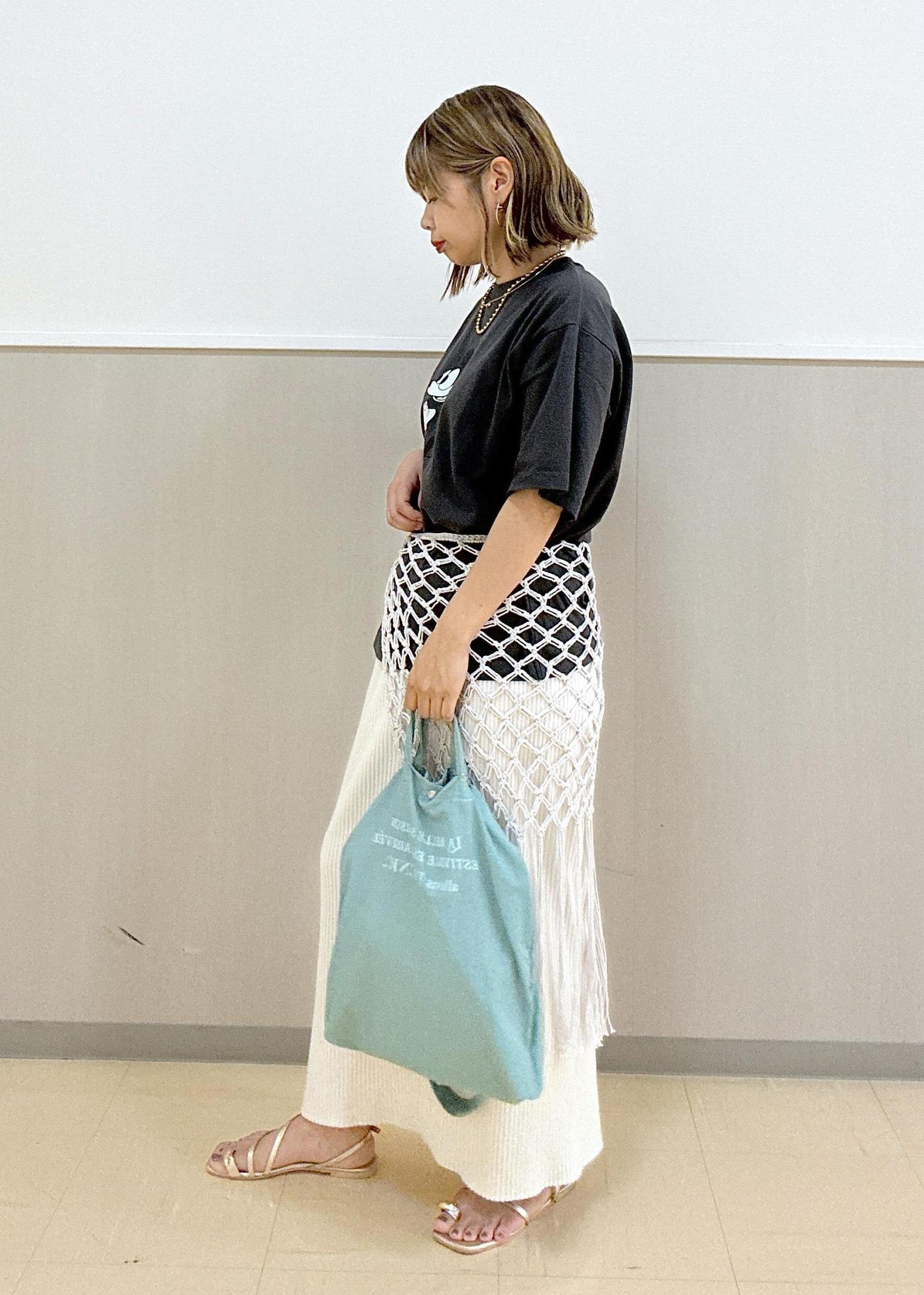 オーバーサイズなので、かぎ針の巻きスカートを巻いてウエストマークをし、メリハリをつけました!