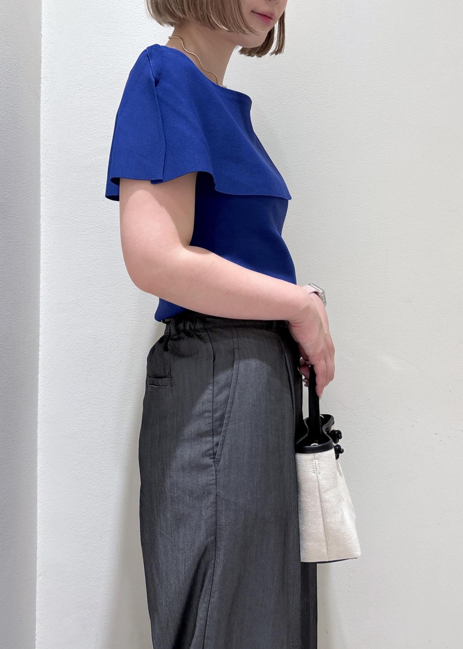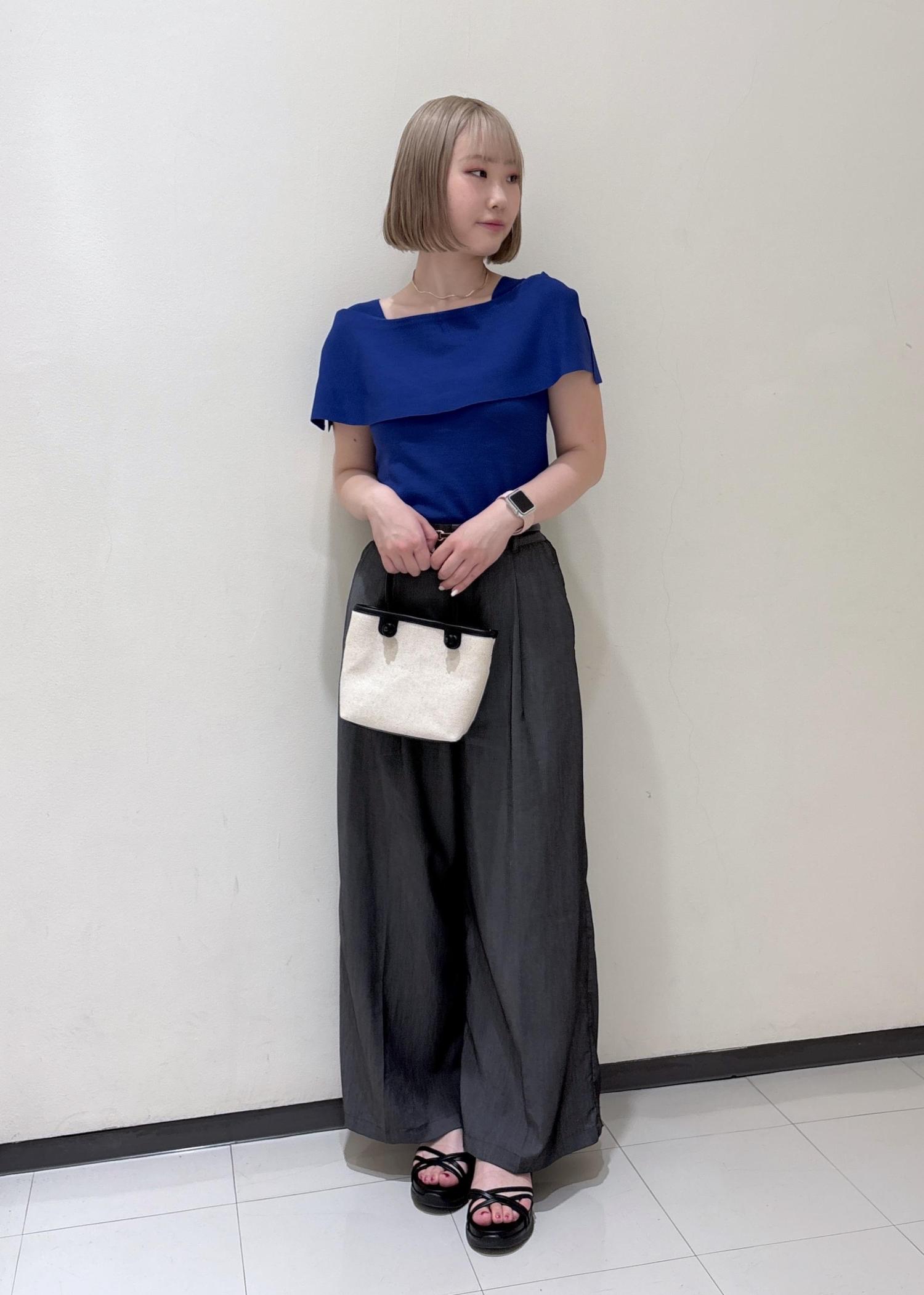 ケープニットにワイドパンツを合わせた、ベーシックなコーディネートです。