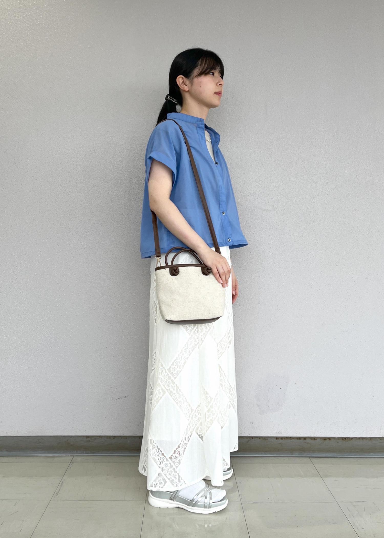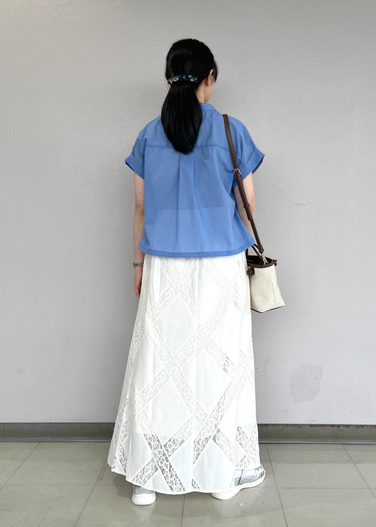 ブルーの羽織りと、レースのスカートを着用したキレイめコーデです。
