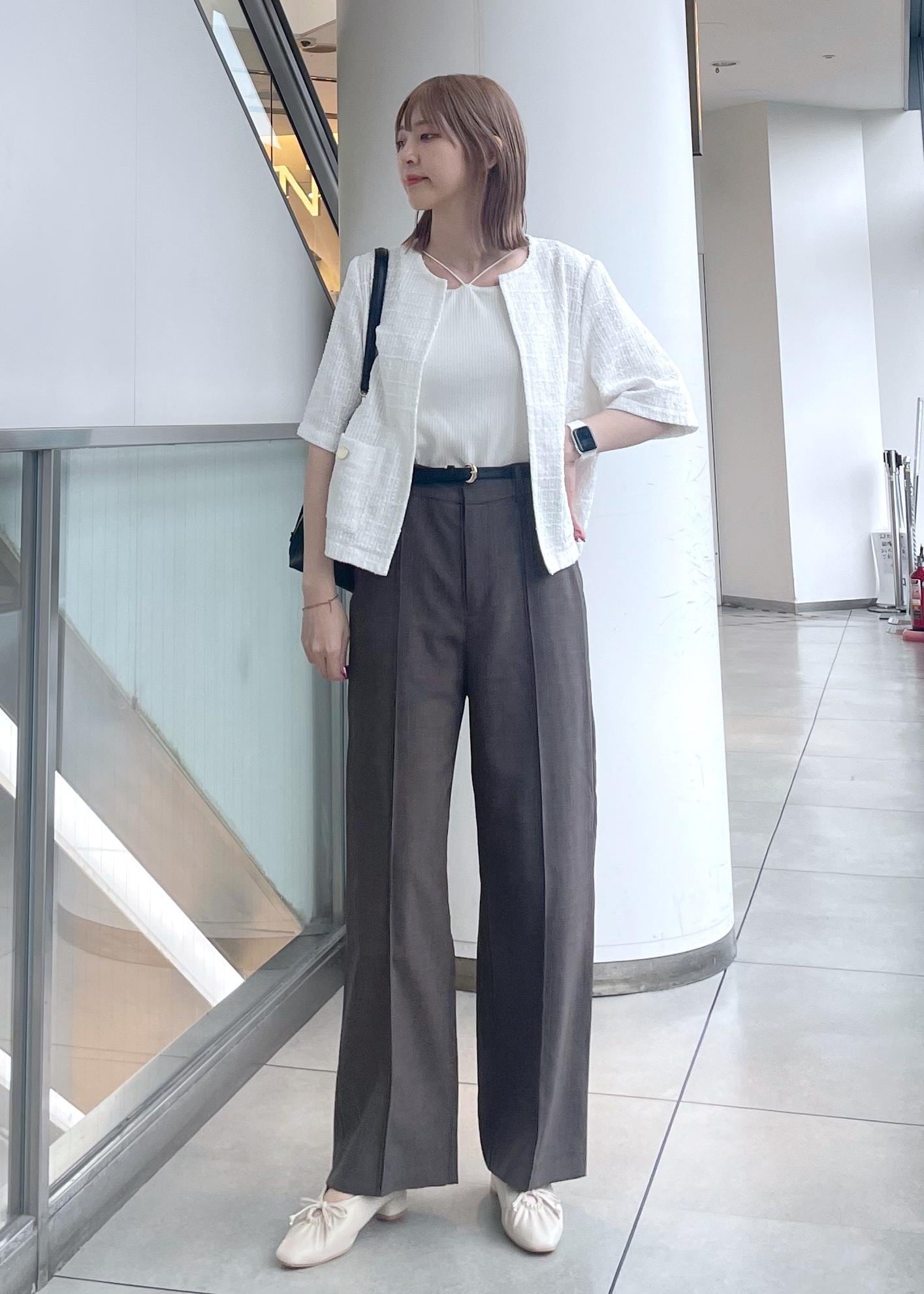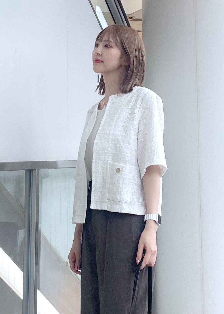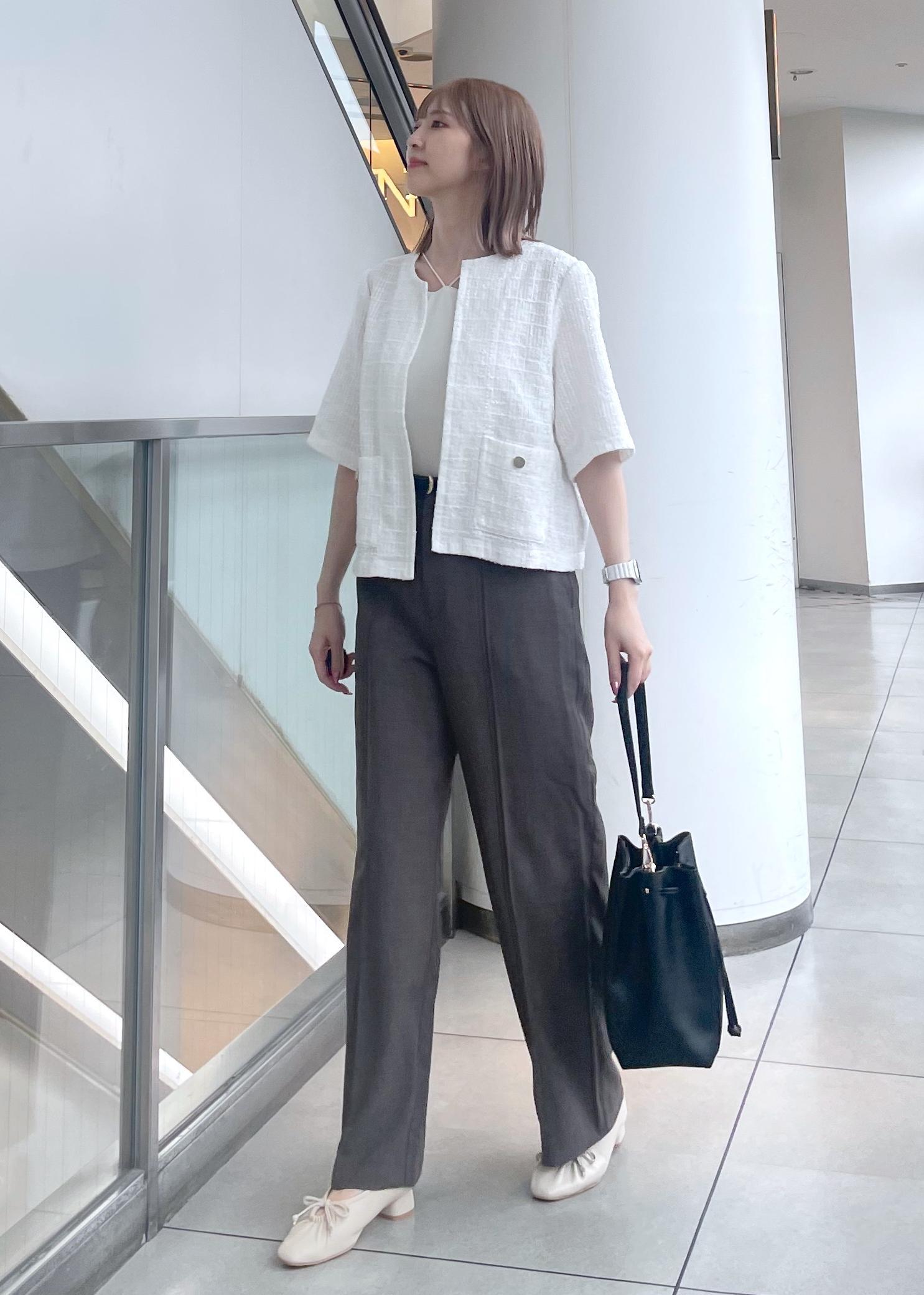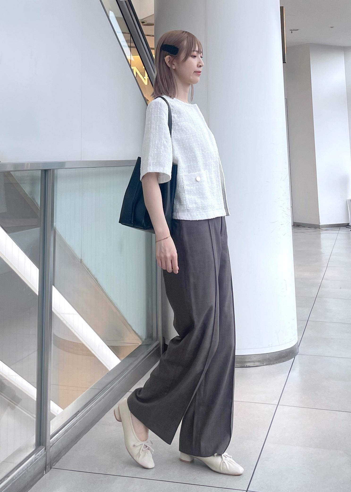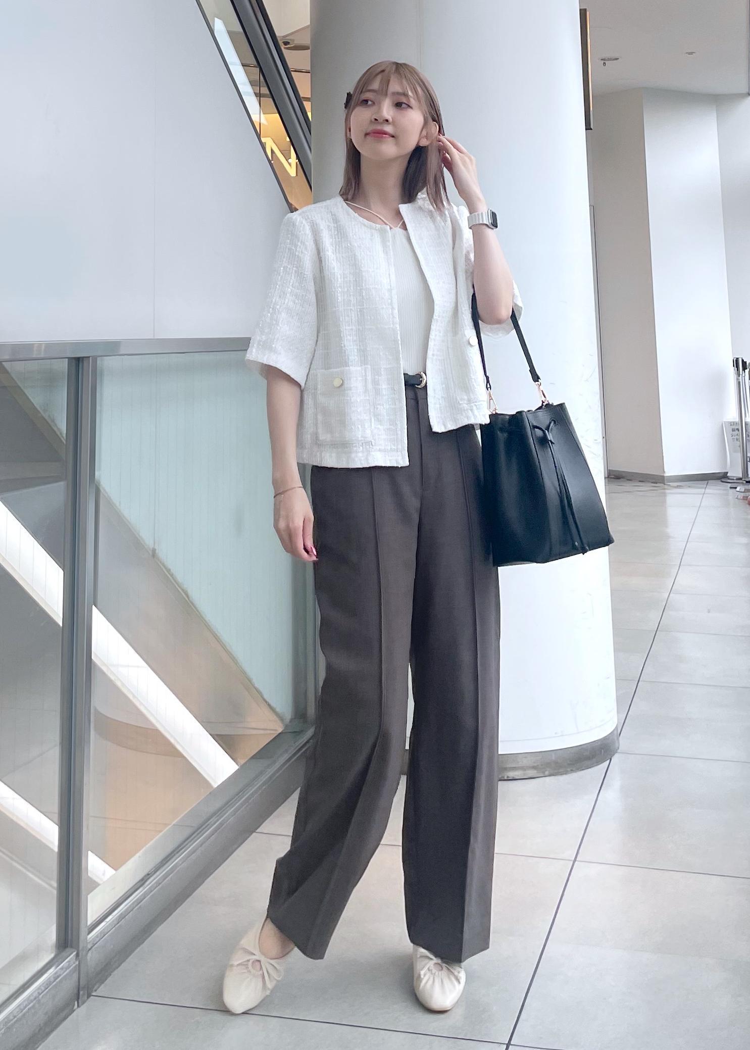 夏でも涼しく着られるツイードのキレイめスタイルです。ちょっとしたお出かけにもピッタリですし、お仕事にも使えますよ。