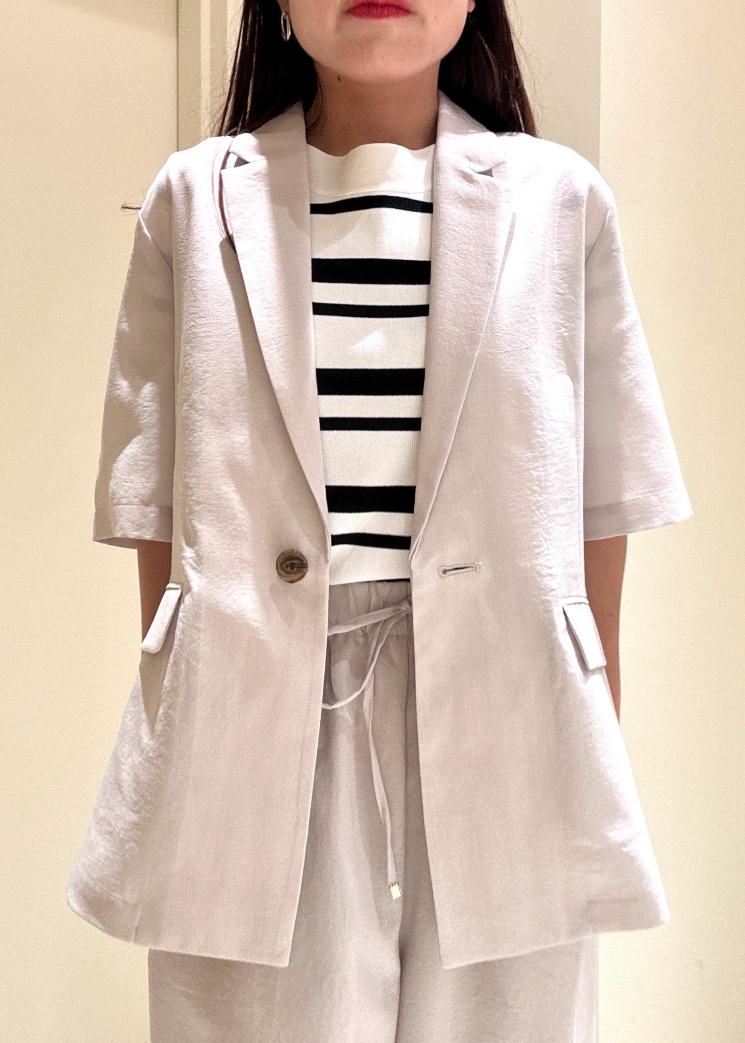 袖丈は肘ぐらいなので二の腕をカバーしてくれて、着丈はヒップが隠れるぐらいの長さなので体型カバーにもおすすめです。 -