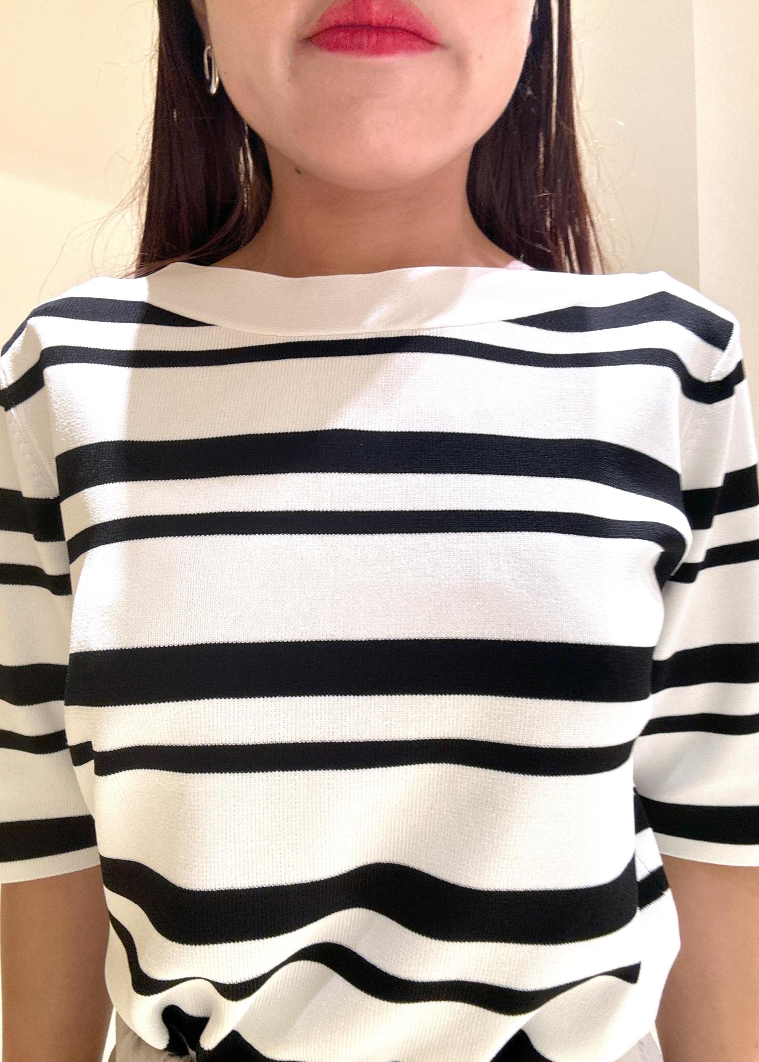 ボートネックなので顔周りがすっきりと見えるデザインです。