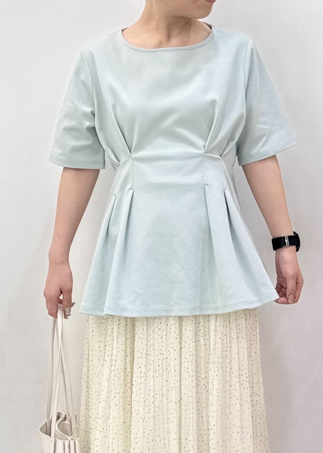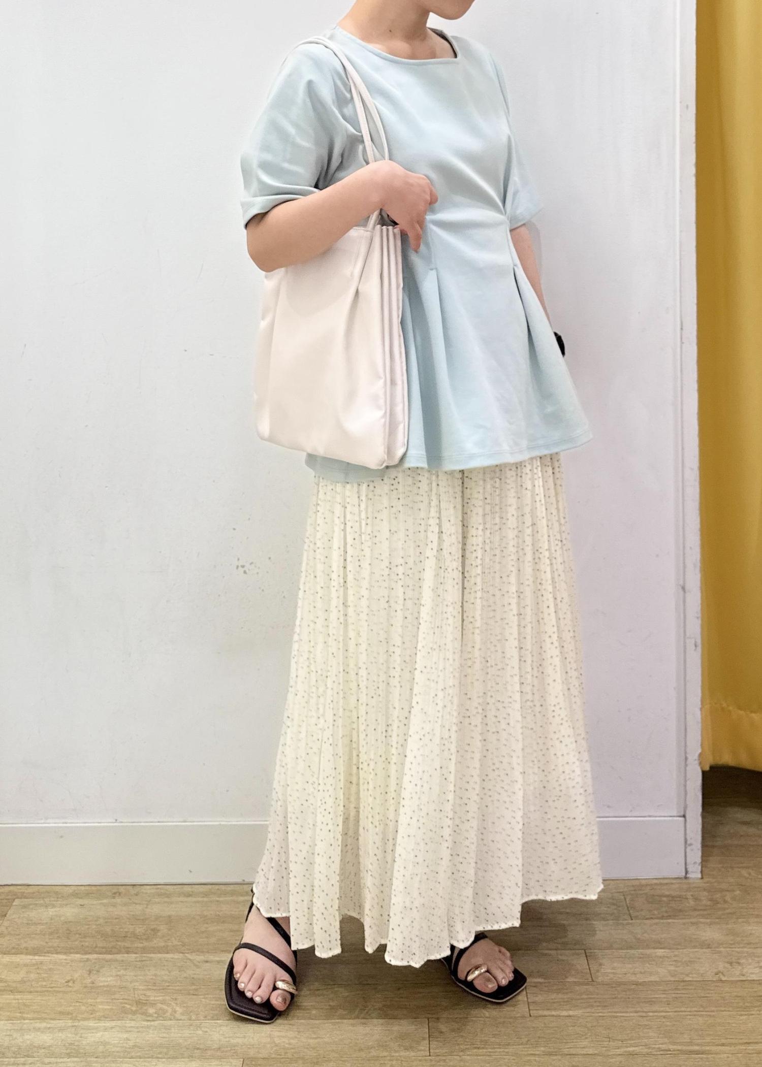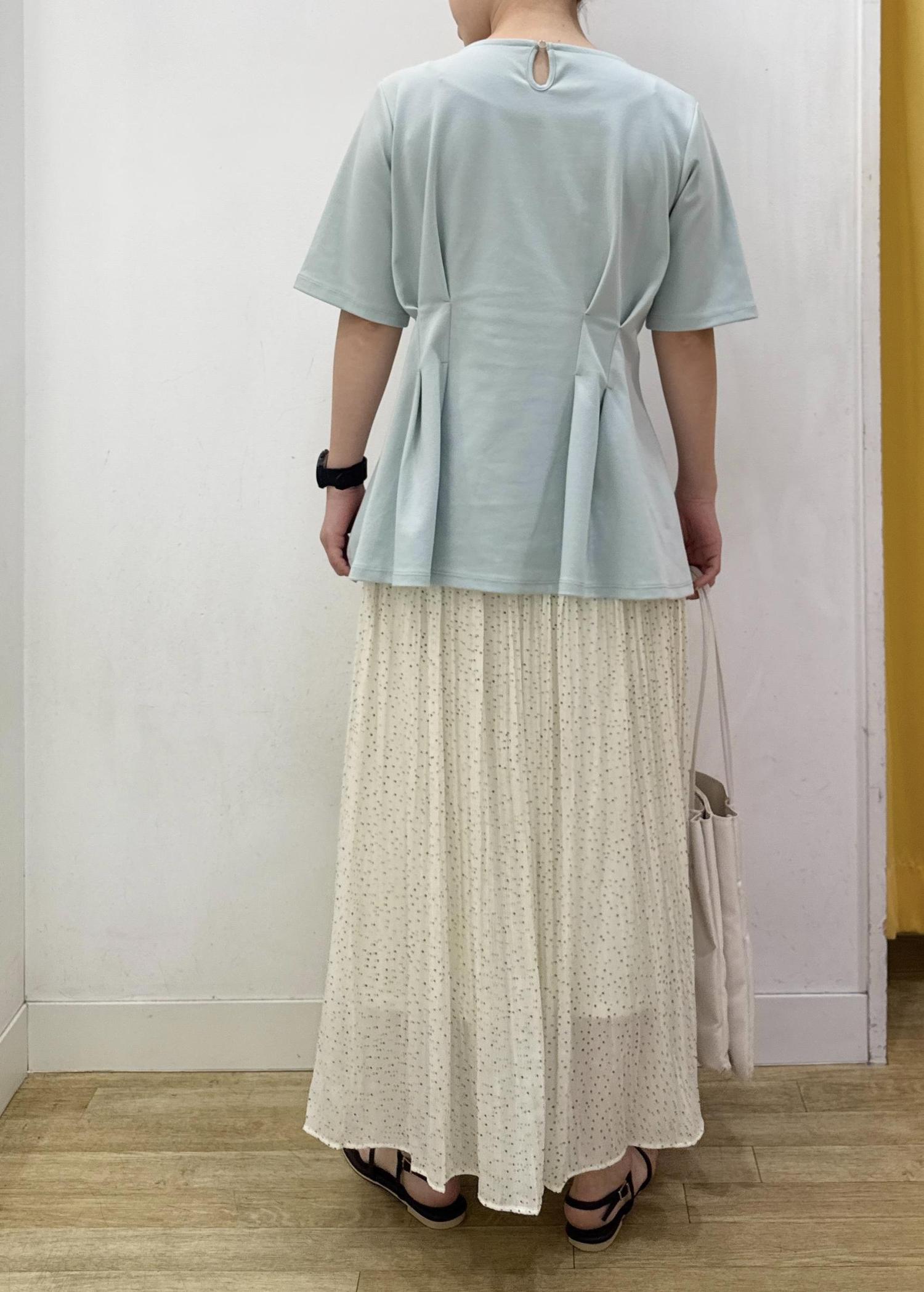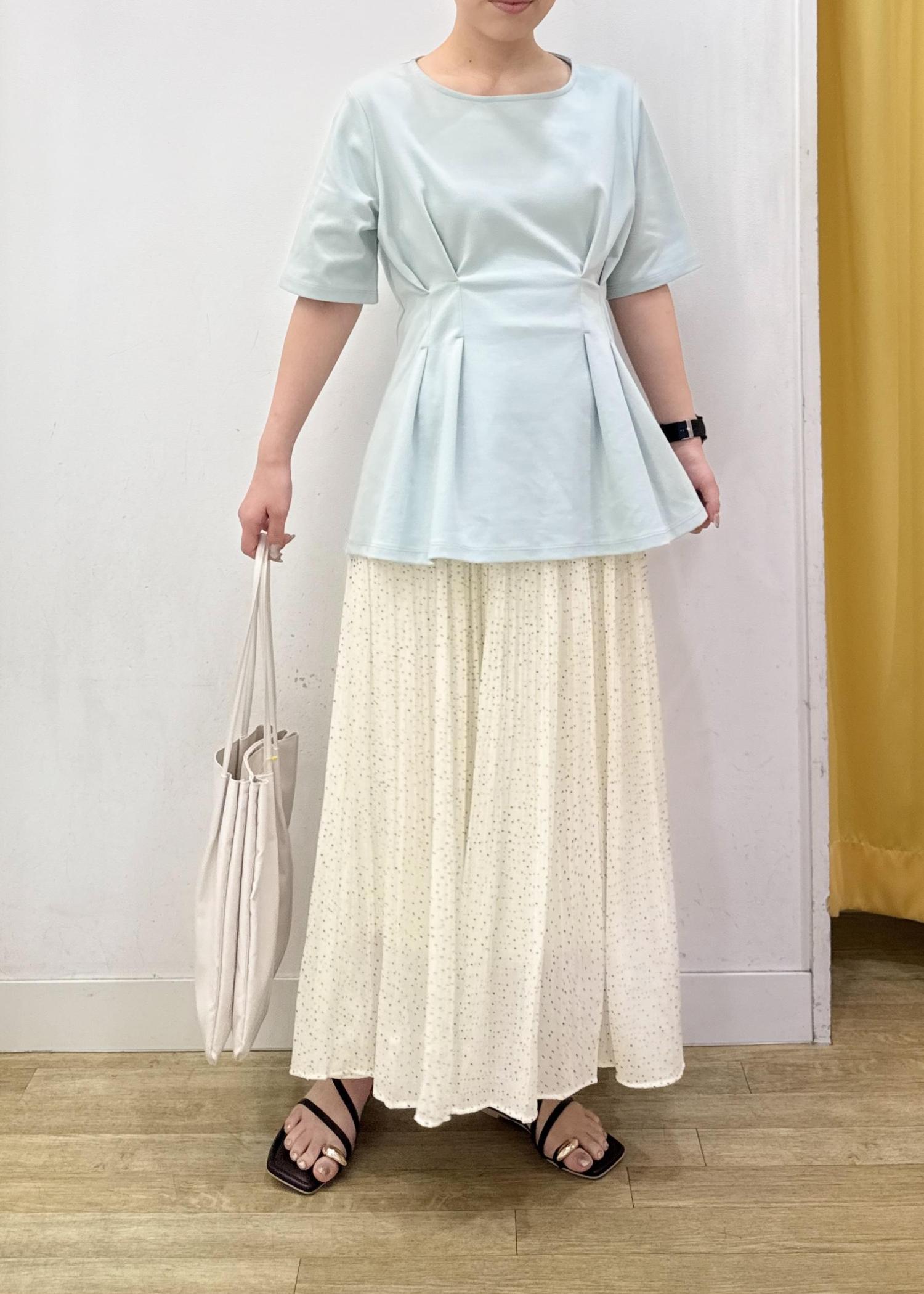 ペプラムシルエットのカットトップスに、プリーツスカートをゆるっと合わせてオシャレに!体型カバーも叶うオススメコーディネートです☺︎