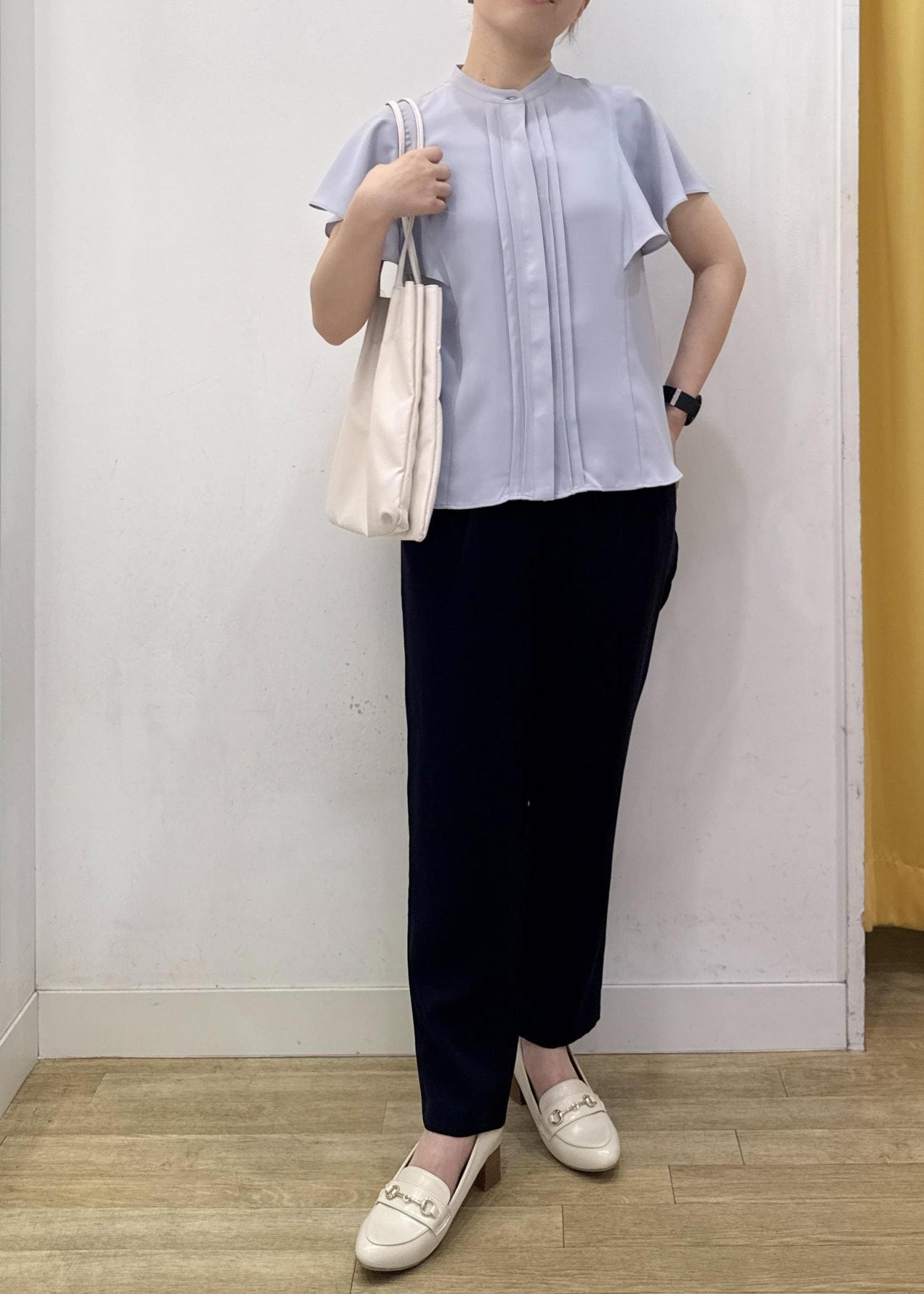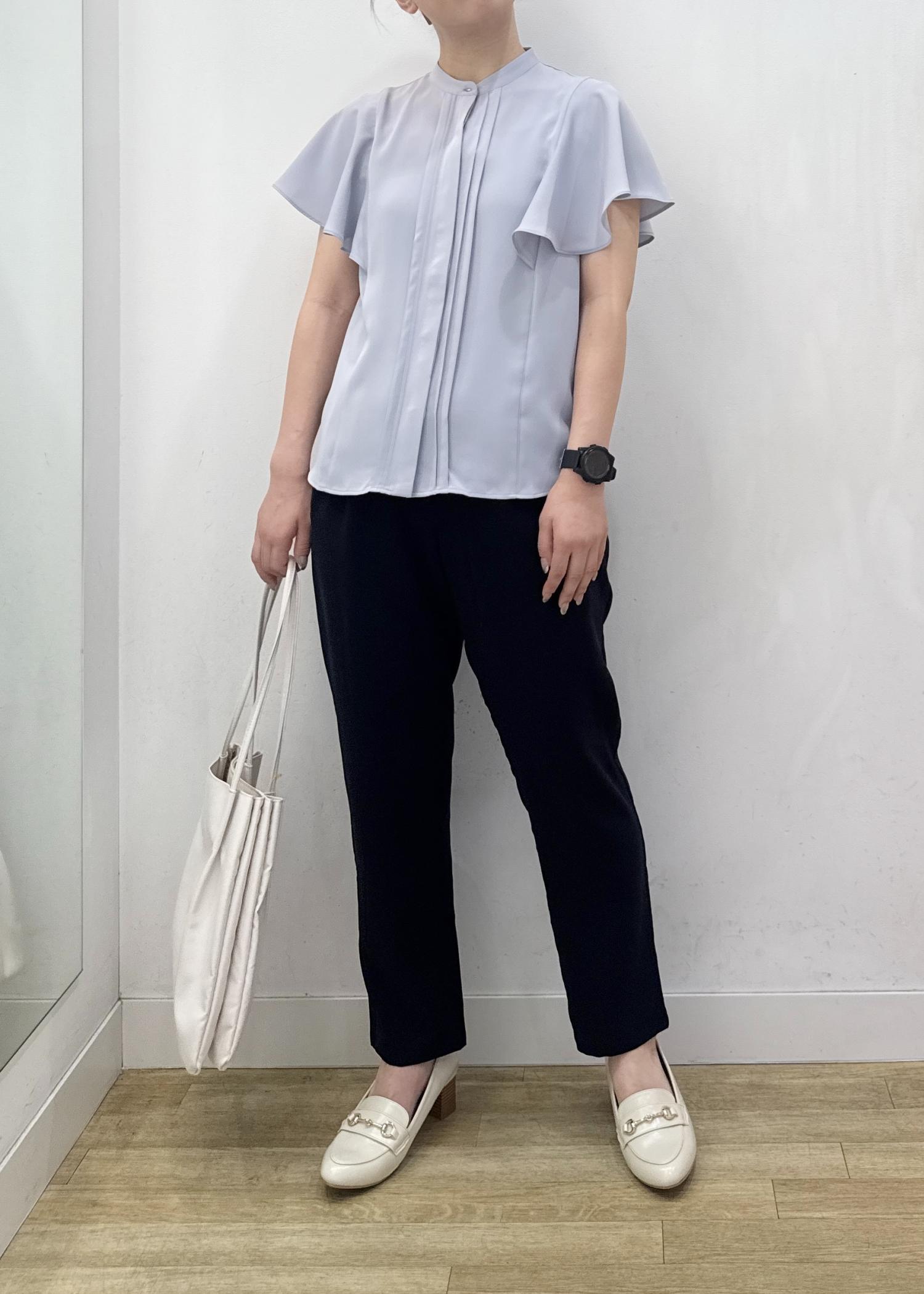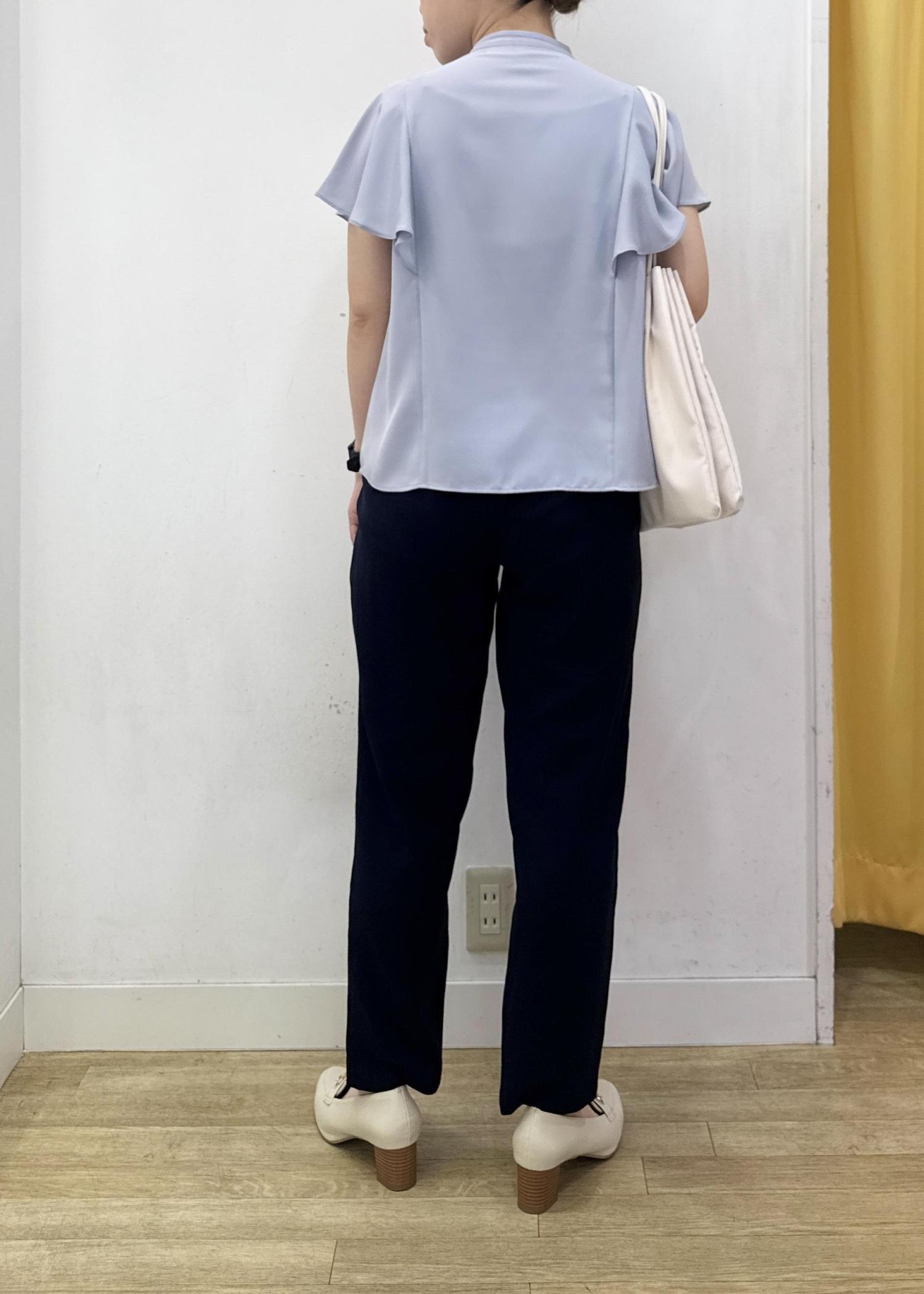 お袖のデザインがステキなブラウスに、ウエストゴムの楽チンパンツを合わせたシンプルスタイルです☺︎