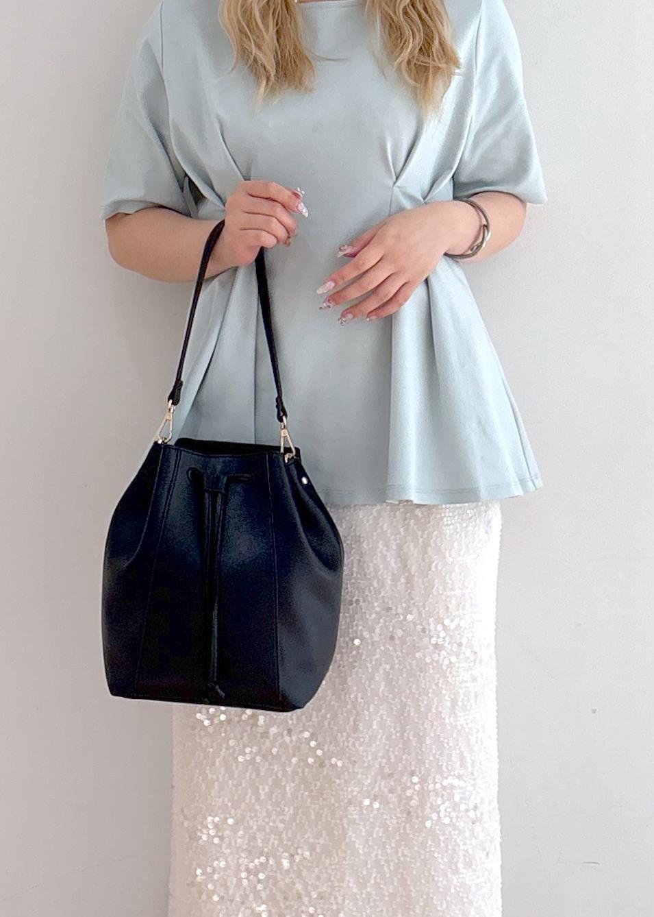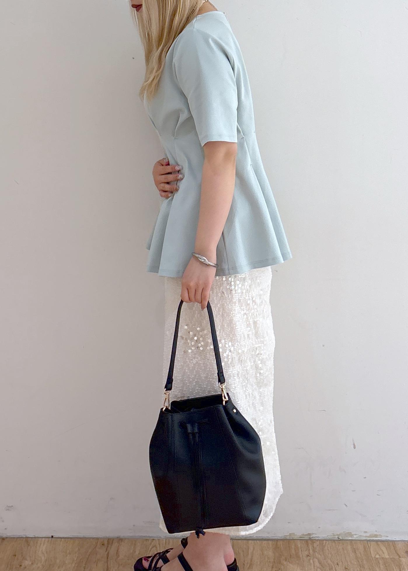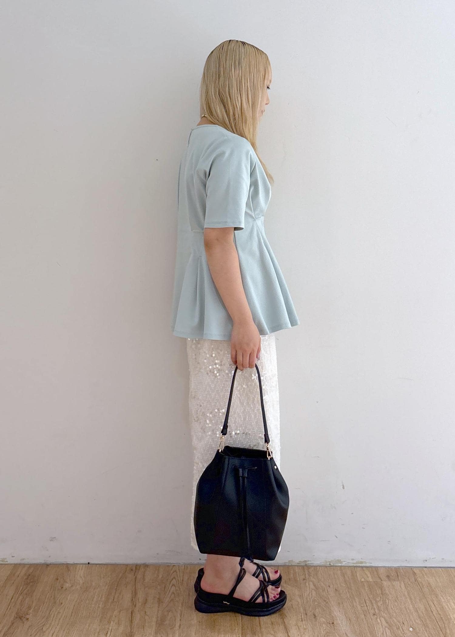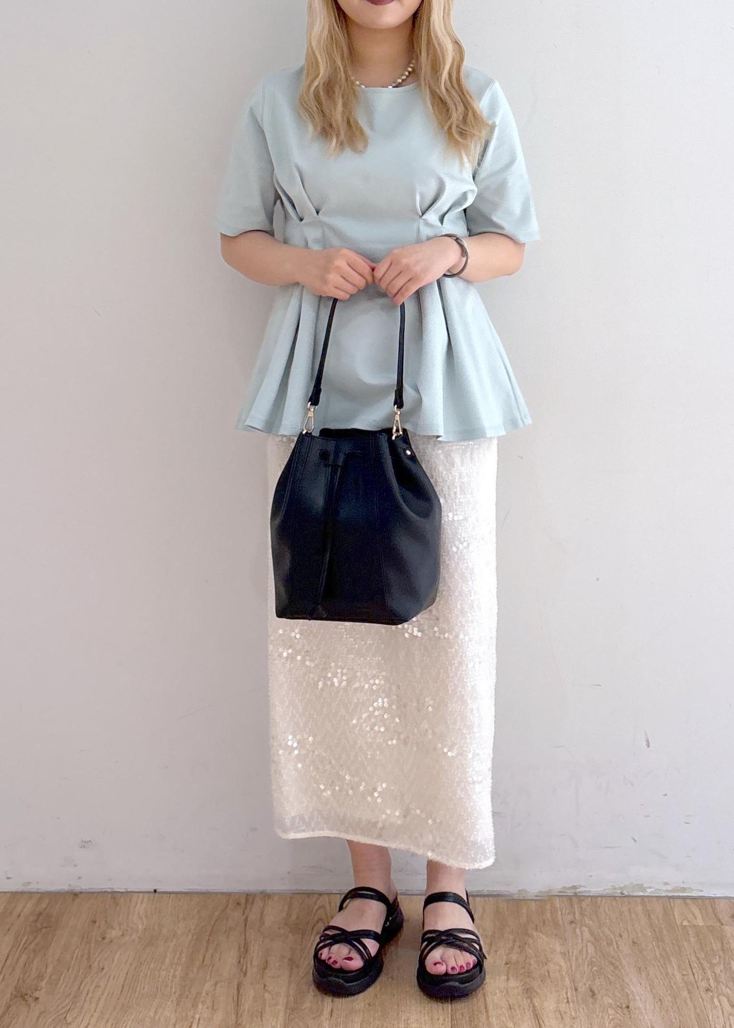 お仕事でも着用いただける今っぽいペプラムトップスと、夏っぽいスパンコールのタイトスカートでスタイリングを組みました♪ プライベートでも着用いただけると思うので、着回ししやすいペプラムトップスです◎