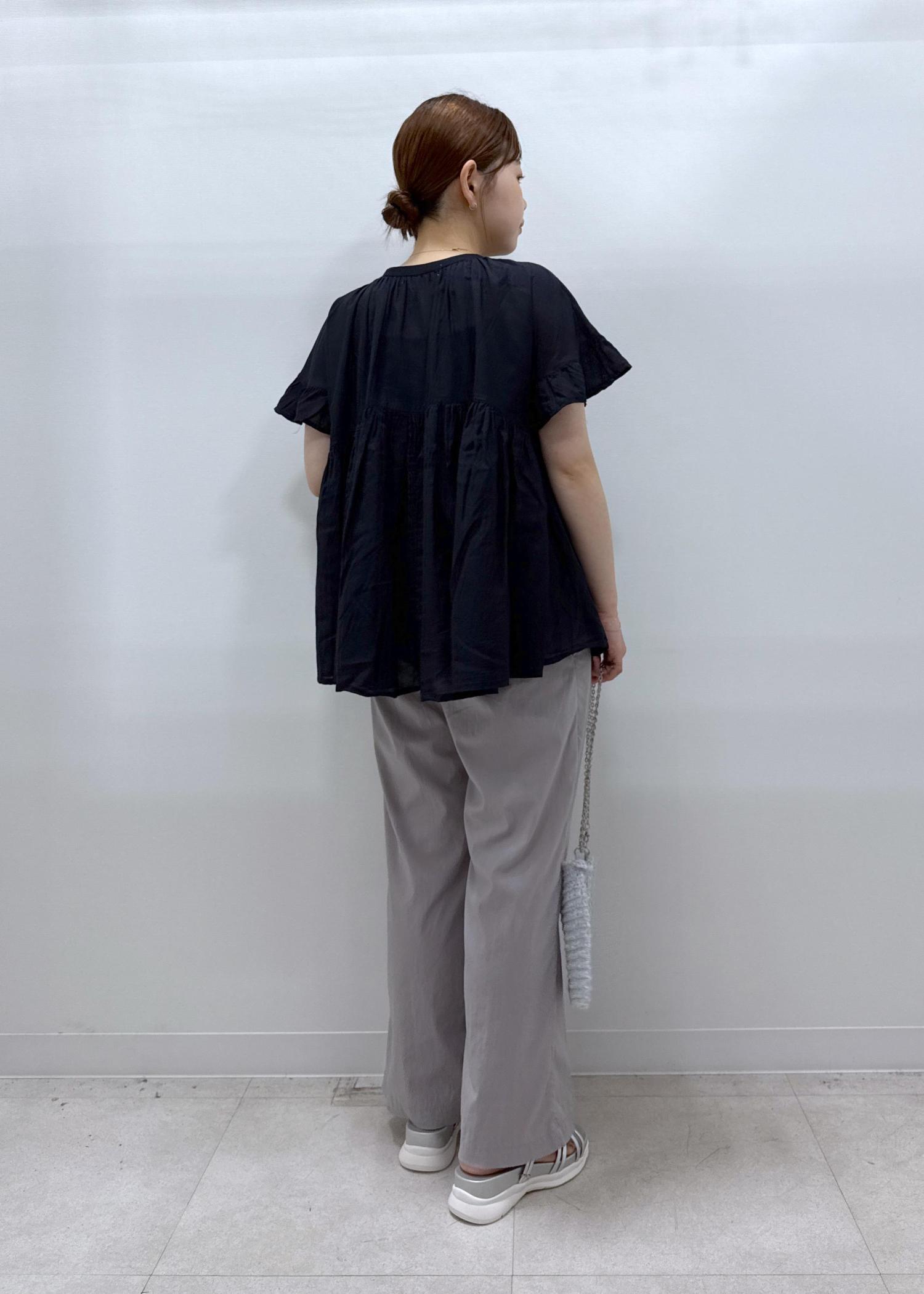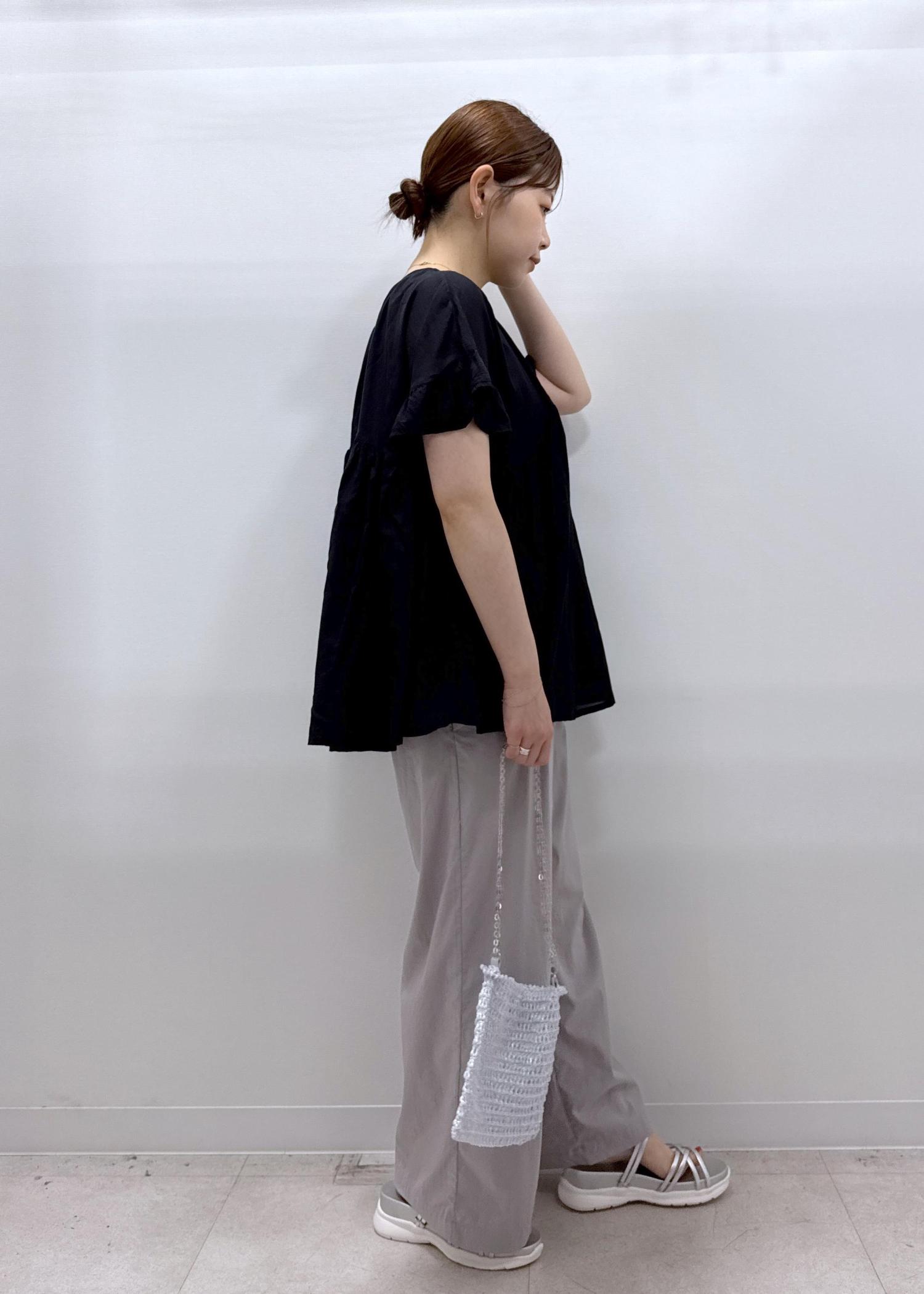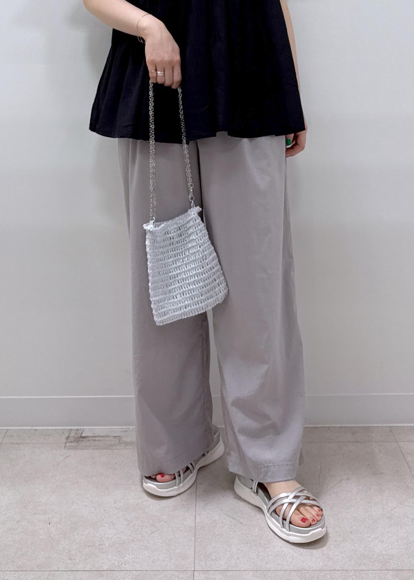 落ち感のある素材なので、ワイドパンツですがスッキリお召しいただけます。 -