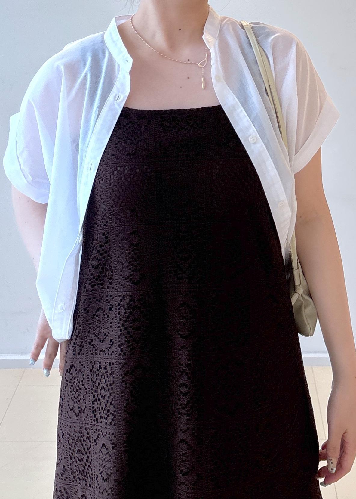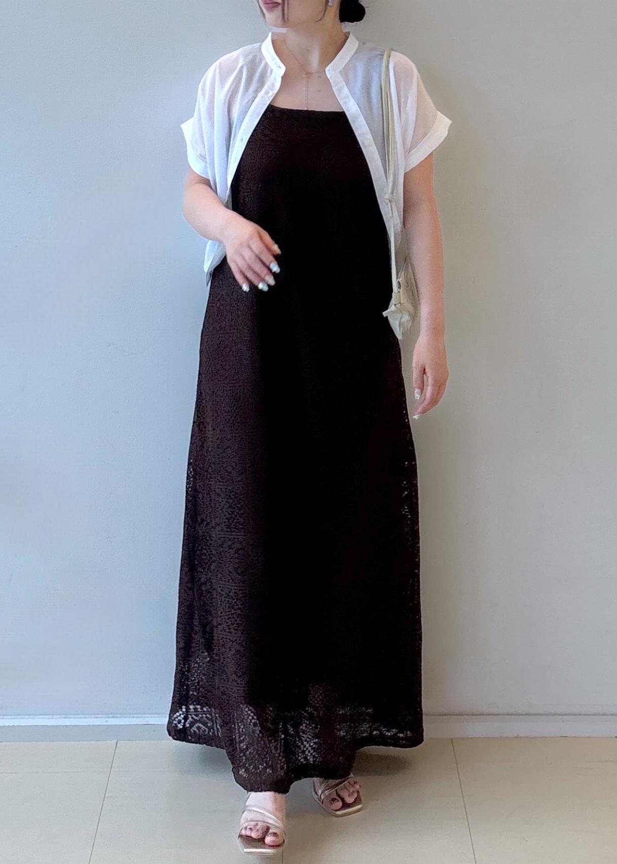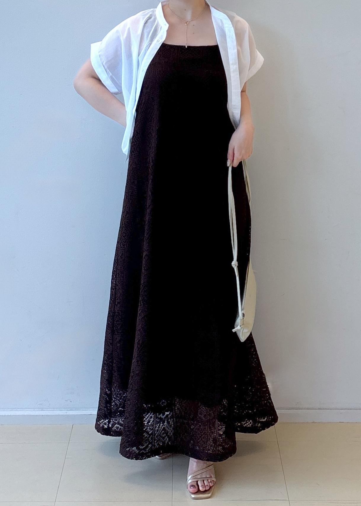 レースのブラウンワンピに、ホワイトのシアーシャツを軽く羽織って、程よい肌見せと透明感をプラス+