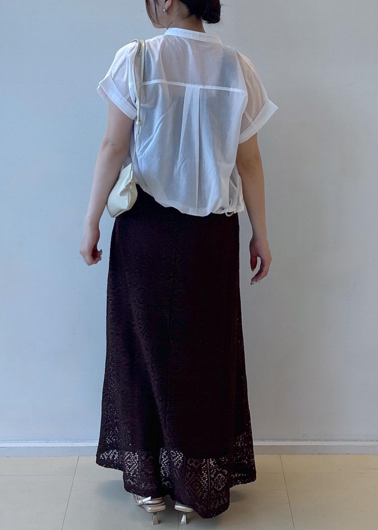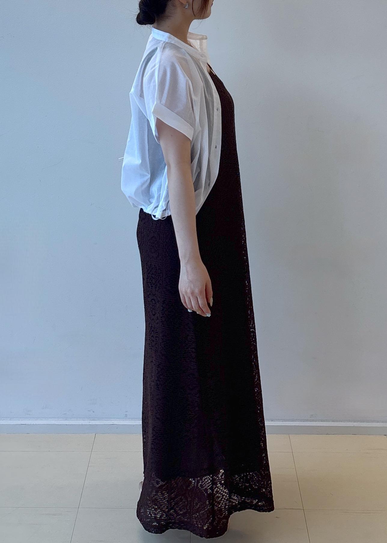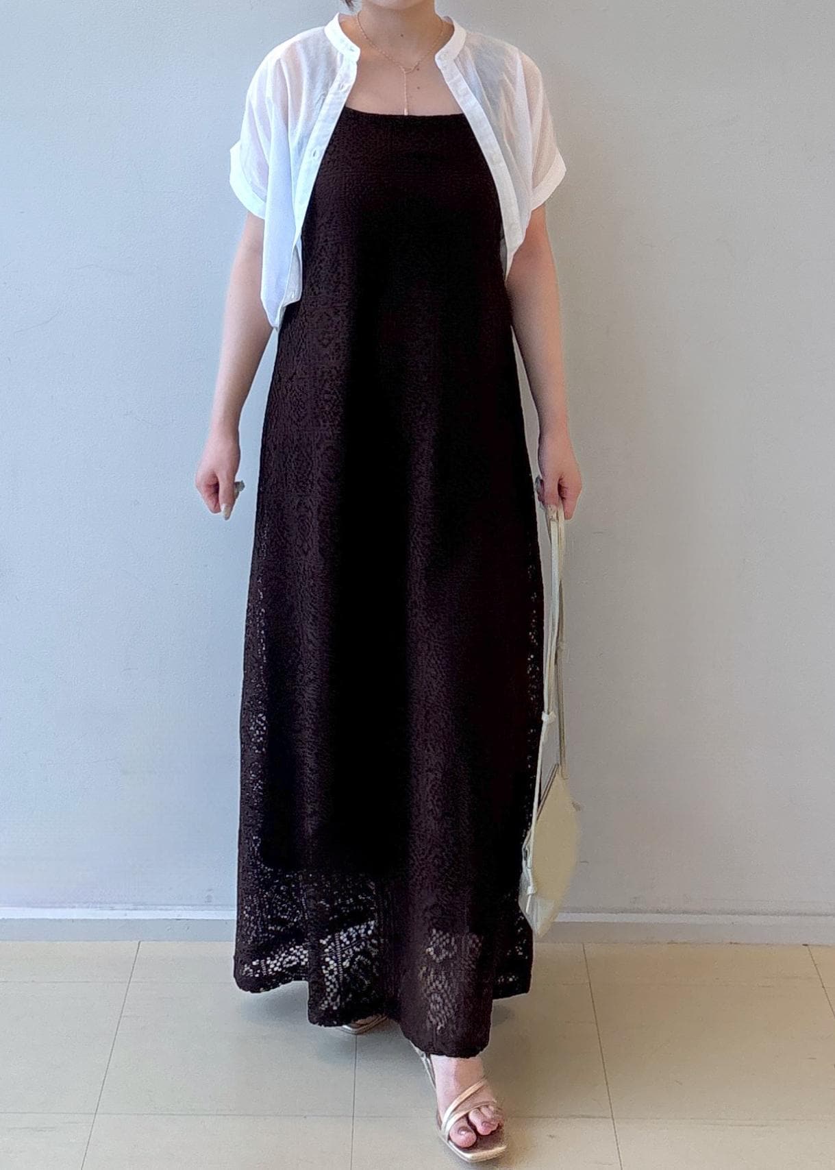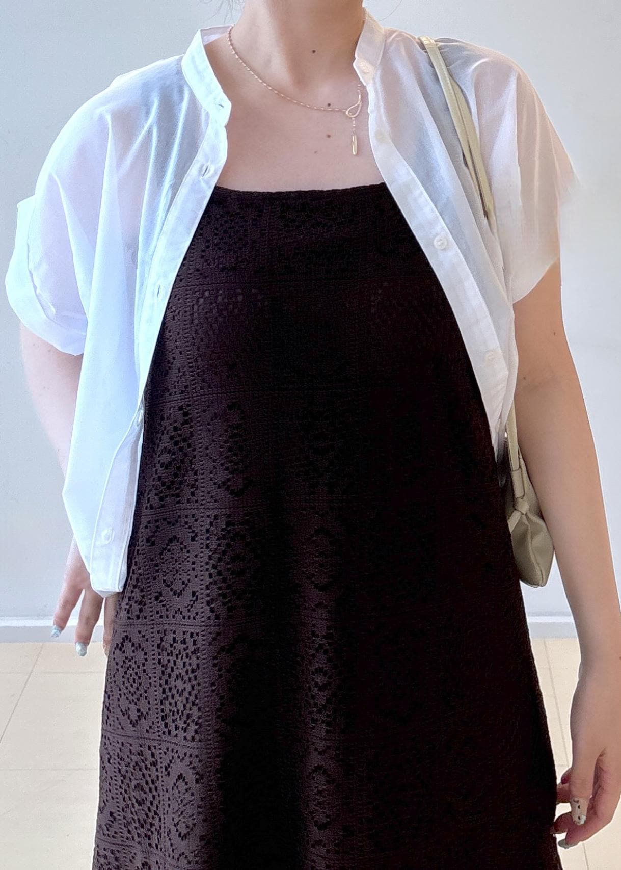 レースのブラウンワンピに、ホワイトのシアーシャツを軽く羽織って、程よい肌見せと透明感をプラス+