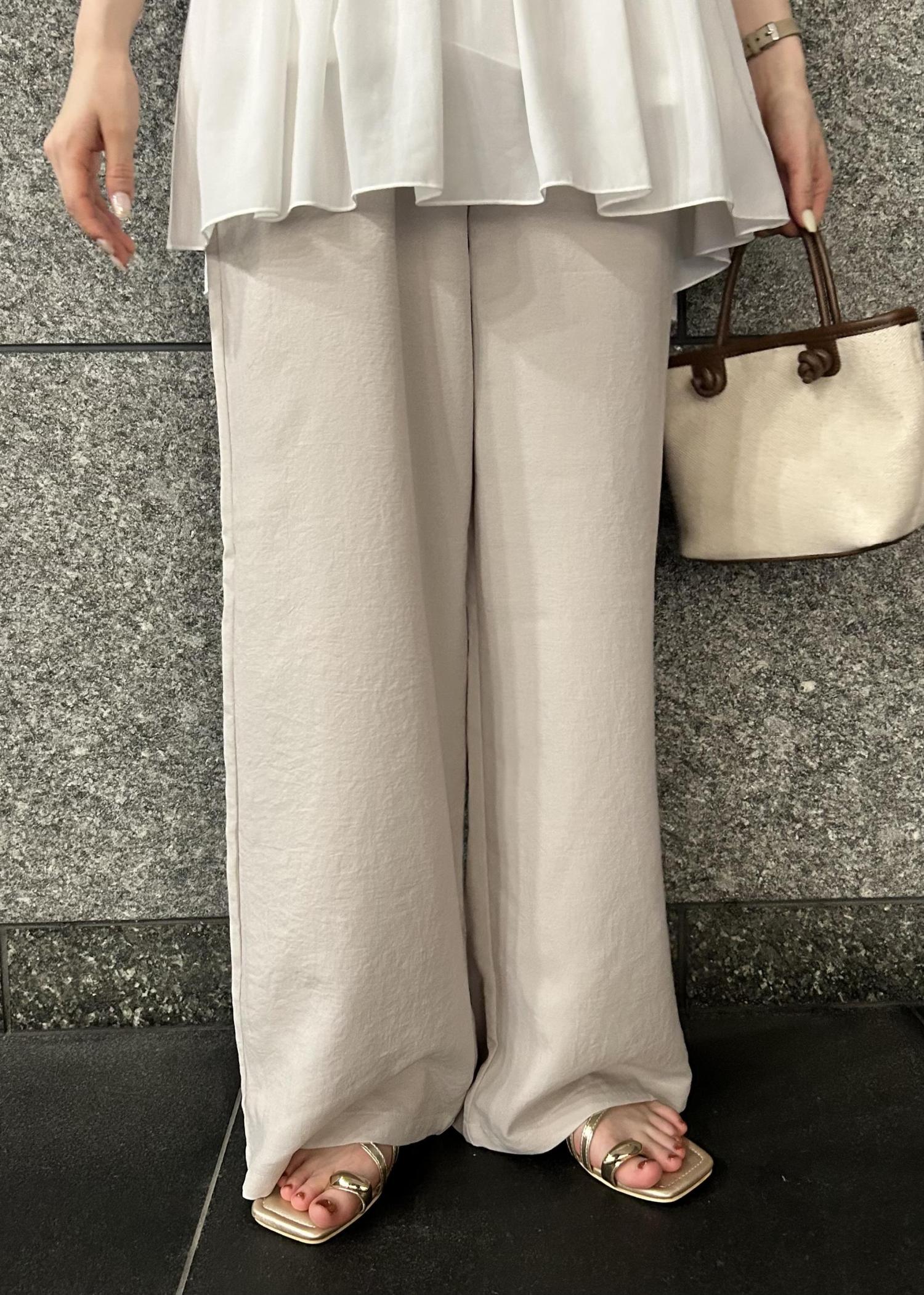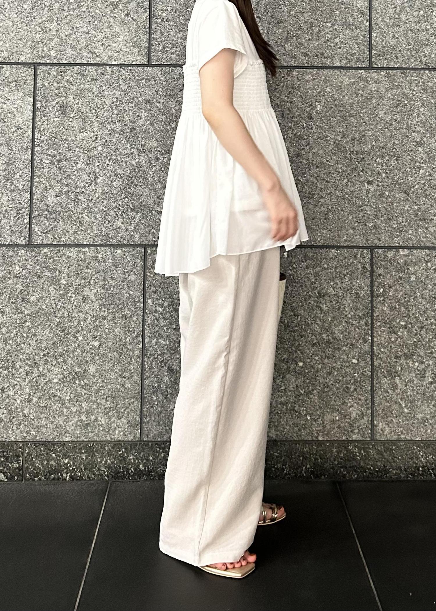 ゆったり楽ちんパンツにギャザーが可愛いトップスを合わせてみました。足元はゴールドで大人さをプラス◎
