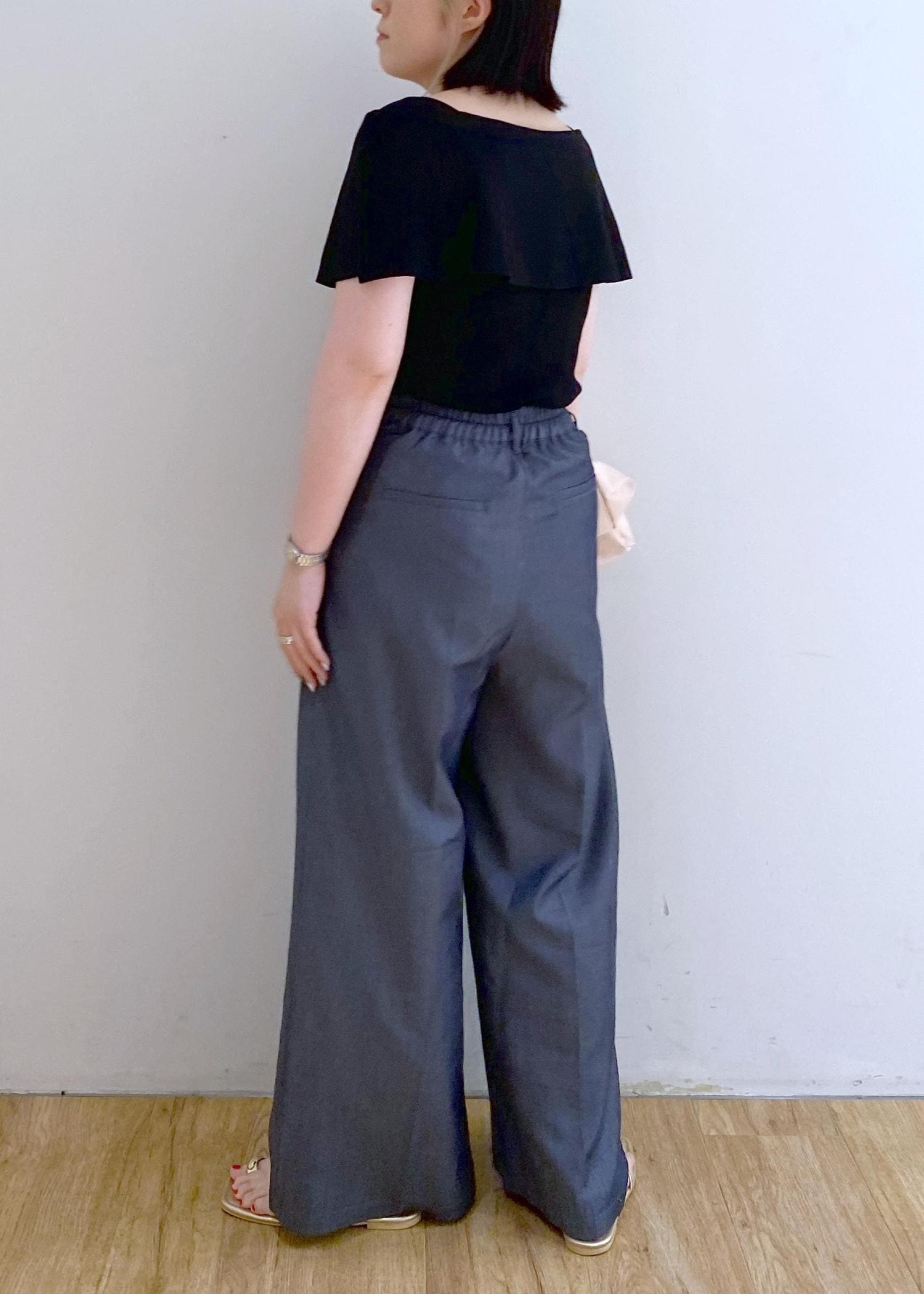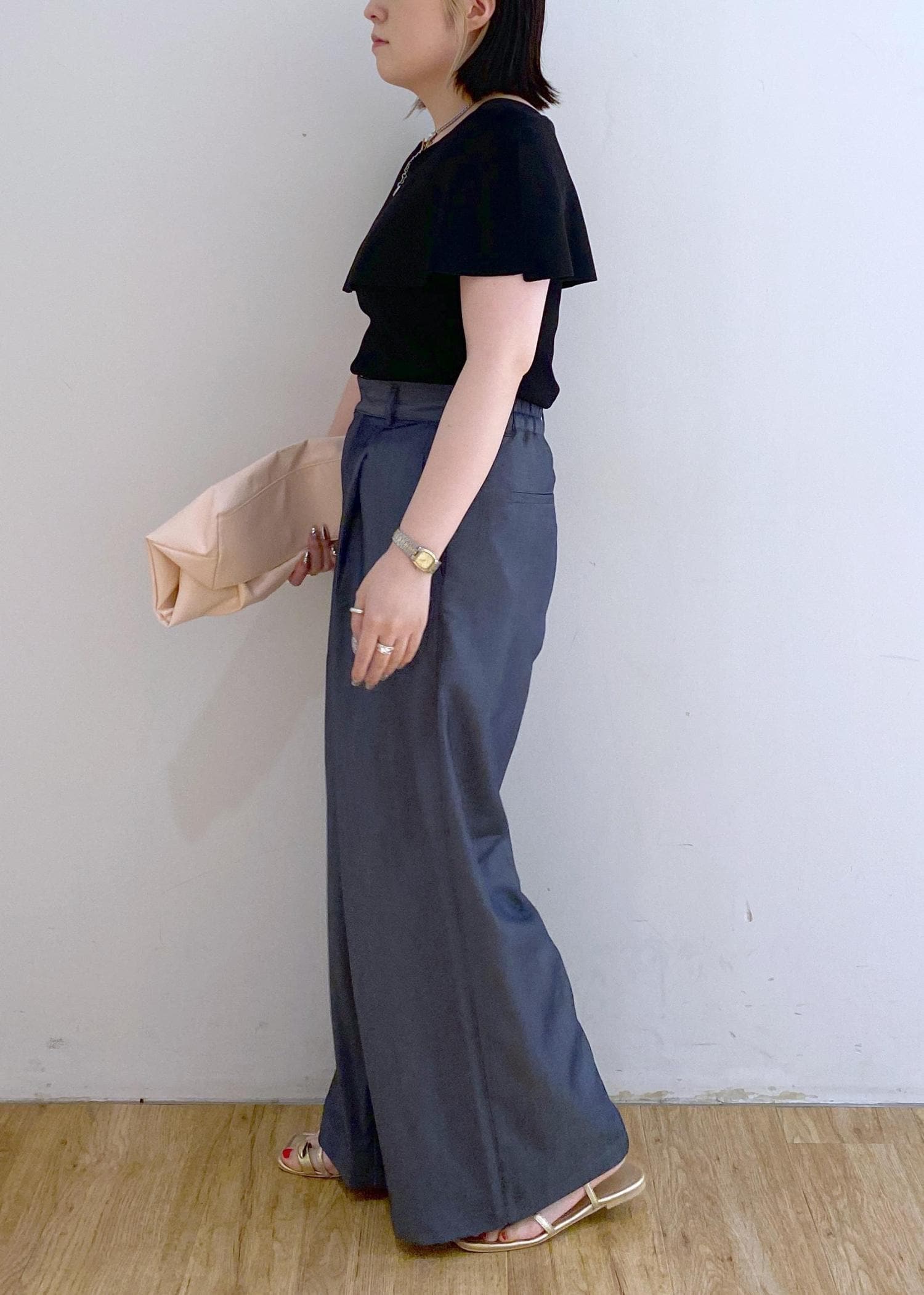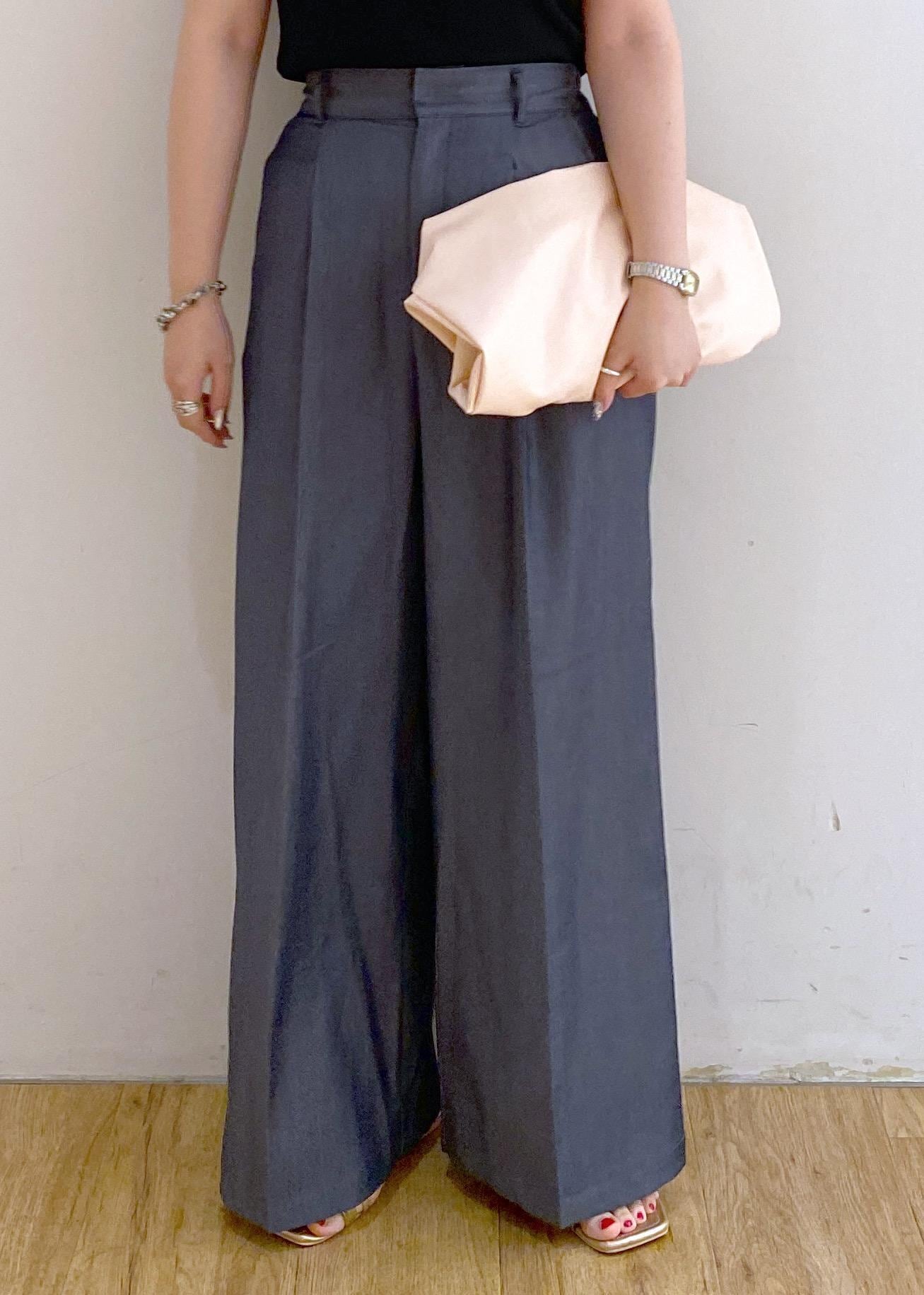 ROPÉ PICNICテンセルシャンブレータックワイドスラックス/通勤対応ネイビー / 38¥6,490レビュー156cmだと38サイズ着用で着丈は少し長めに感じました。ウエストはジャストサイズだったのでヒール合わせで着用するのがオススメです◎