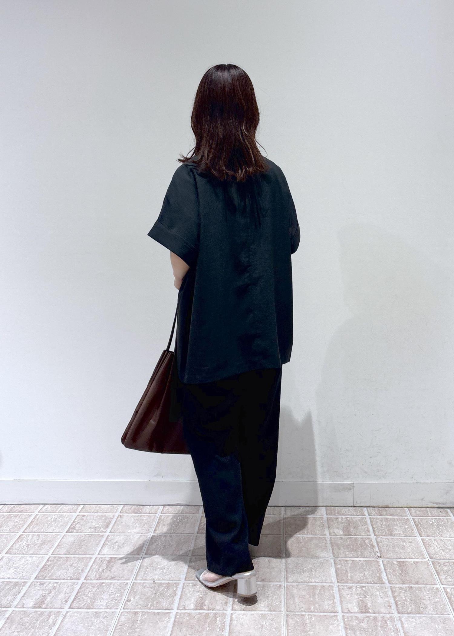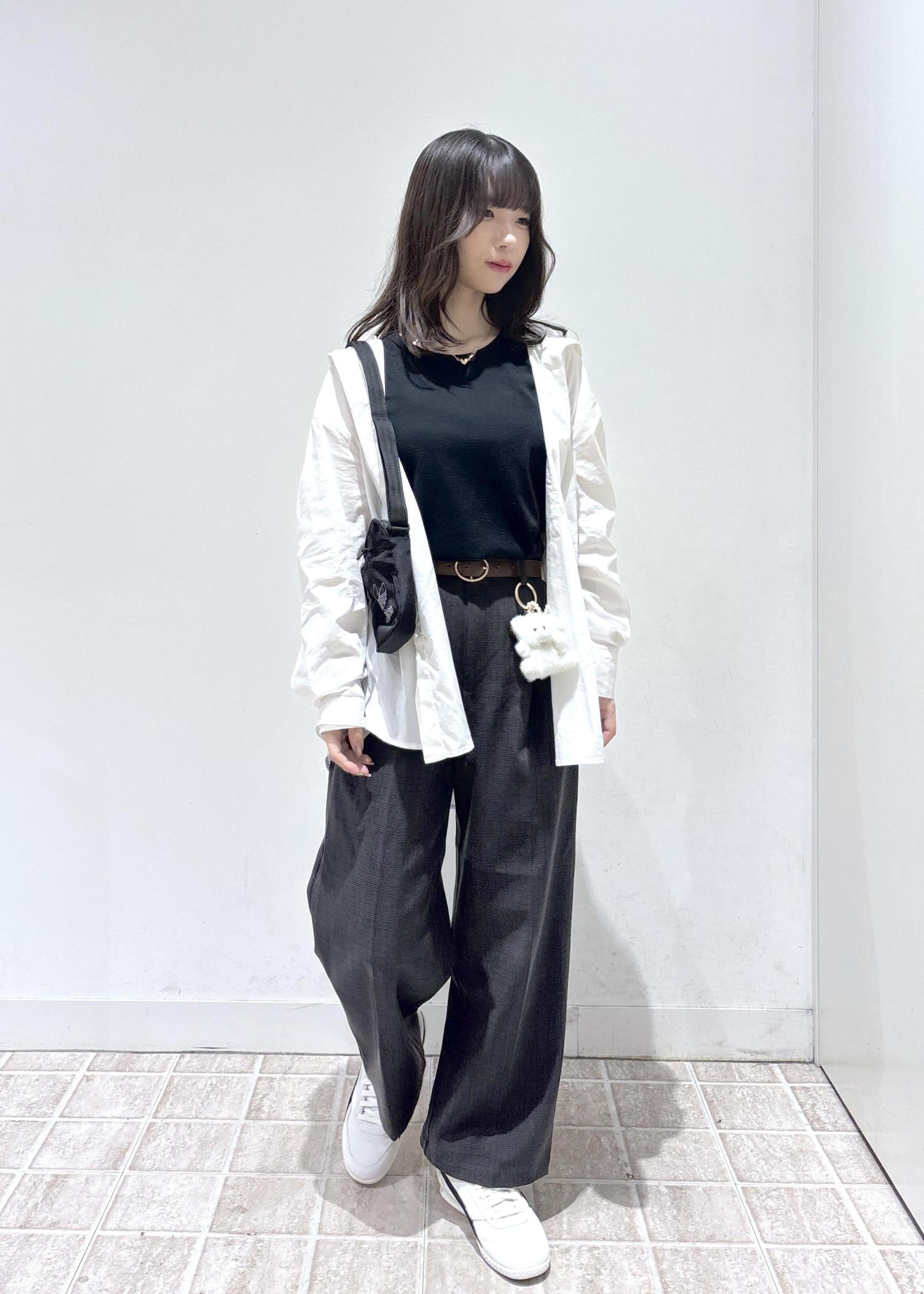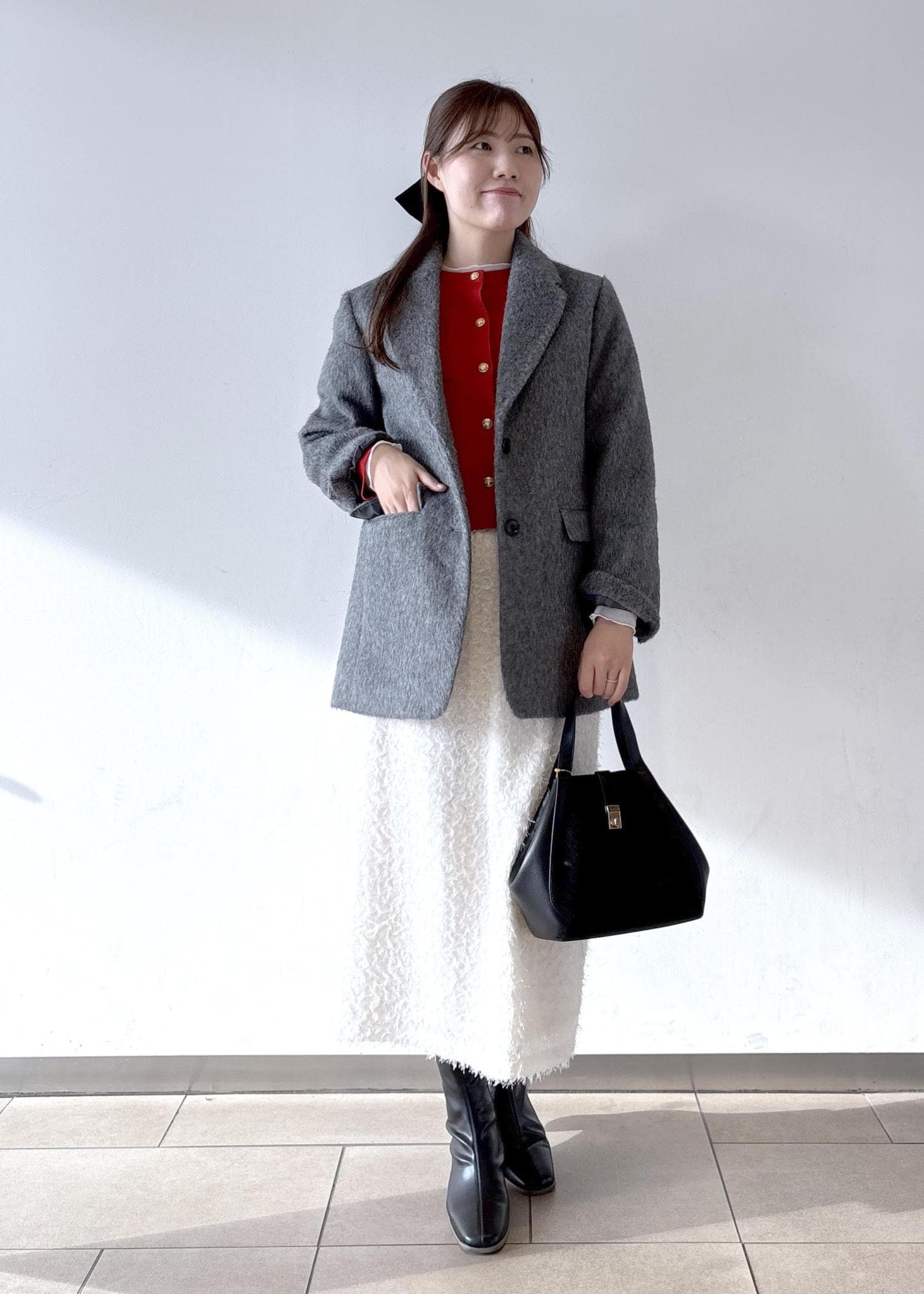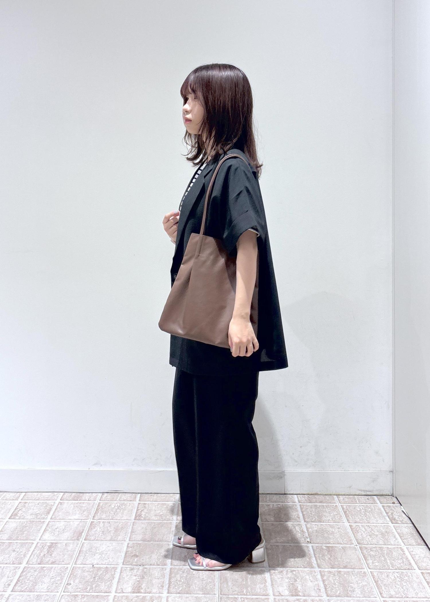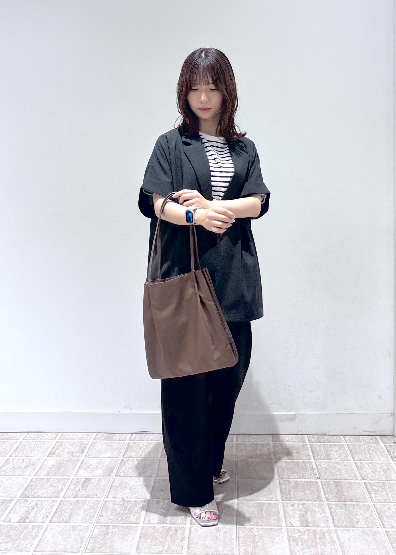 軽い素材感と真っ黒ではないチャコールなので、重たい印象になりすぎず着ていただけます。