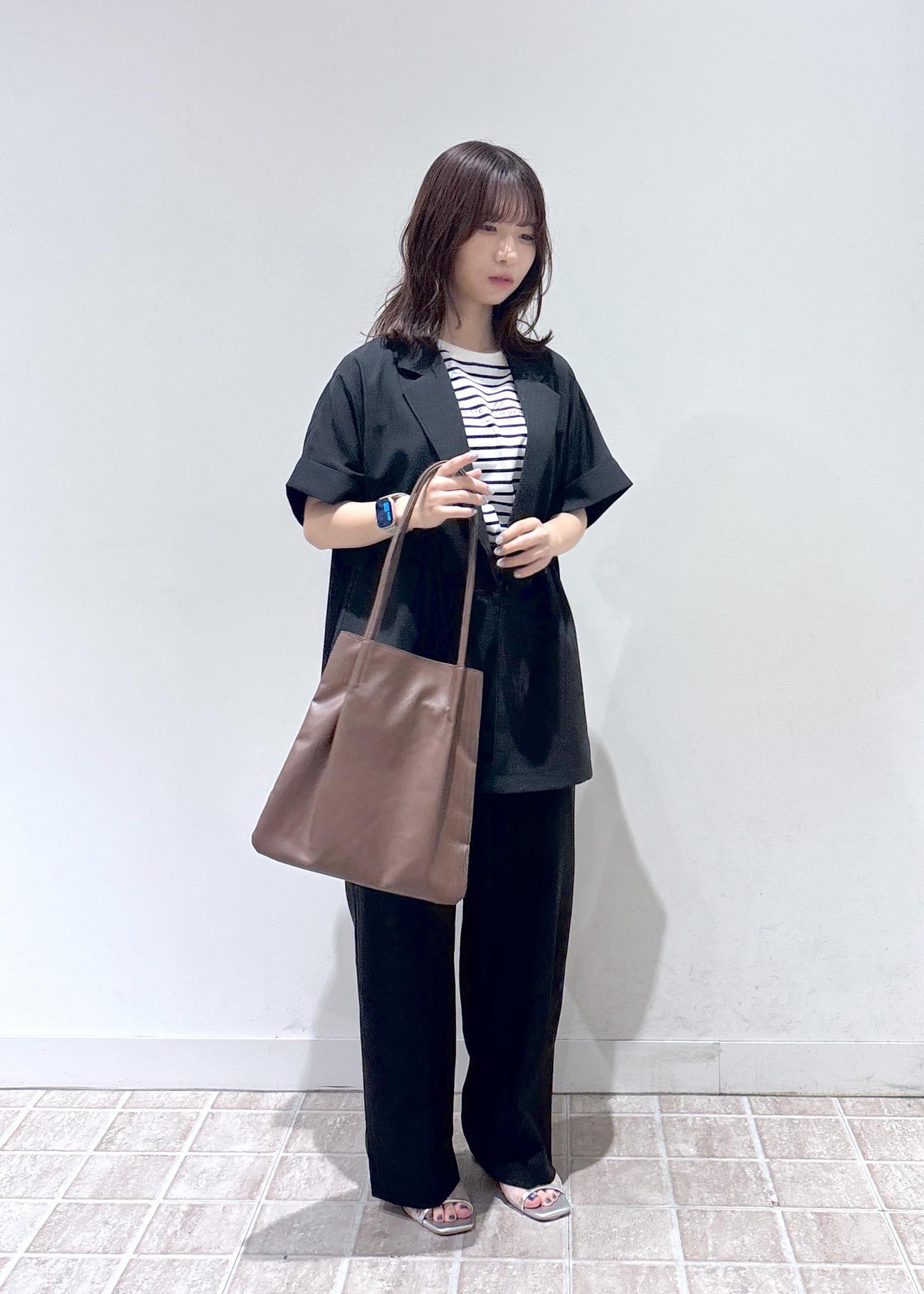 お仕事にも、少しちゃんとしたい時にも、普段着用にも、どんな時でも使いやすい人気のセットアップを使用したコーディネートです。