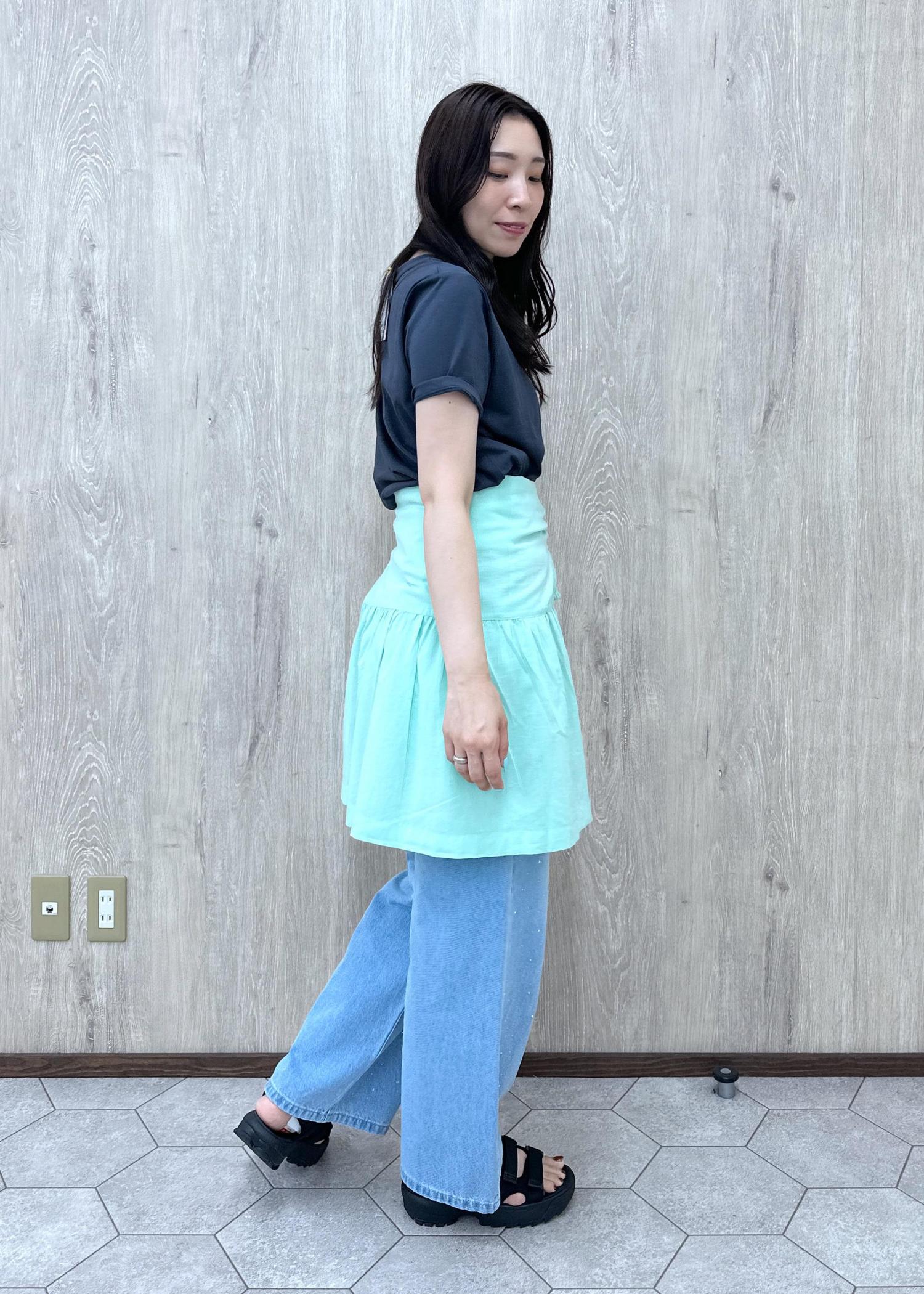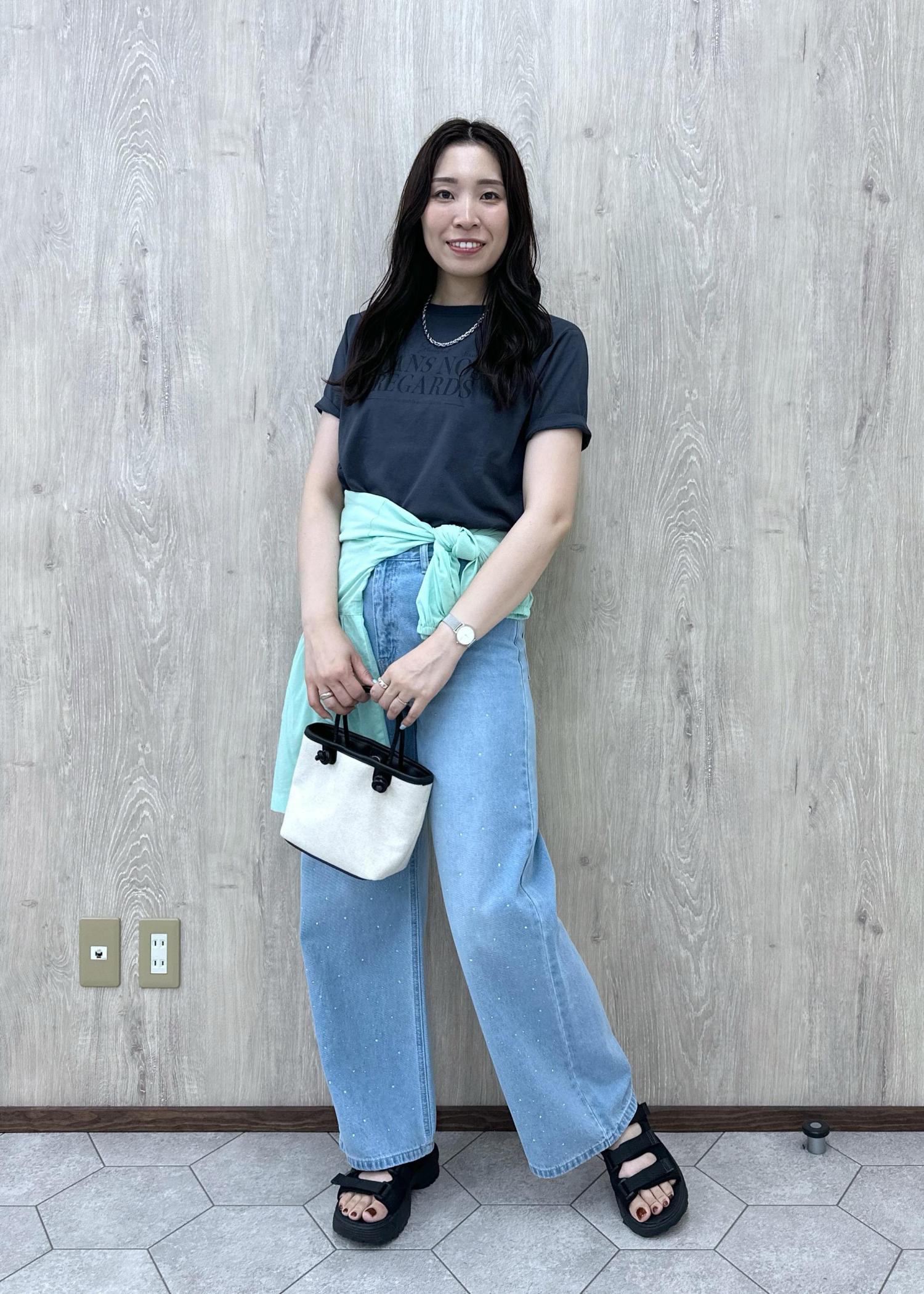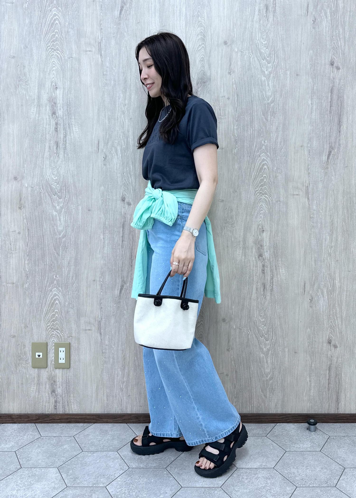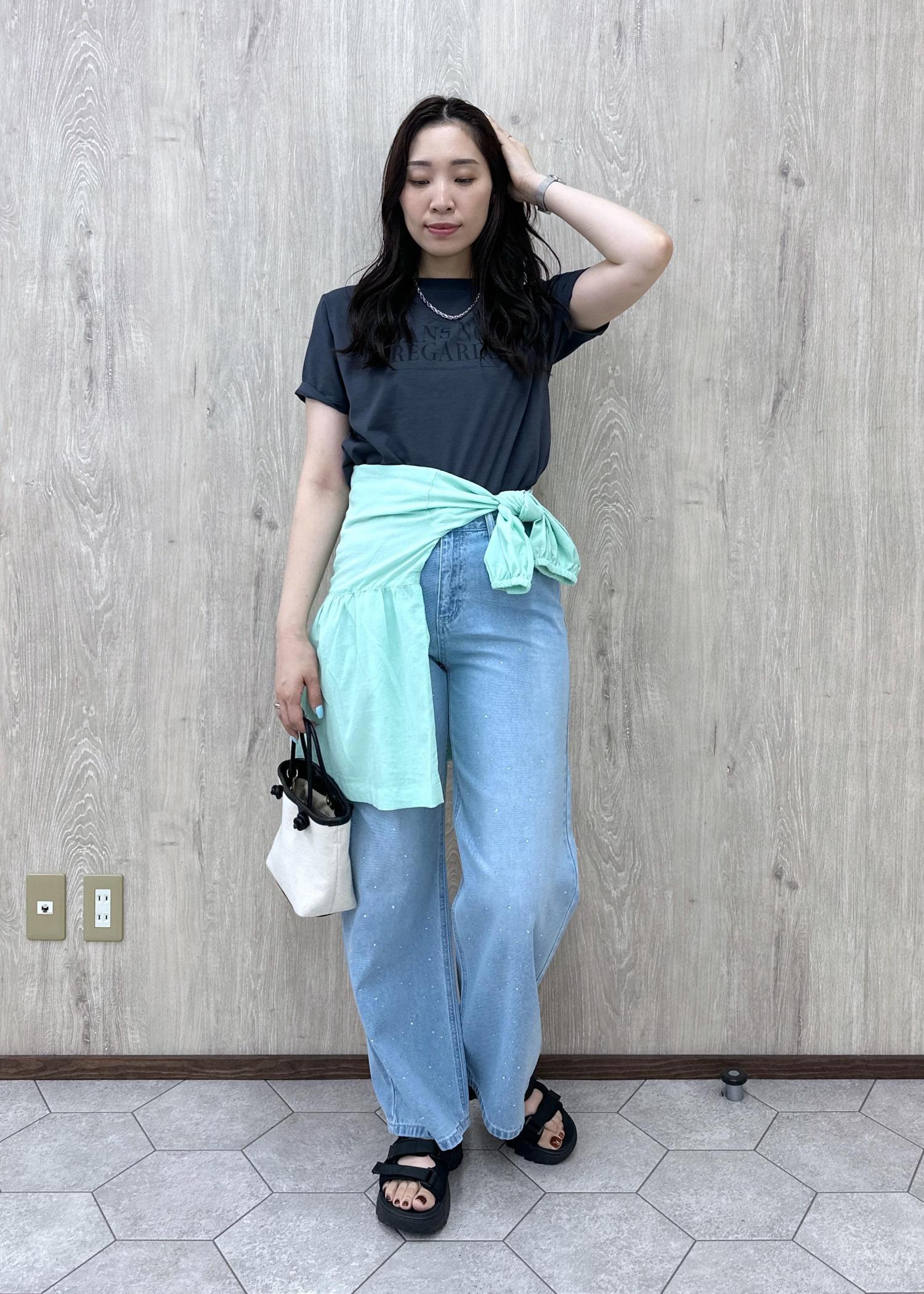 夏らしい薄いカラーのデニムにカラーシャツを腰巻きして