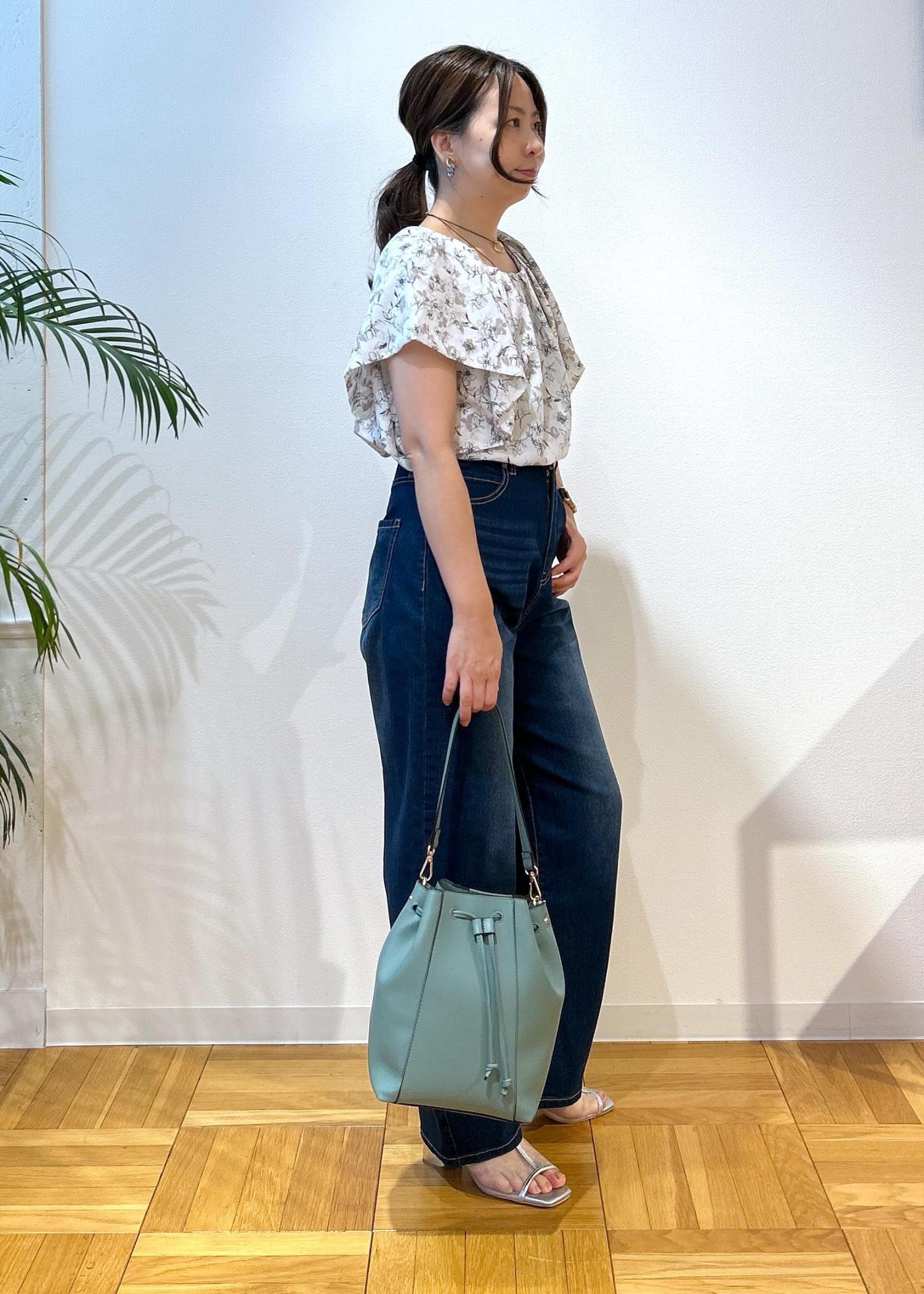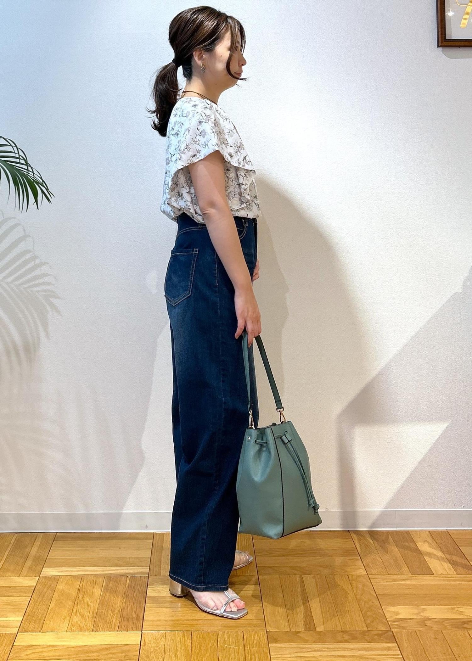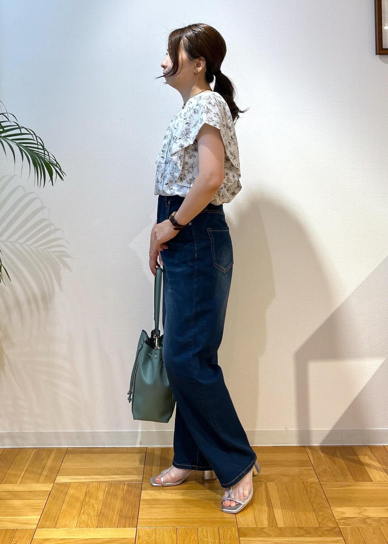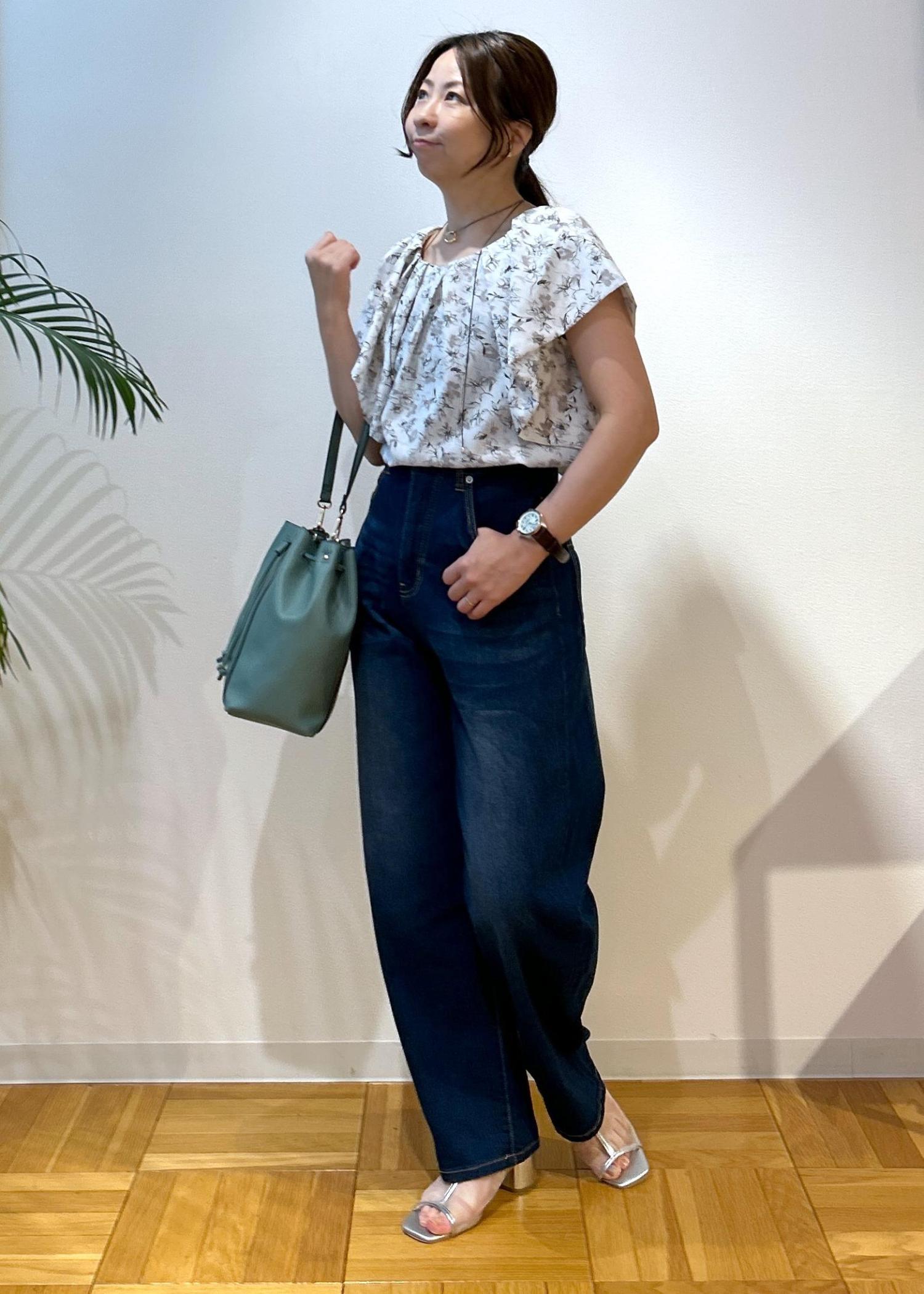 キレイめの通勤にも使えるブラウスを普段着としてコーディネートしました。デニムで気取らずにラフにしましたが、ラッフルフリルの袖が華やかさを出してくれてるのがポイントです。
