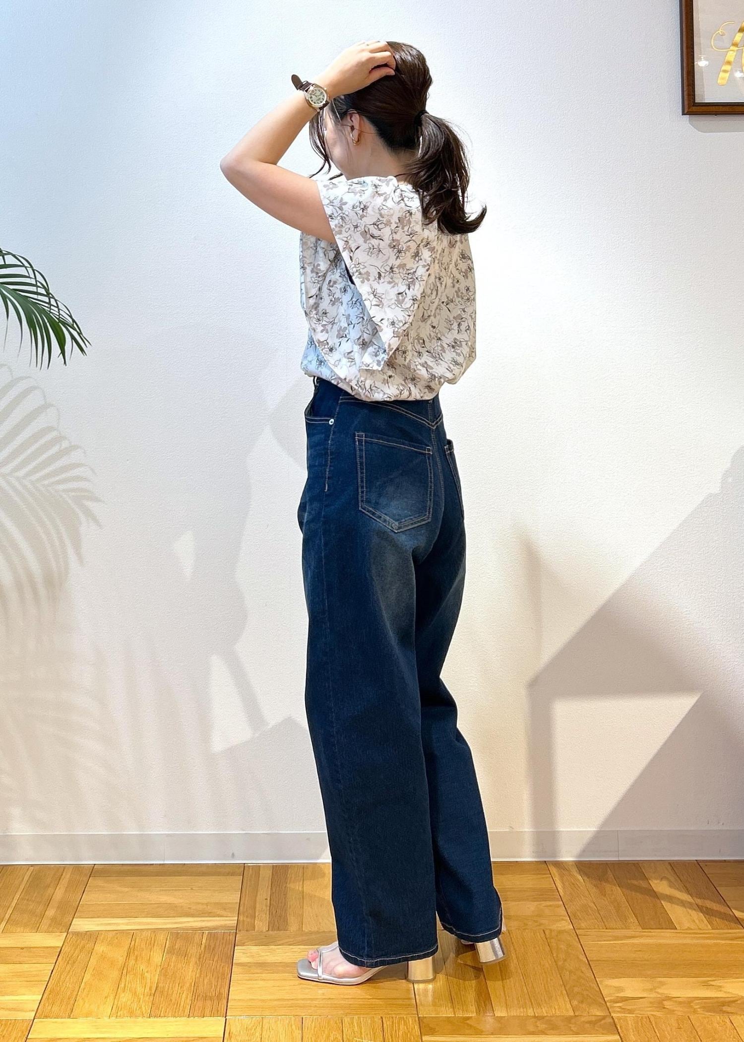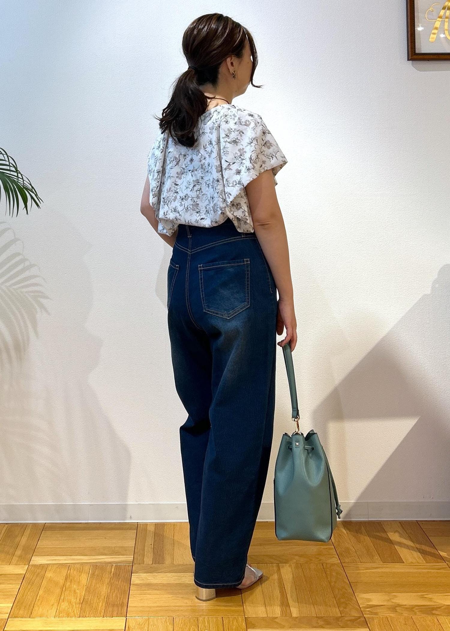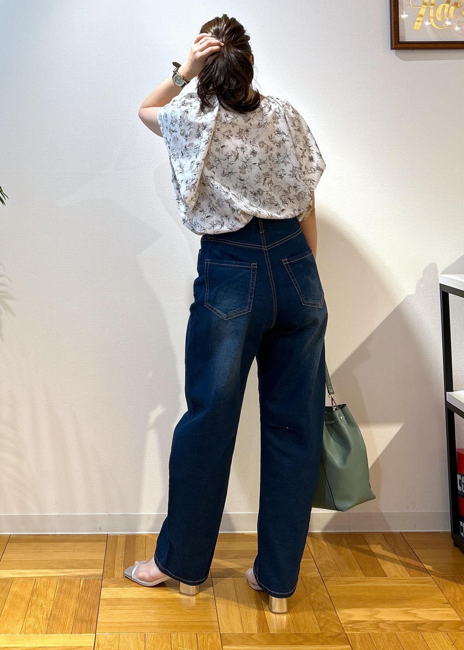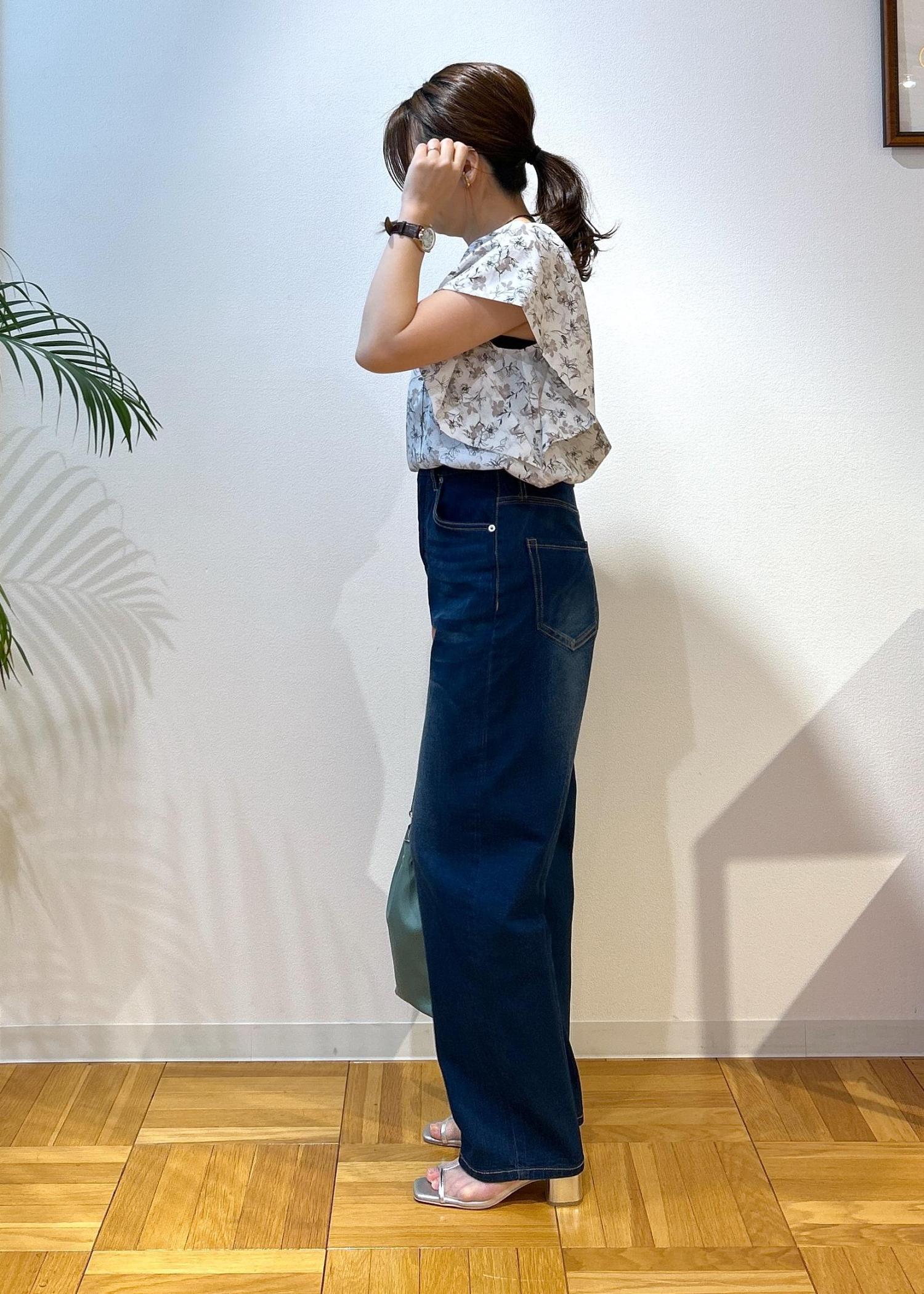 キレイめの通勤にも使えるブラウスを普段着としてコーディネートしました。デニムで気取らずにラフにしましたが、ラッフルフリルの袖が華やかさを出してくれてるのがポイントです。