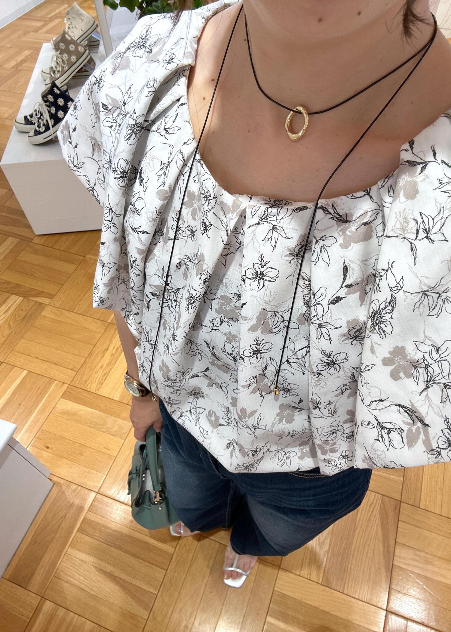 ボリュームのある袖がふんわり動く感じが可愛いです。首周りも程よく空いているので鎖骨ラインをキレイに見せてくれます。とっても軽やかで風通しが良いアイテムです。