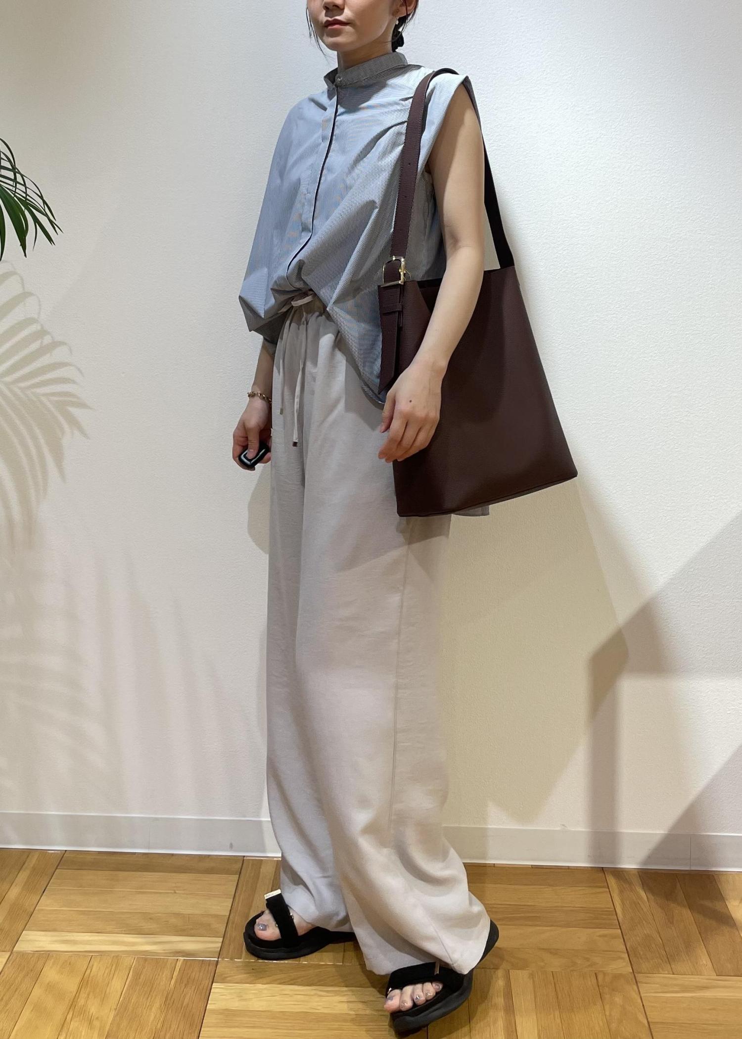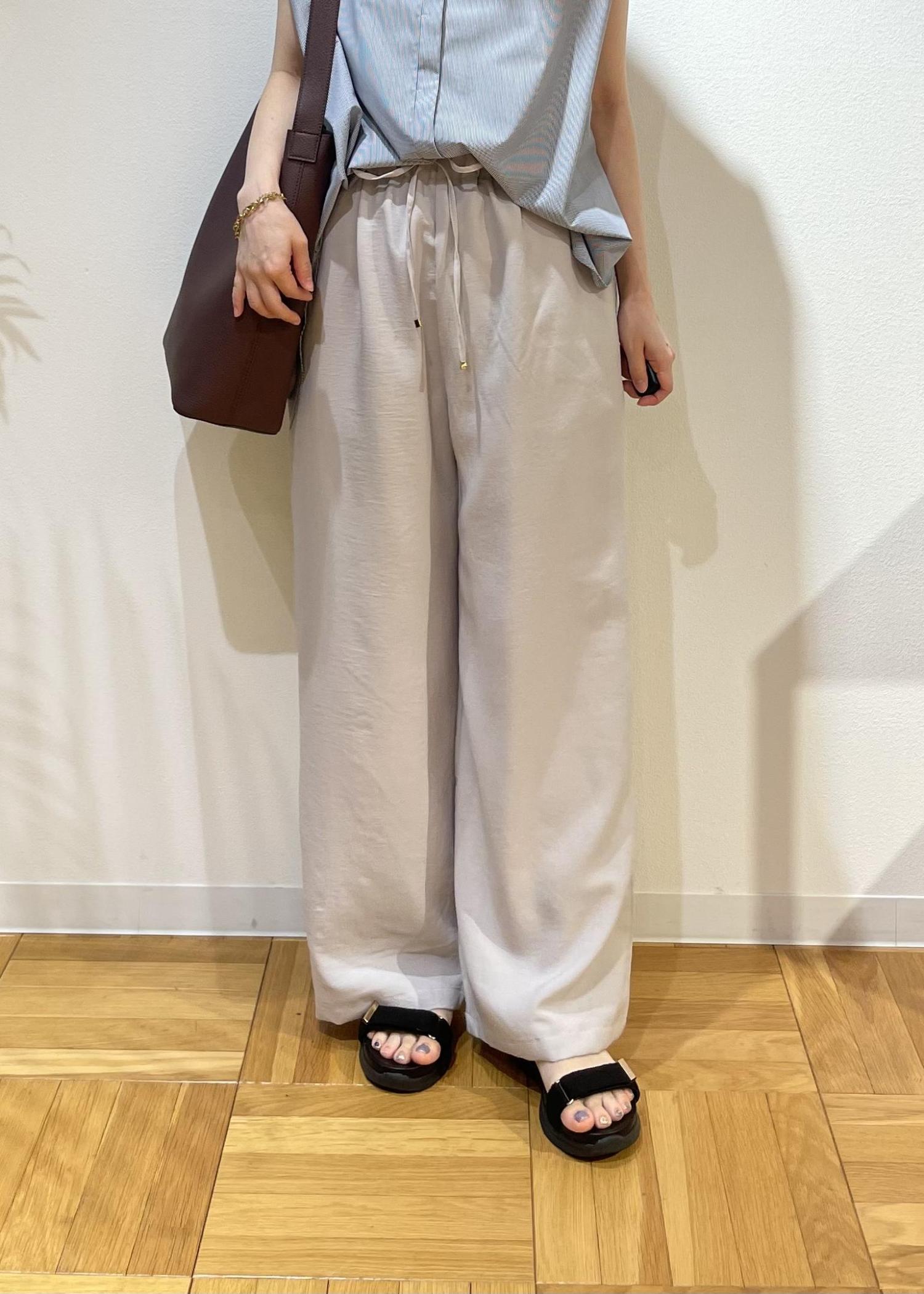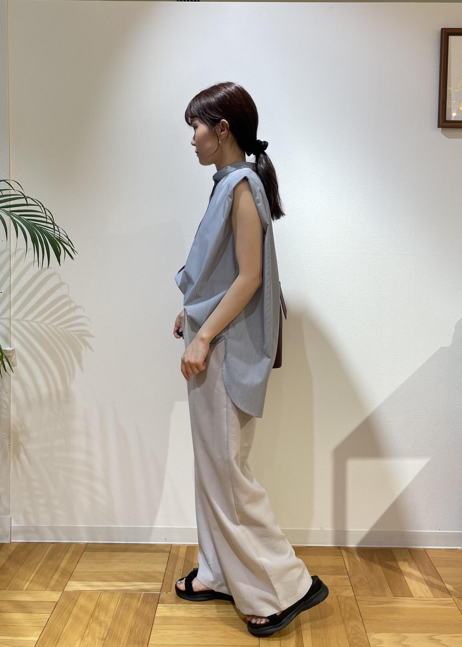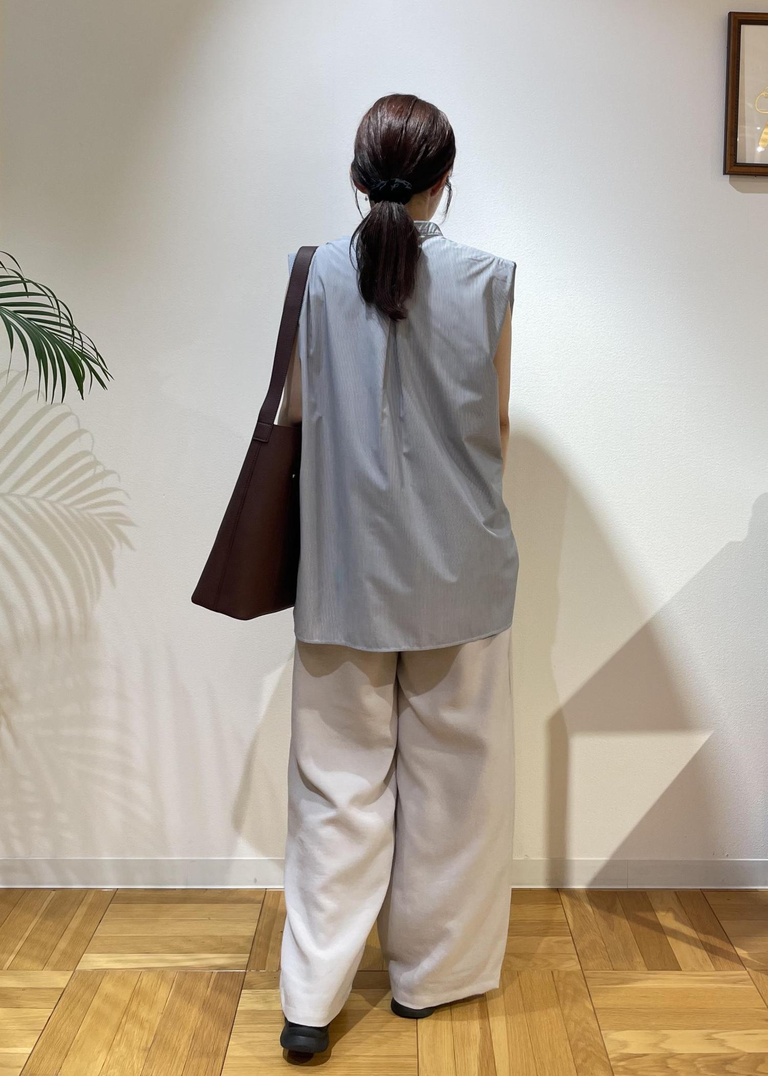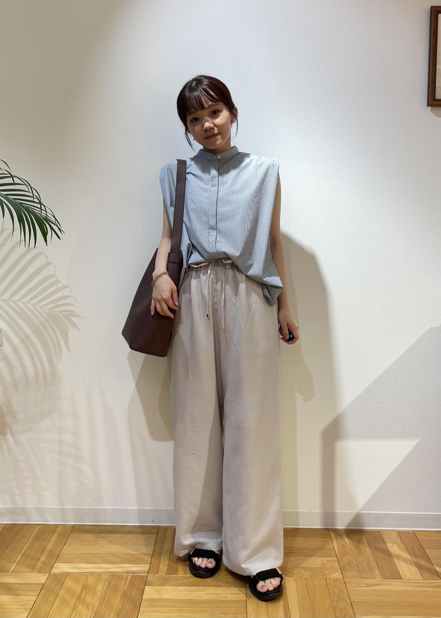 ストライプノースリーブシャツとベージュのワイドパンツコーデ