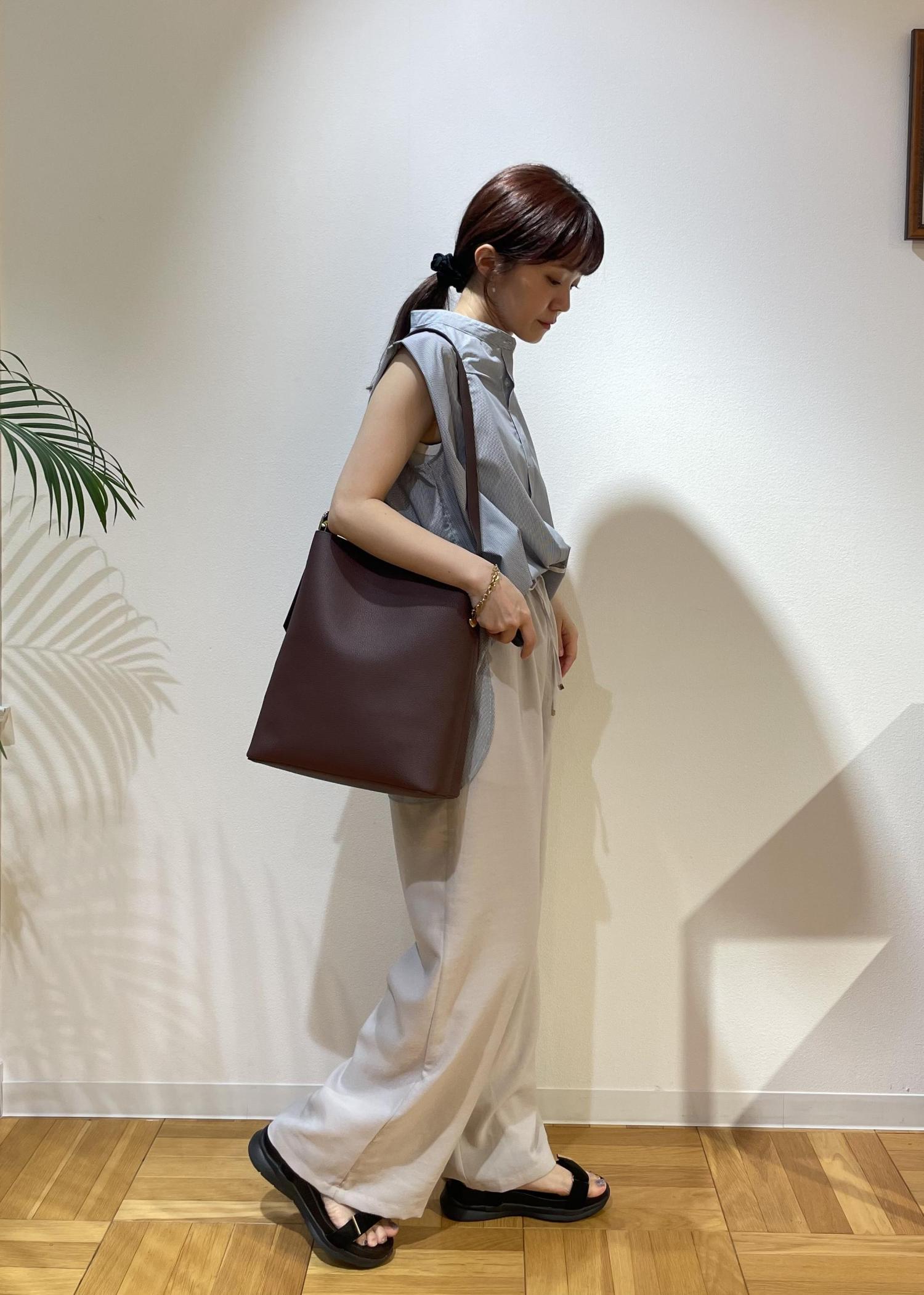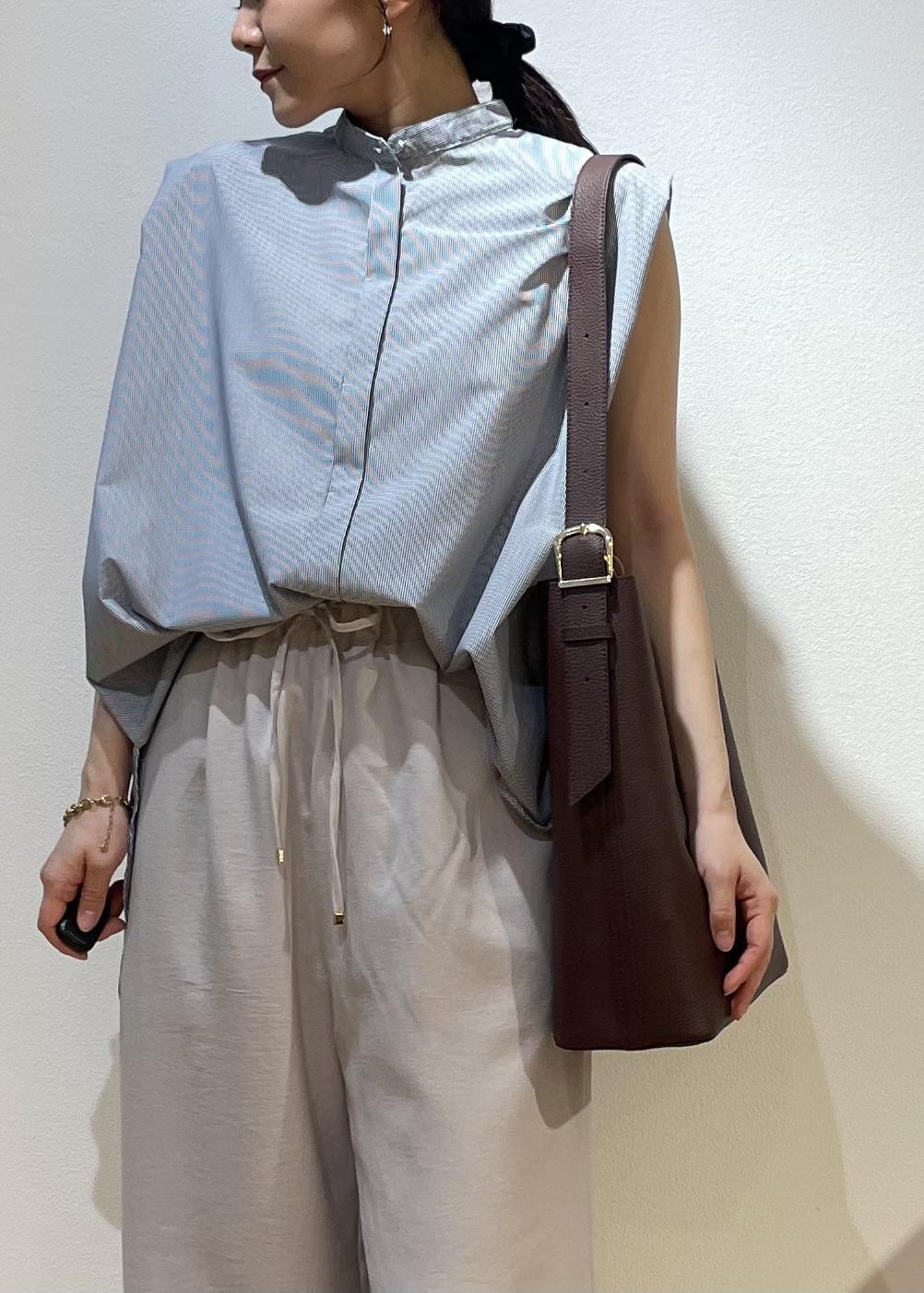 夏らしい青のストライプシャツと履き心地抜群なワイドパンツを合わせました。どちらも接触冷感なので暑い時期にぴったりです。