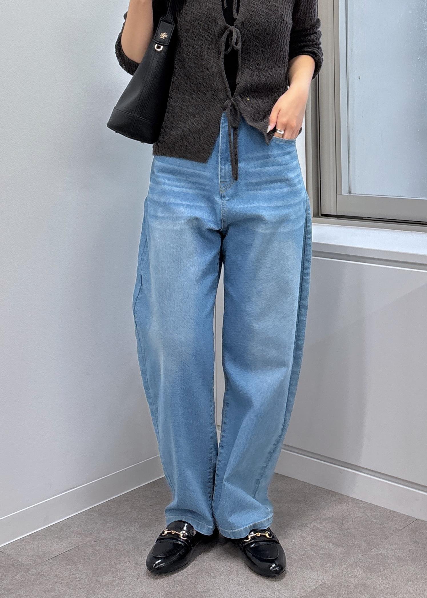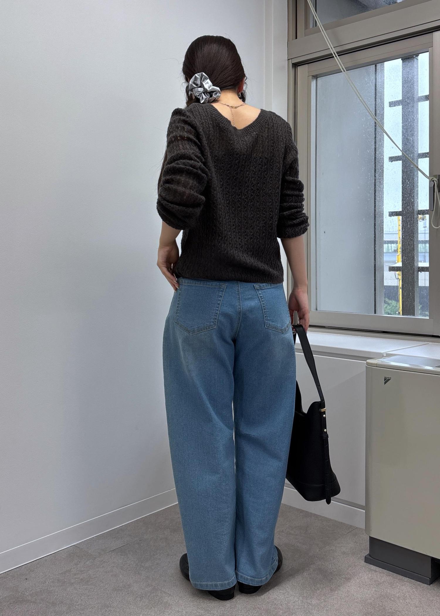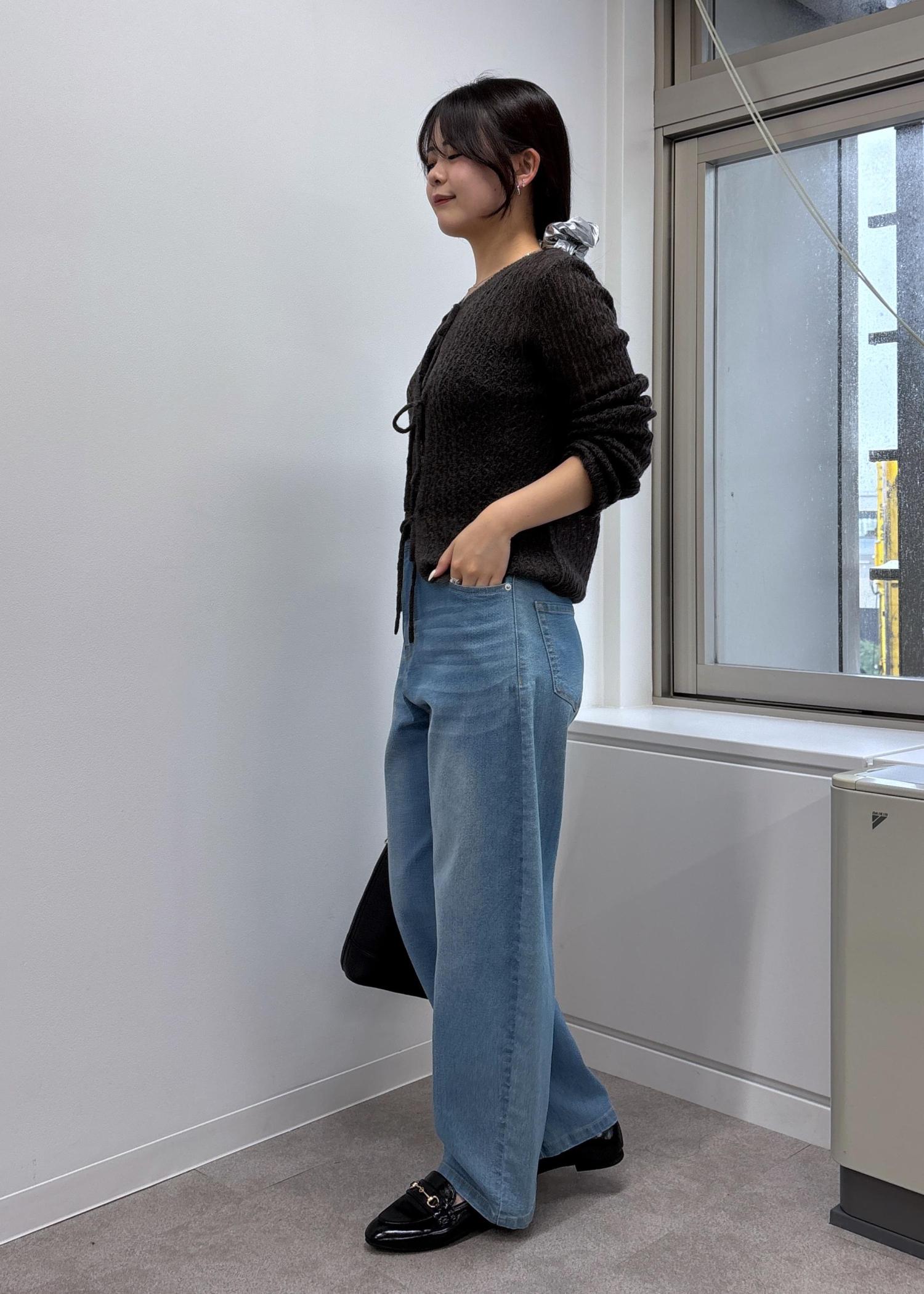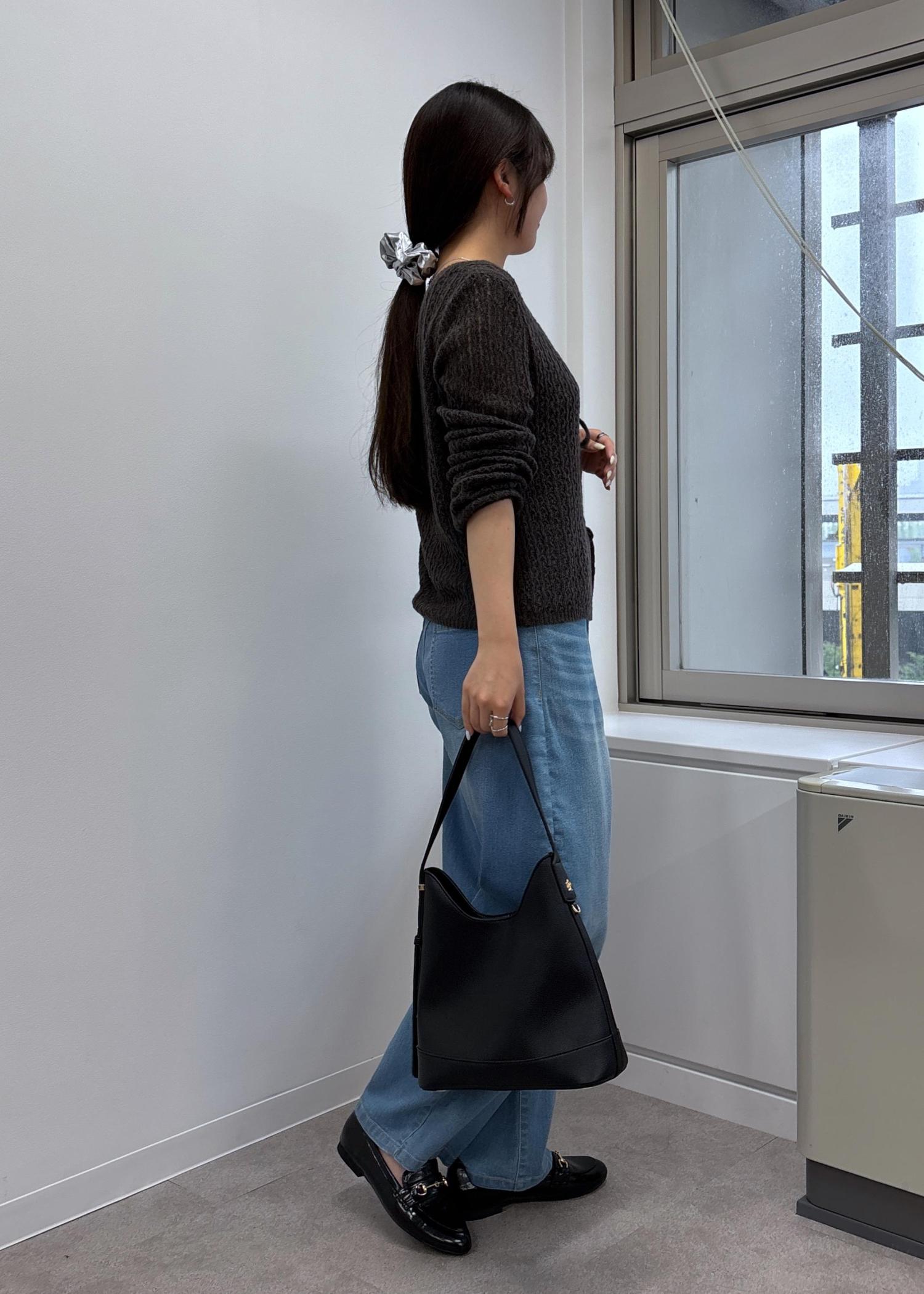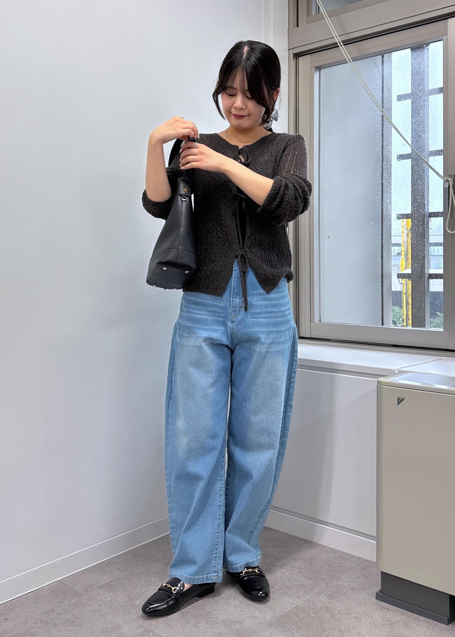 程よくヘルシーな透け感が今年らしいニットカーディガン。シンプルにデニムパンツで合わせて秋先取りなスタイルに。小物は黒のレザーでシックな雰囲気にまとめました。