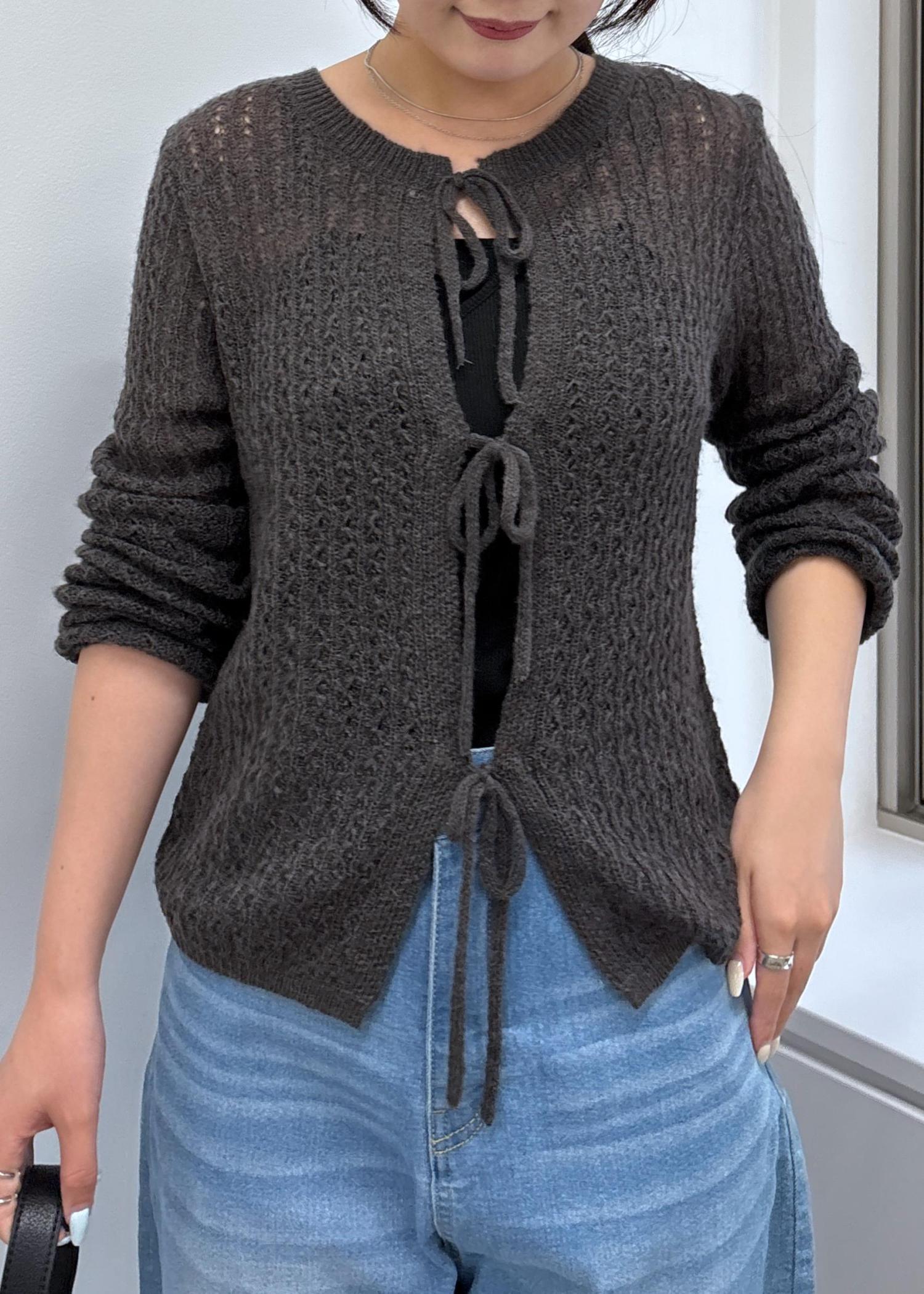 ROPÉ PICNICレース編みメッシュニットカーディガンダークブラウン / F¥3,993レビューヘルシーな透け感のメッシュカーディガン。肌あたりは柔らかくチクチク感は感じませんでした。161cmが着用して腰回りが隠れる着丈、お袖は長めで手の甲が隠れますがややフィット感のあるニットなのでダラっとすることなく着られました。