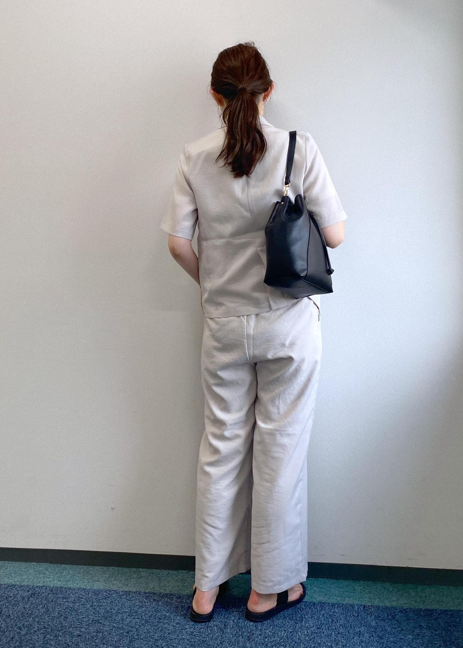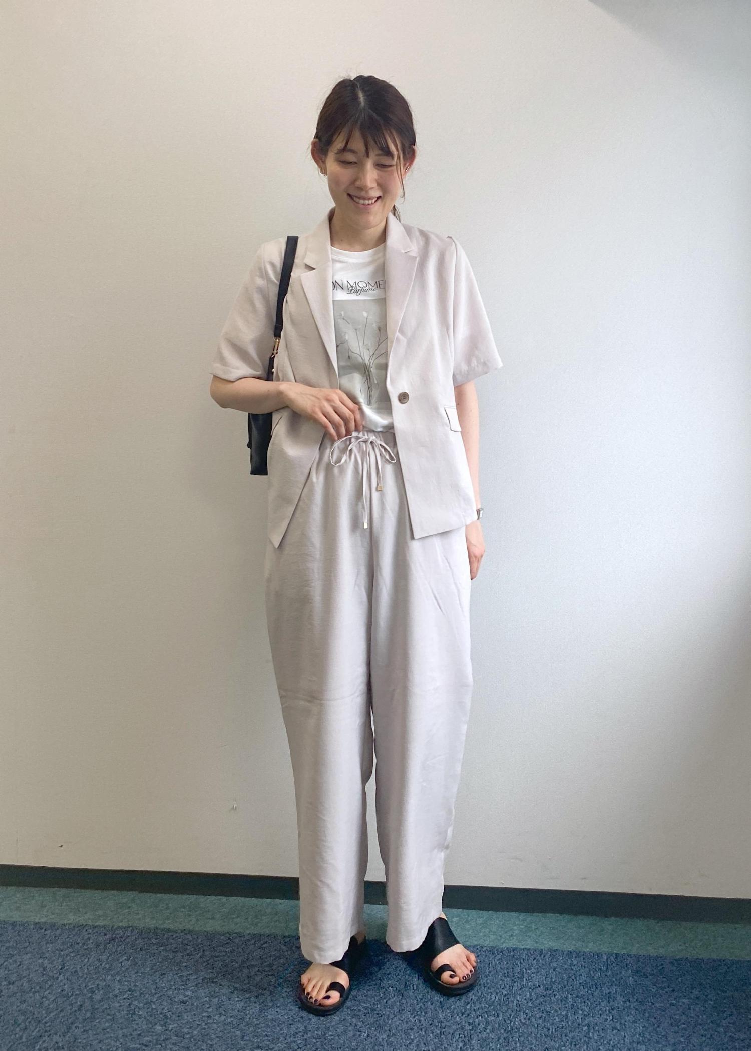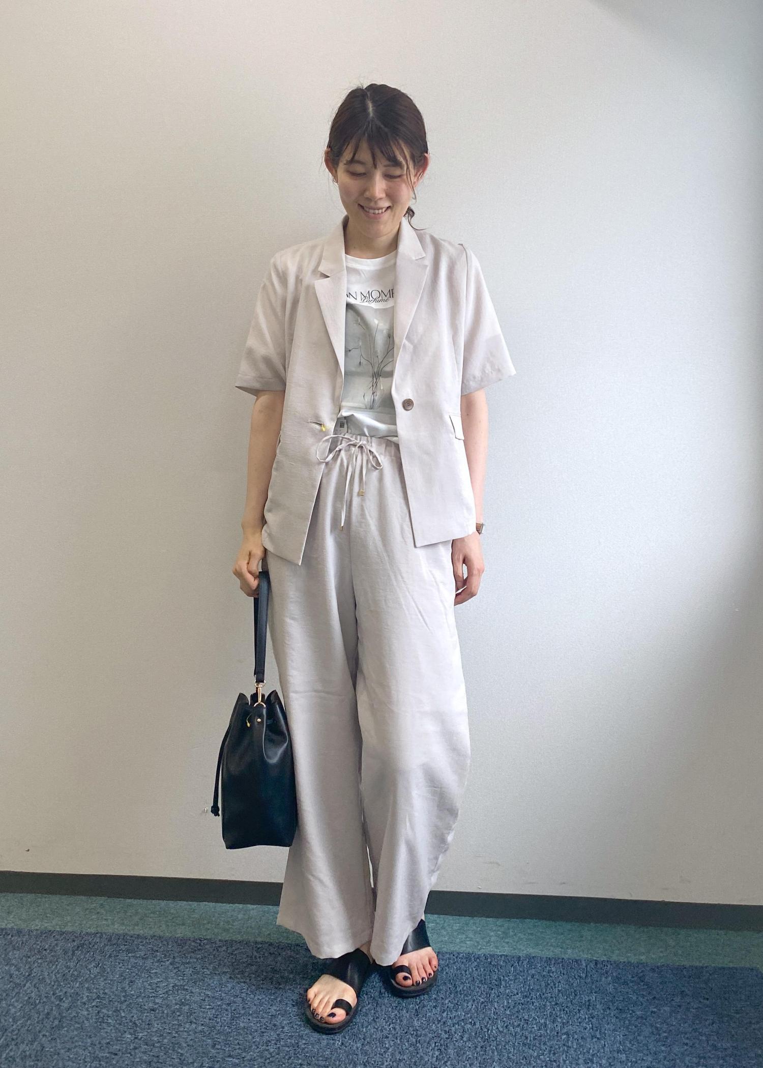 夏に嬉しい涼しい素材のセットアップはお仕事にも普段にもおすすめ!暑い日はベージュの軽やかなカラーでおしゃれを楽しめます♫