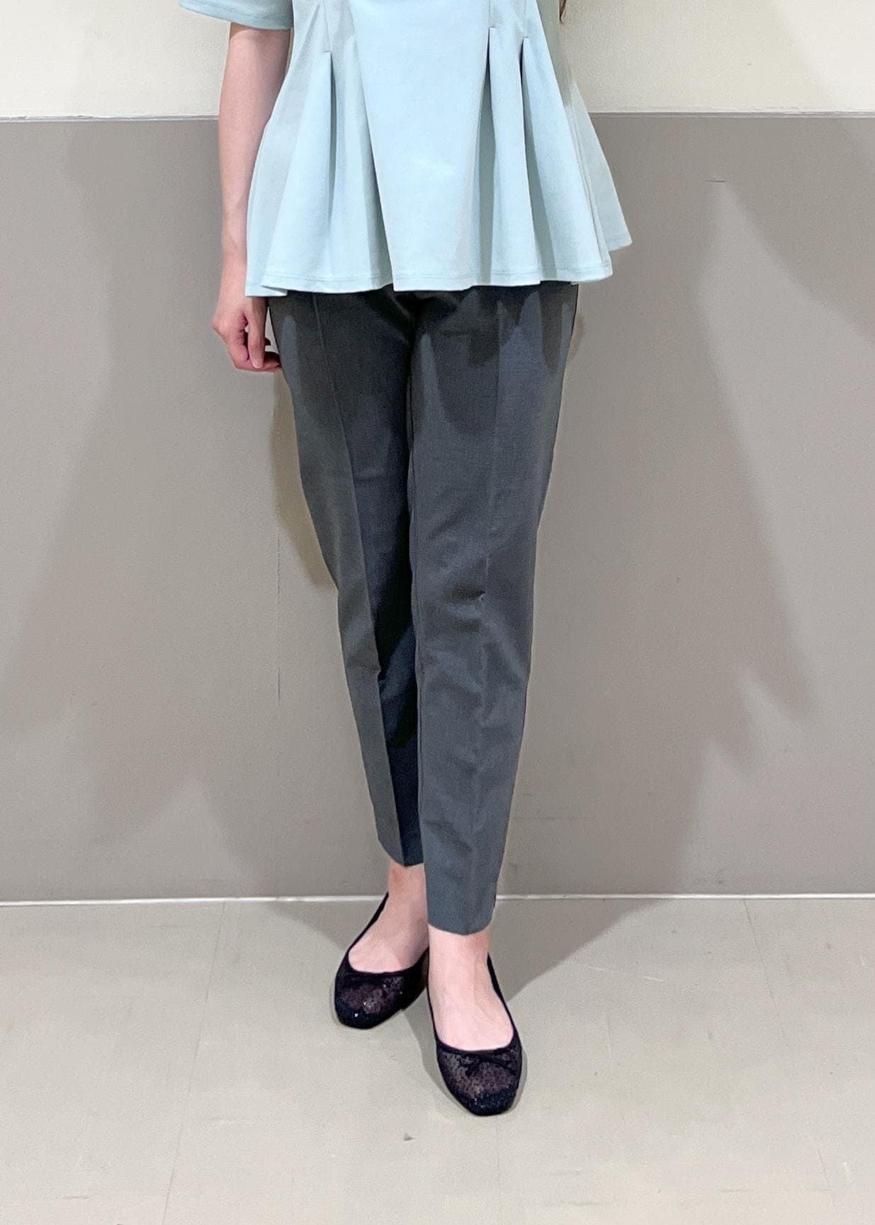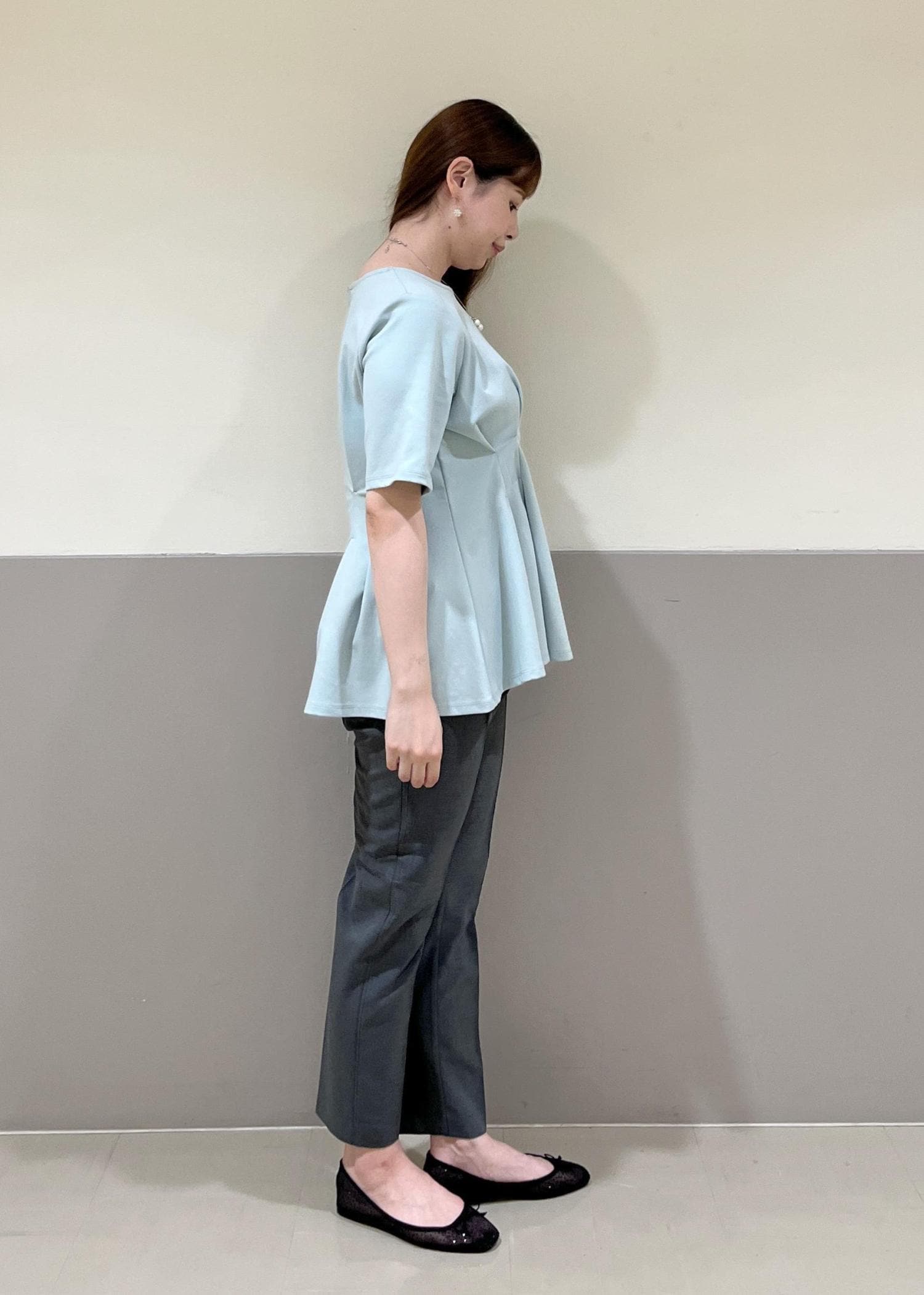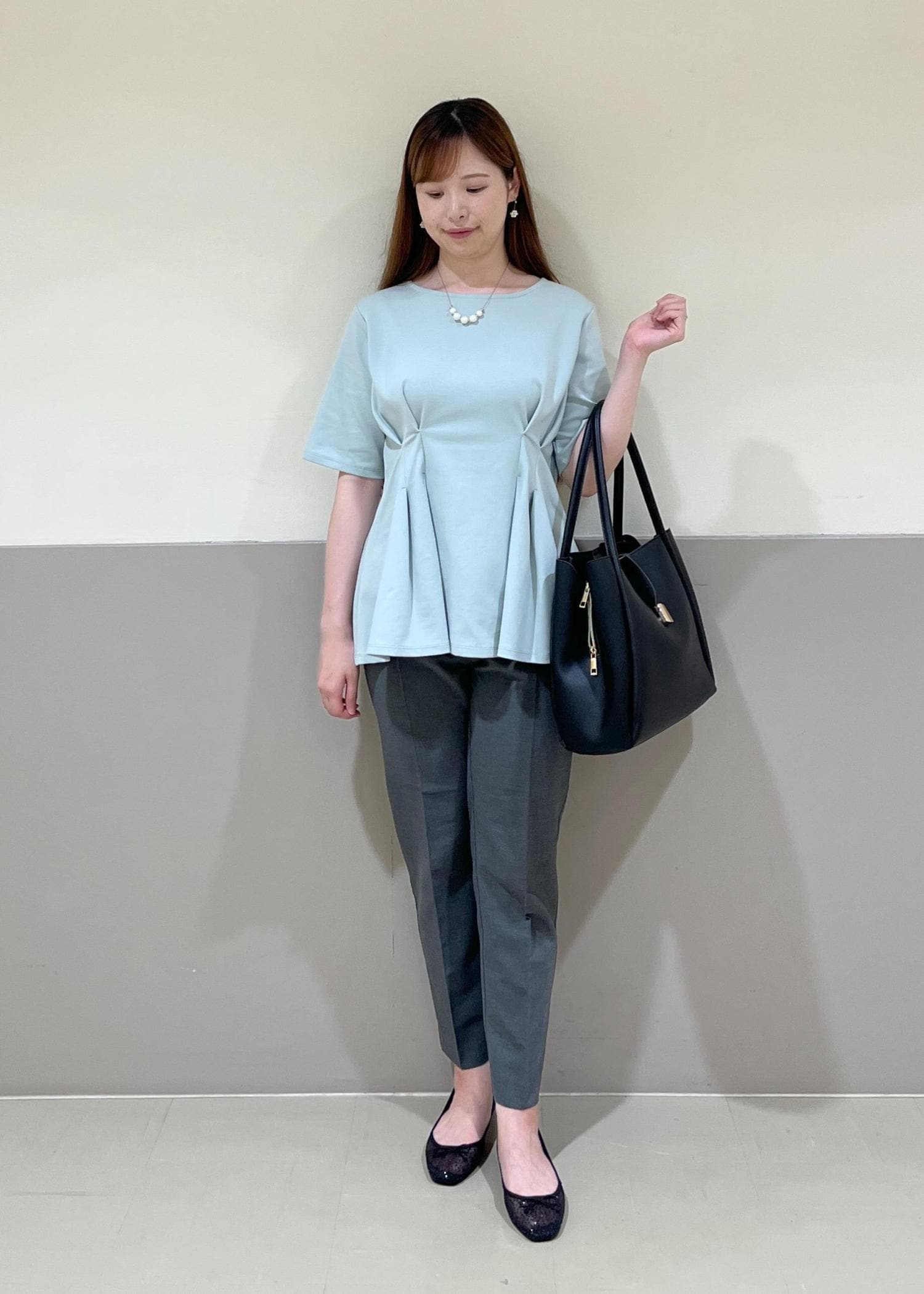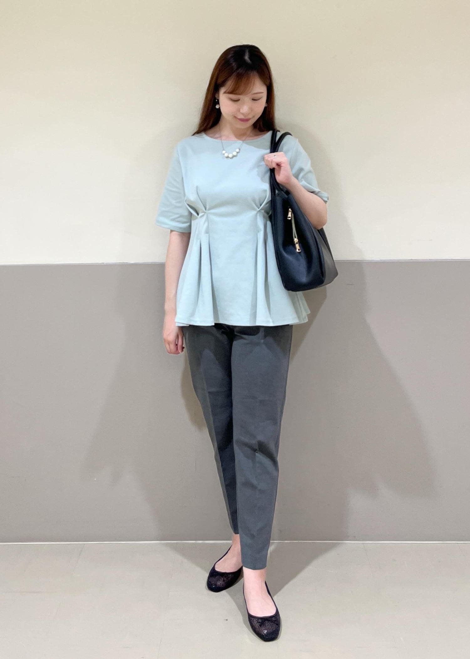 オフィスでも私服でも使えるペプラムトップスを使って、