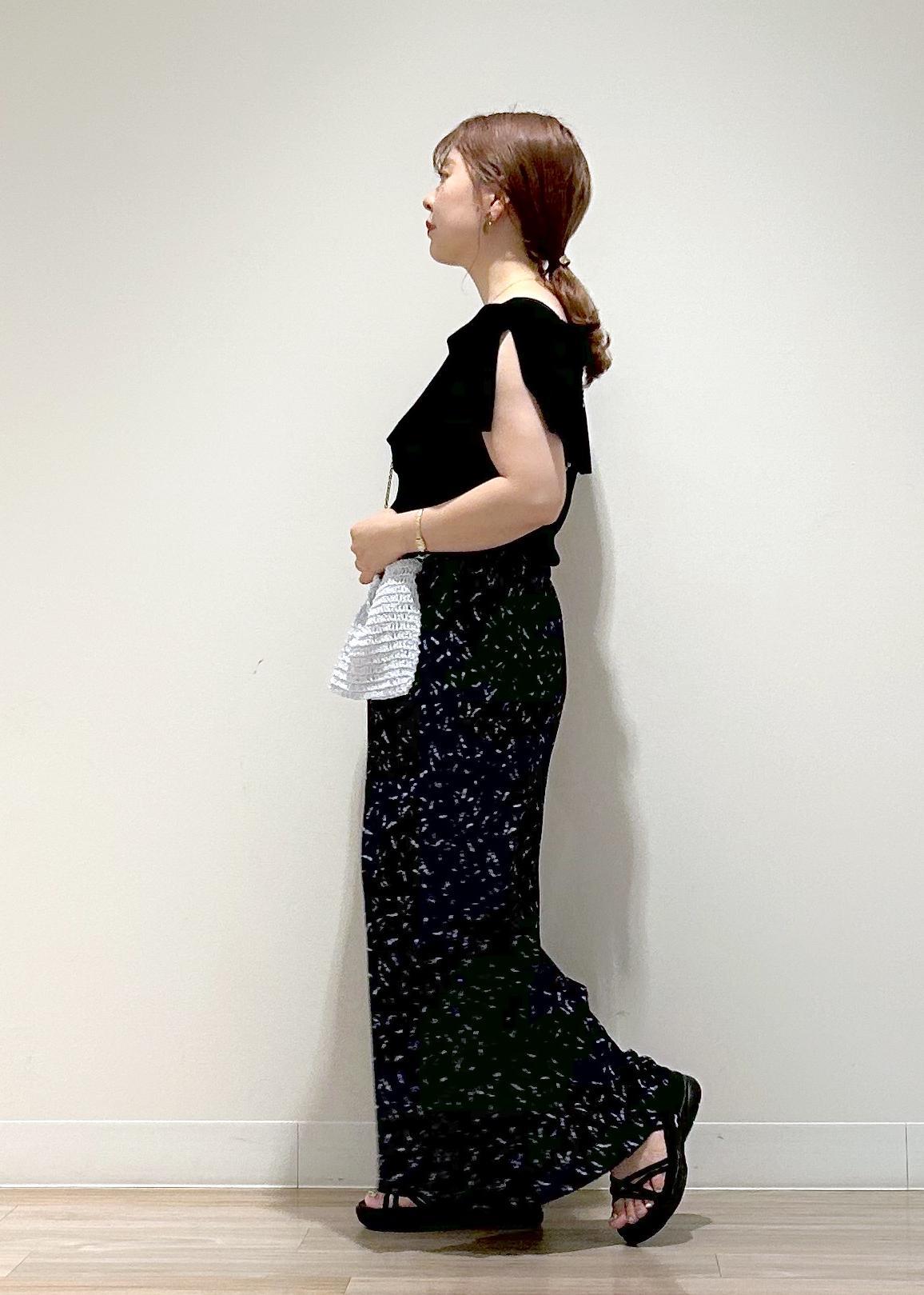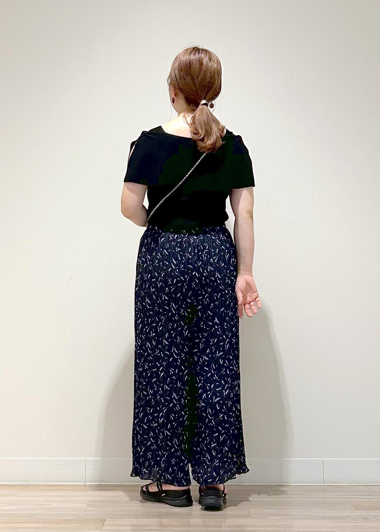 また、プリーツパンツも脚のラインが出にくいので、体型カバーコーディネートとして合わせてみました。