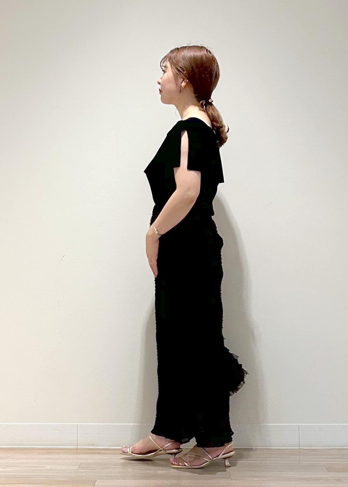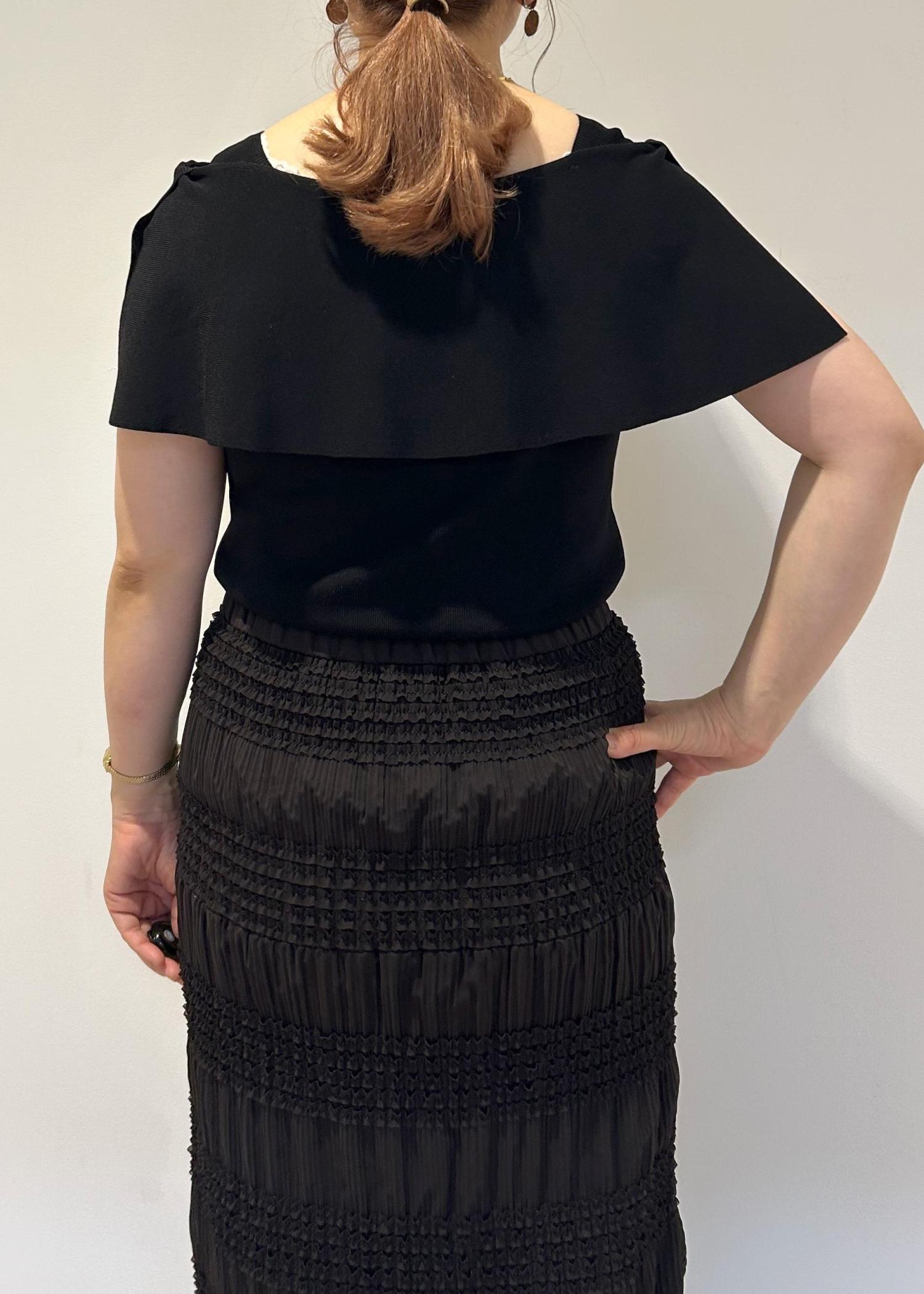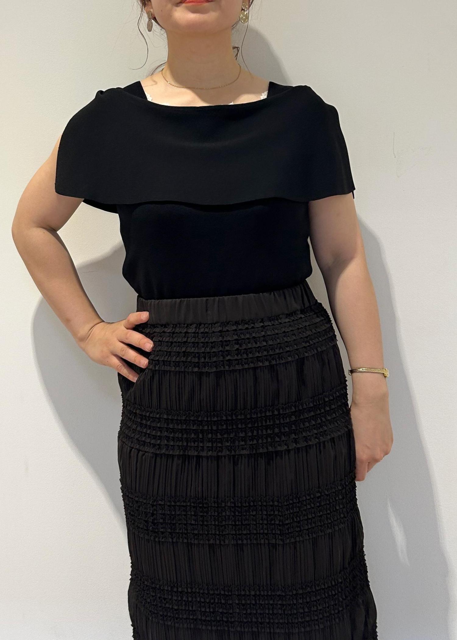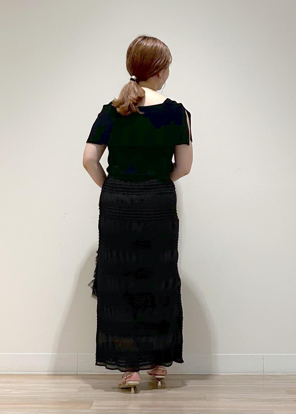 大人っぽい印象にしたかったので、同系色のIラインのスカートで合わせ、ワントーンで綺麗めな印象のコーディネートにしました。暗くなりすぎないよう足元はゴールドのサンダルで合わせました。同系色カラーのコーディネートですが、それぞれのアイテムの素材感に違いがあるので、重たくなりすぎる印象を和らげてくれます。