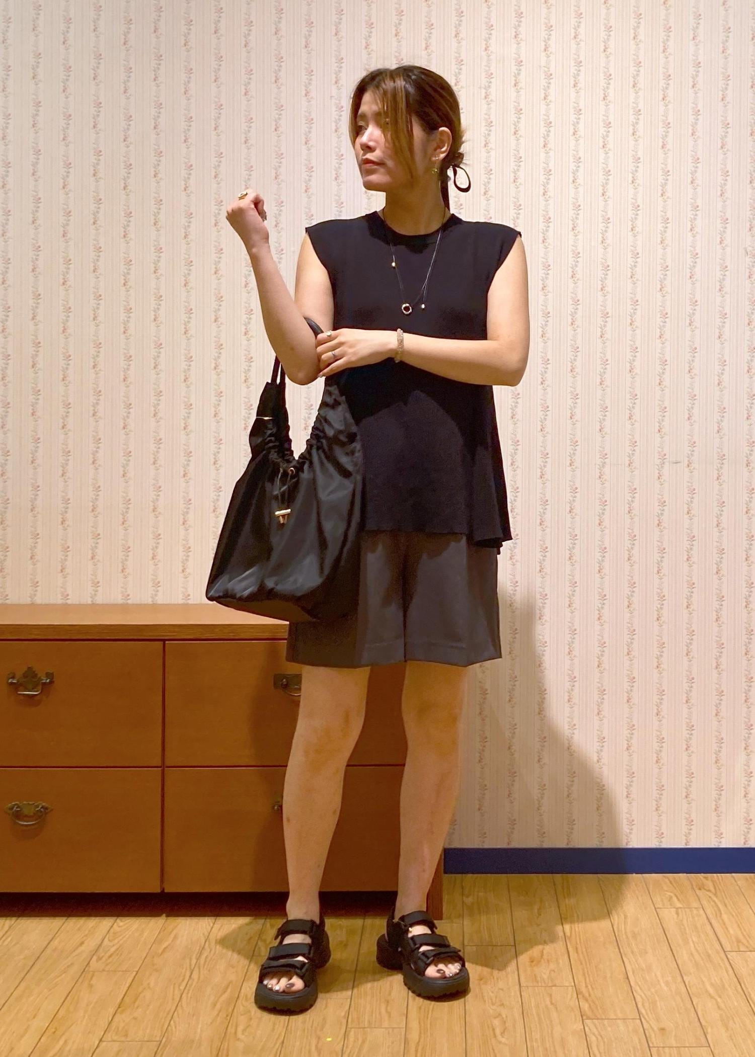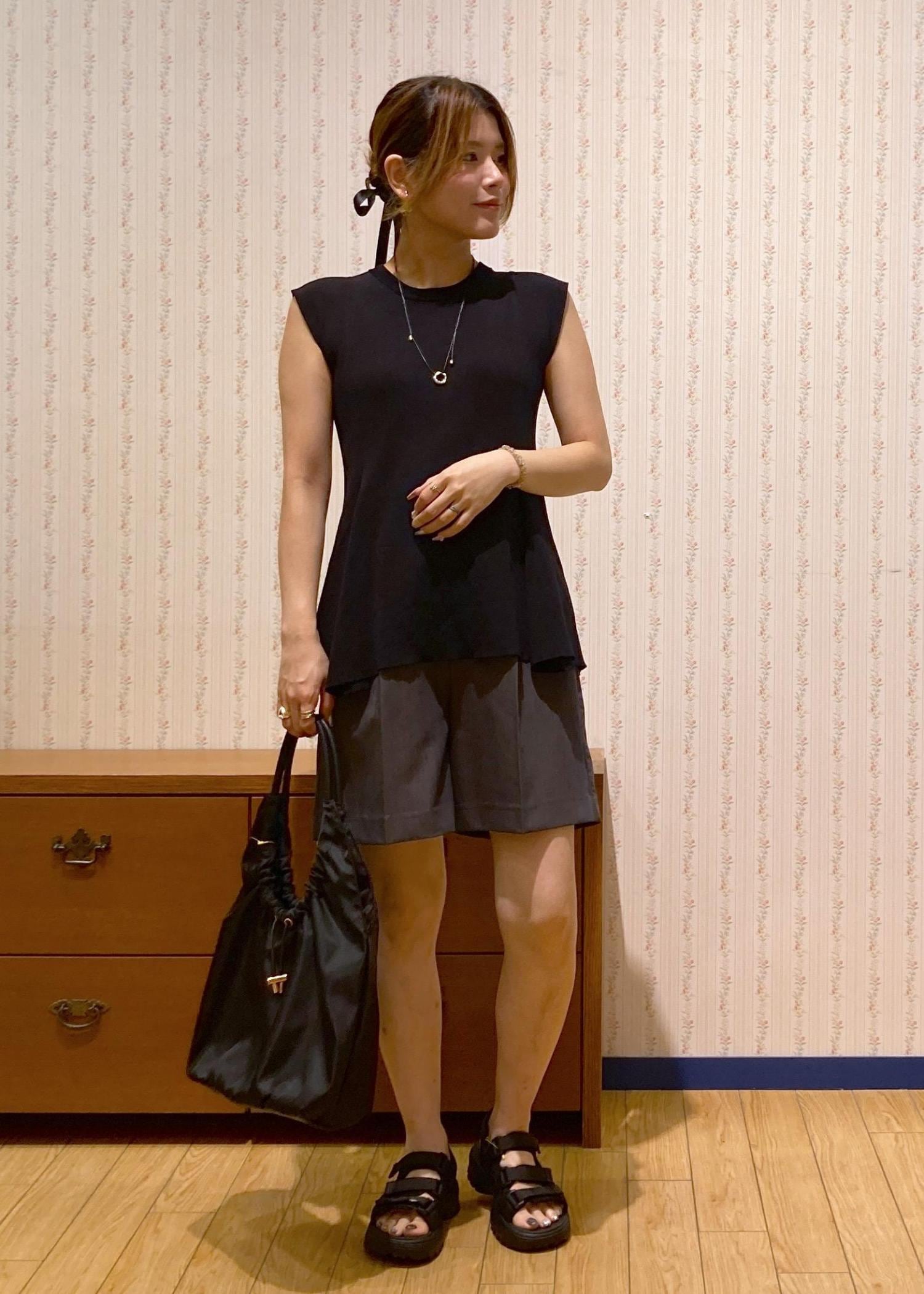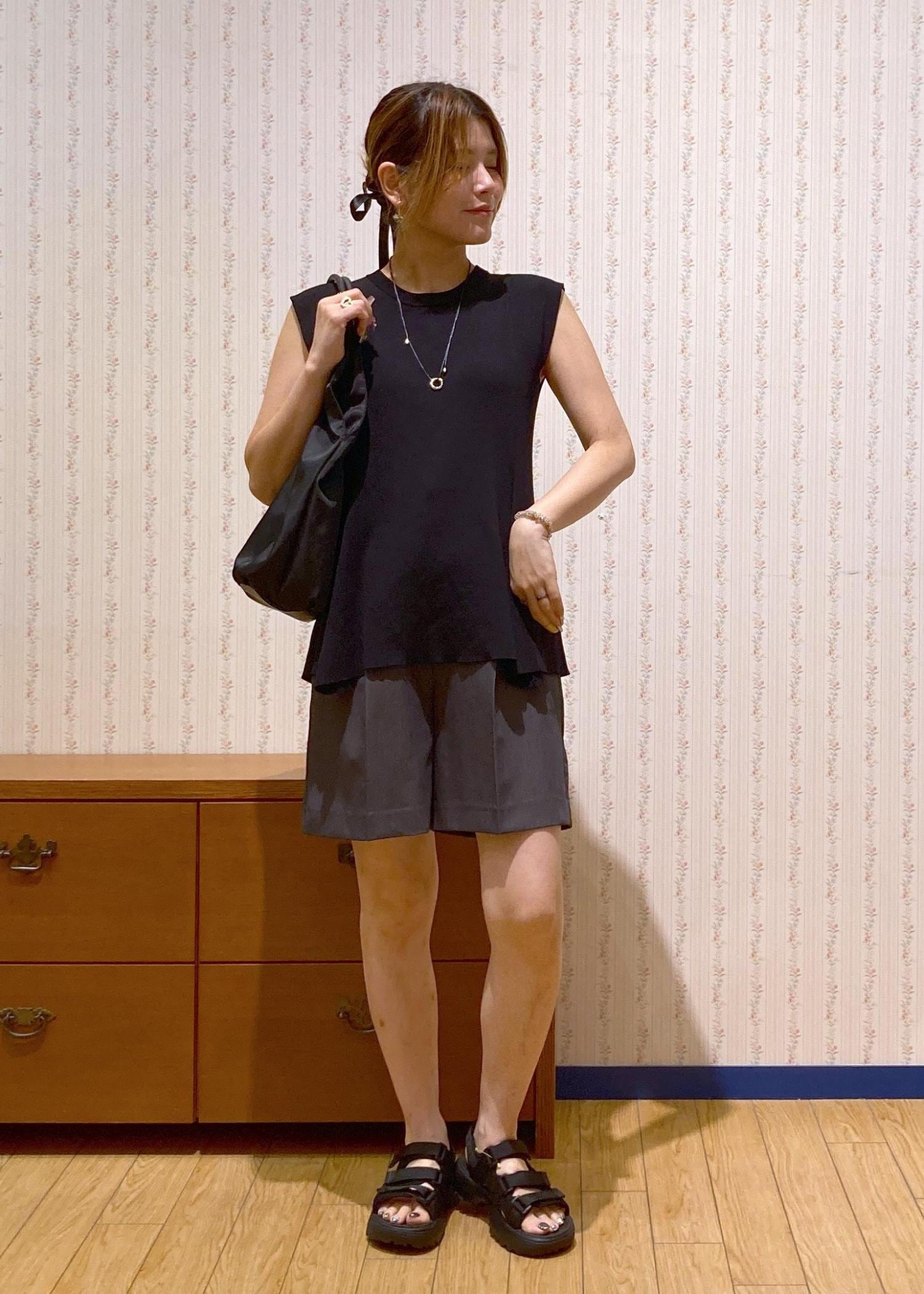 全体をブラックでまとめた大人のハーフパンツコーディネートです。