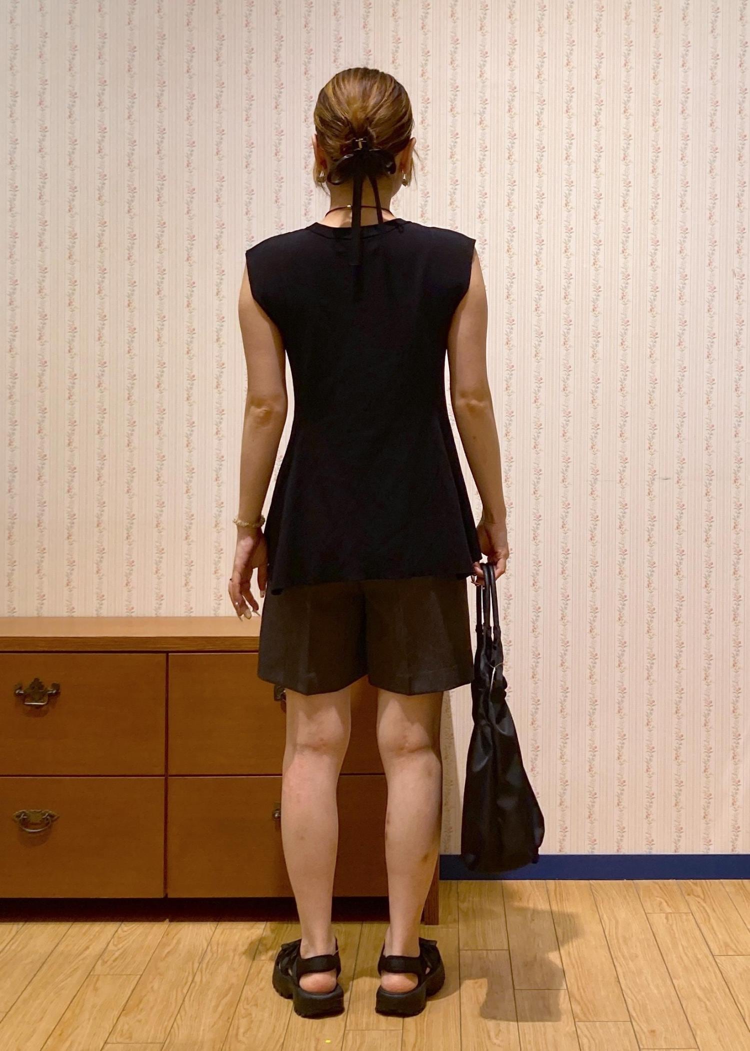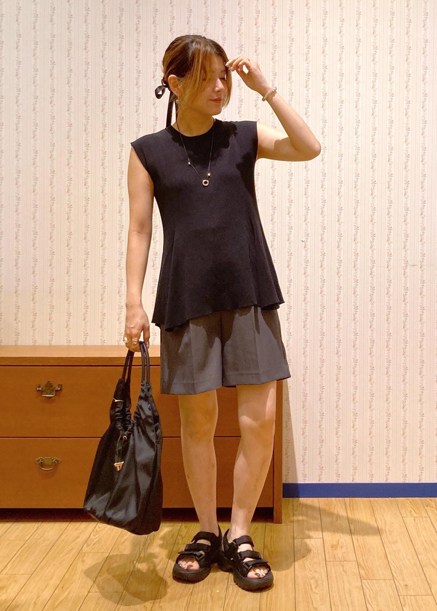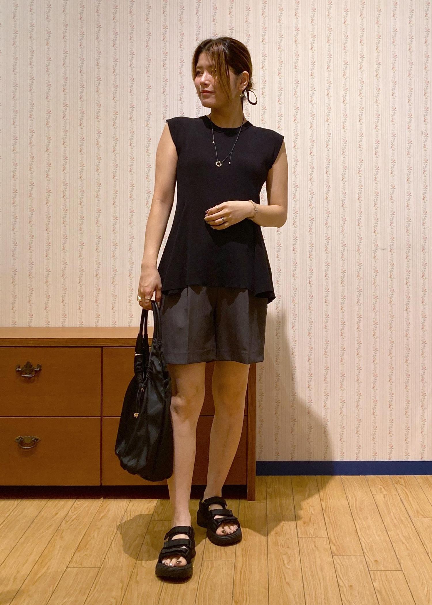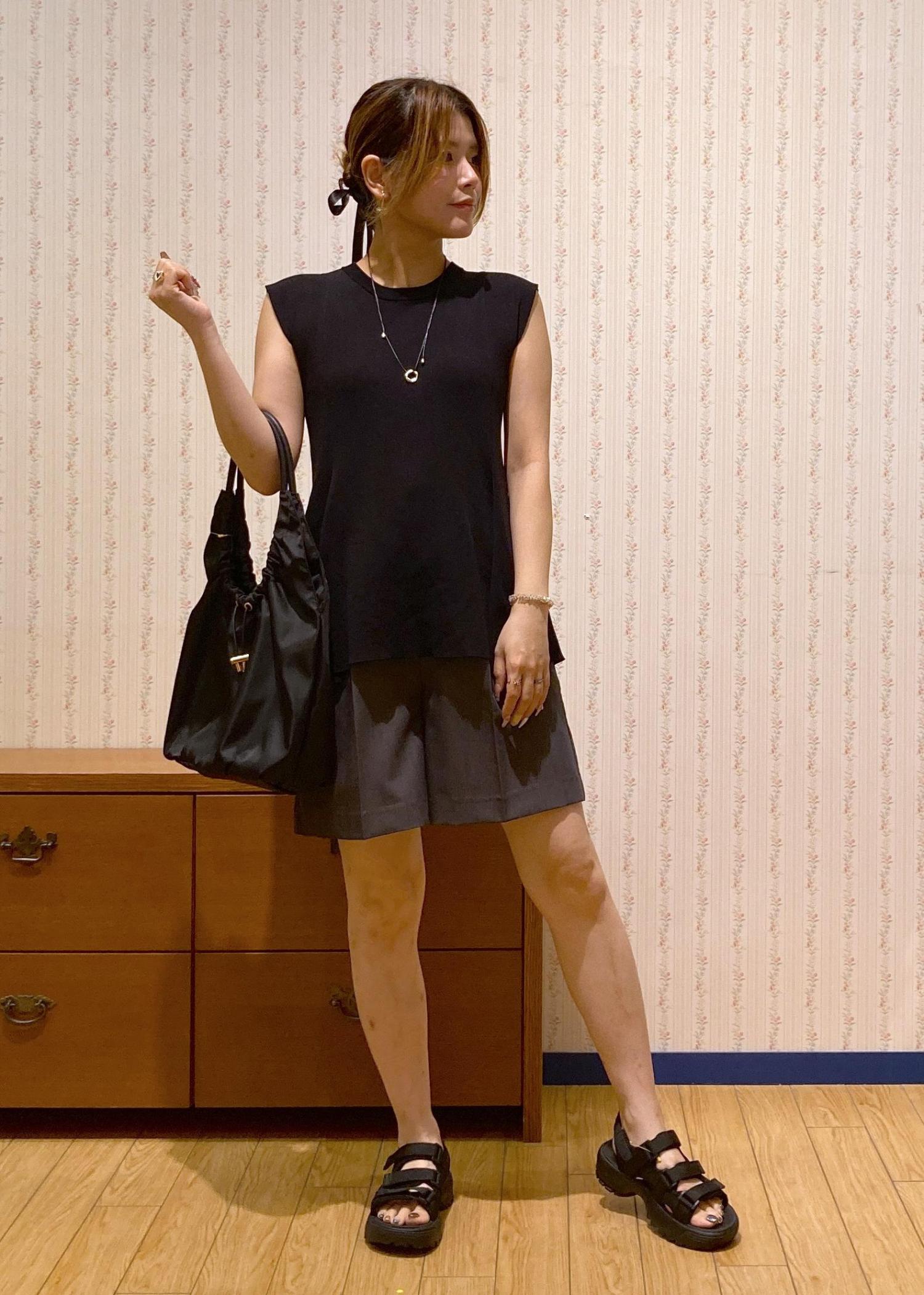 全体をブラックでまとめた大人のハーフパンツコーディネートです。
