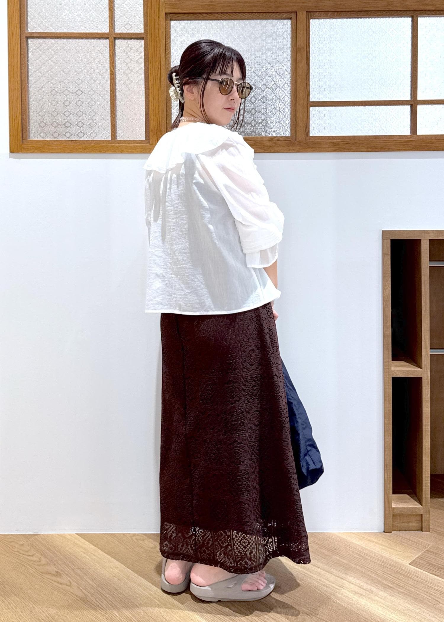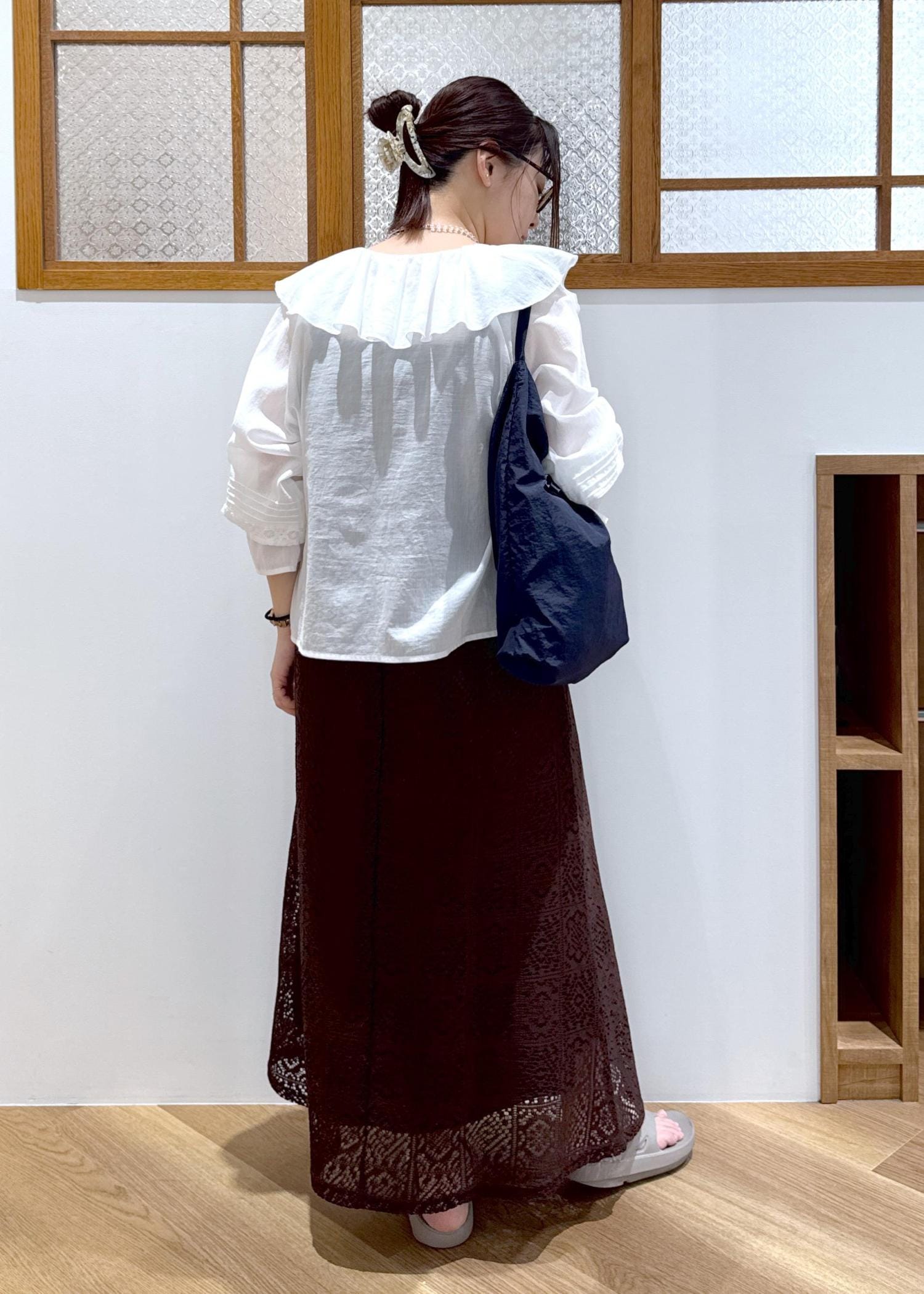 前を開けることで首周りに抜け感が作れ、フリルの甘さも丁度良いバランスで着用できました♪