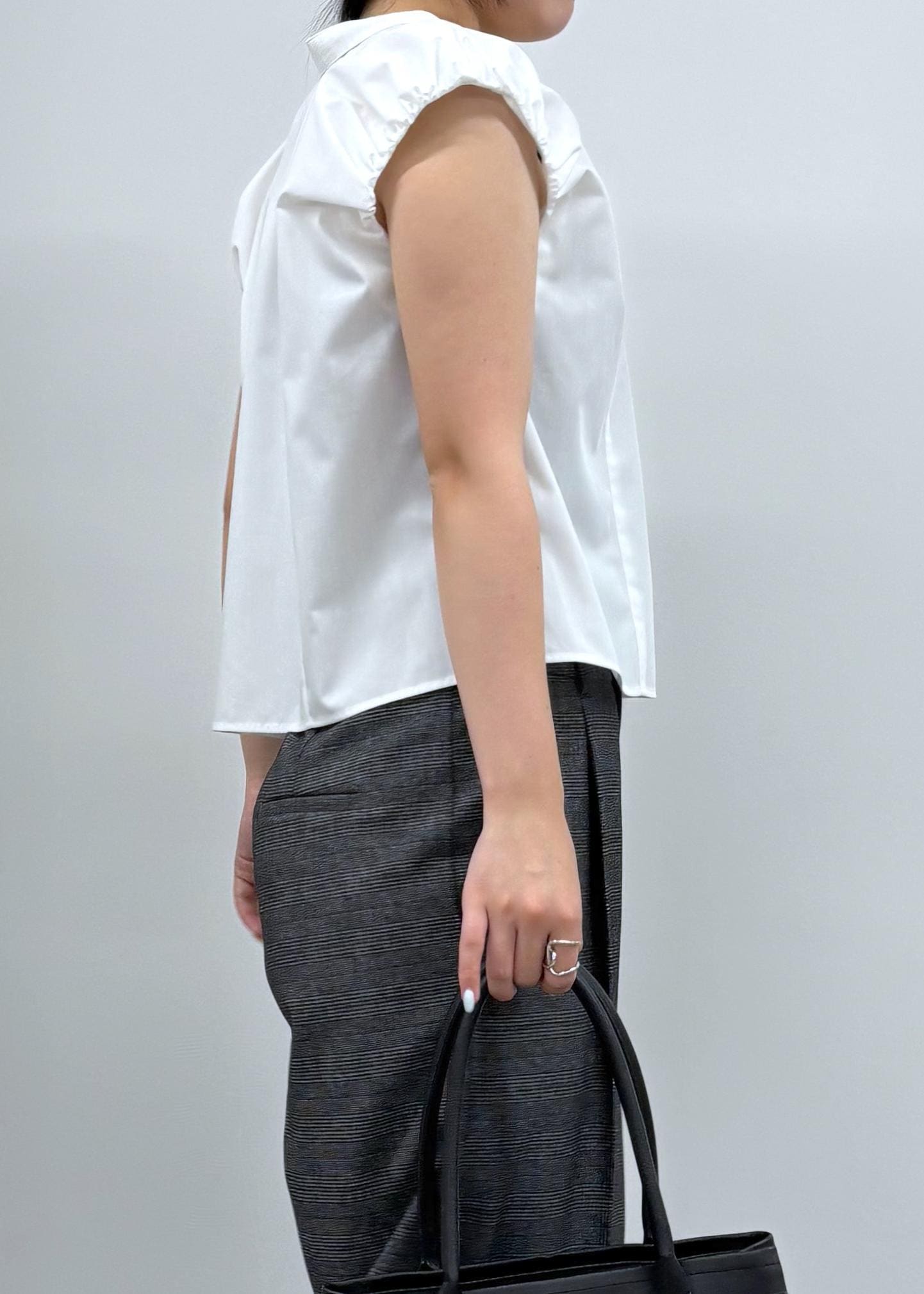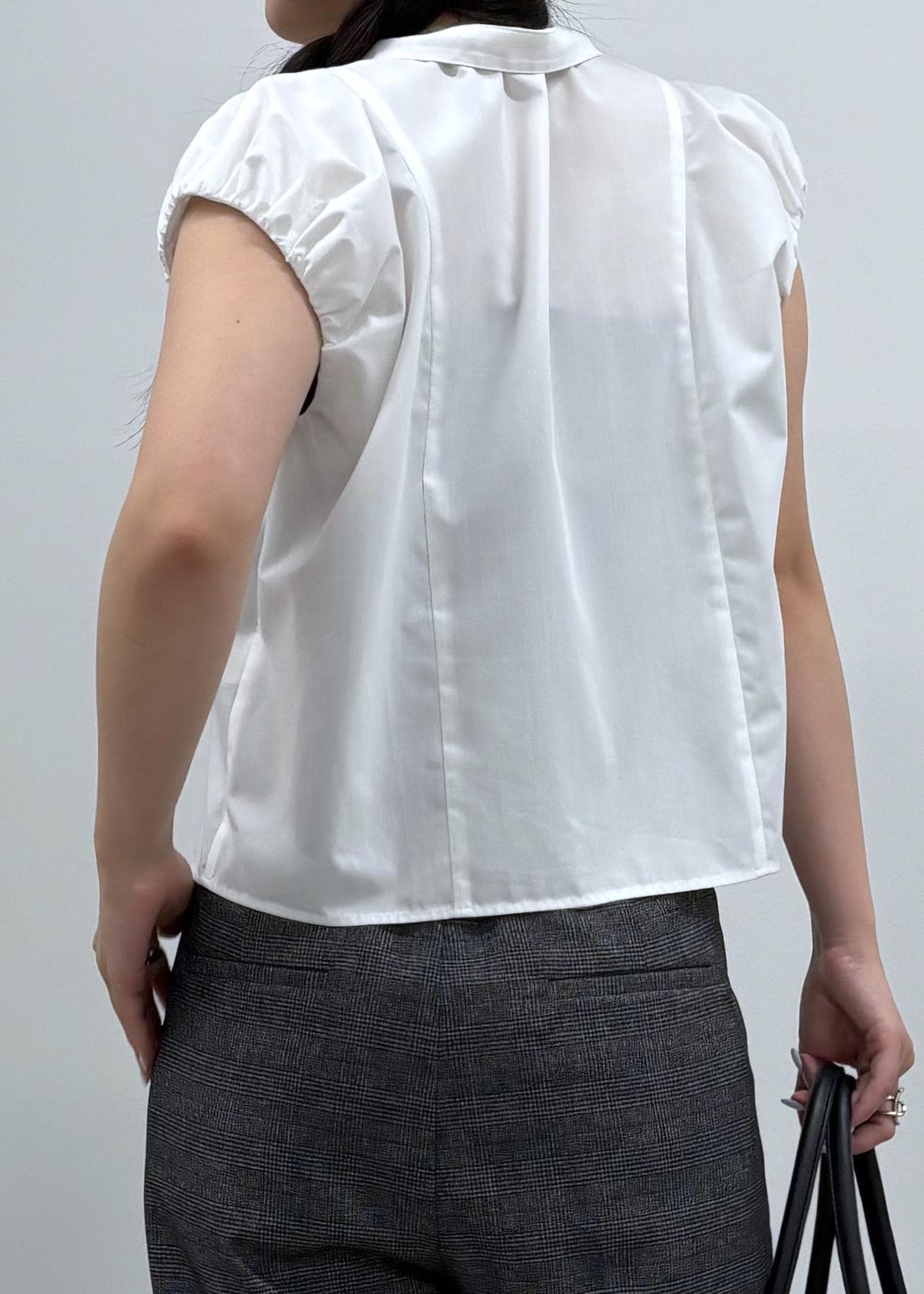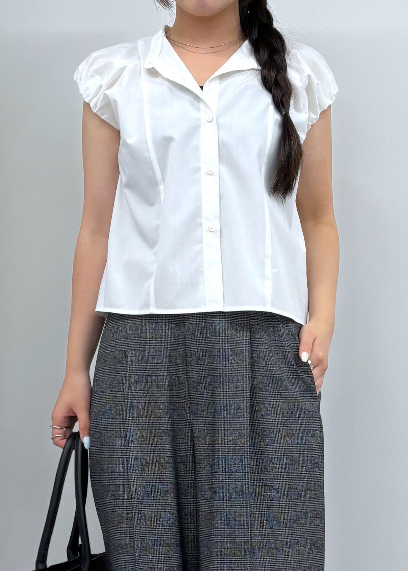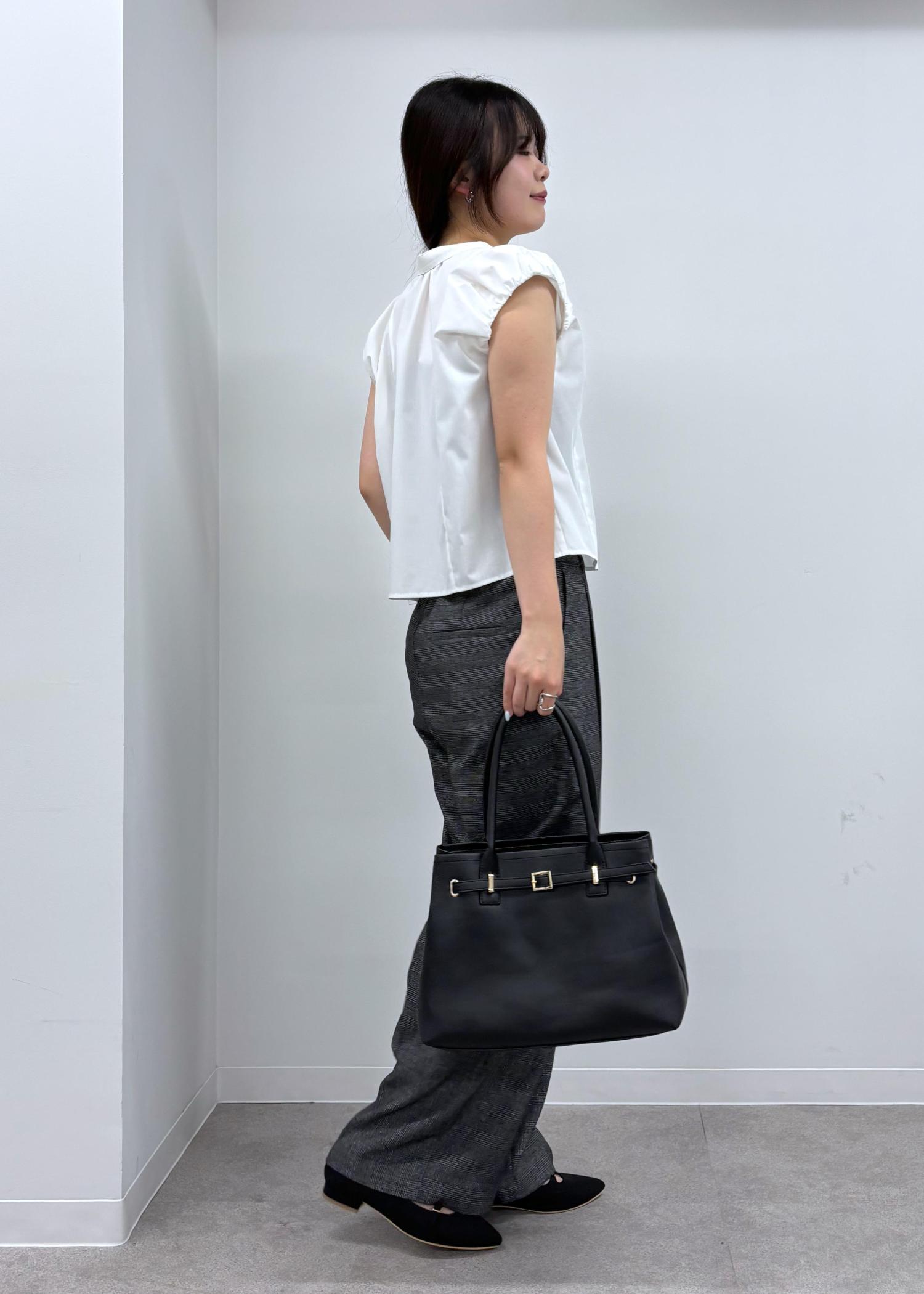 控えめなパフスリーブが可愛らしいデザインブラウス。シックな印象を与えるタックパンツを合わせてお仕事でも着られるシンプルコーデにしました。