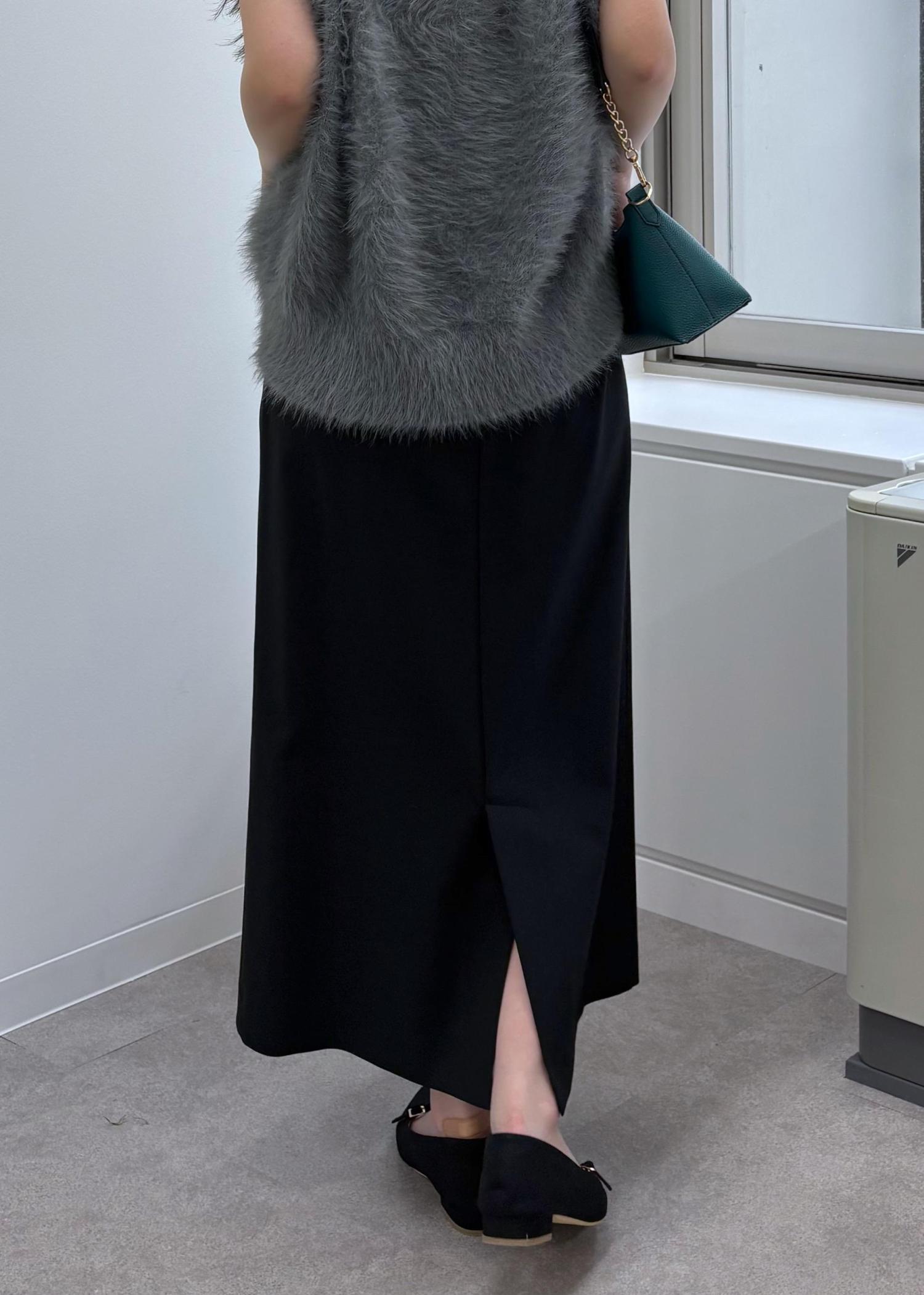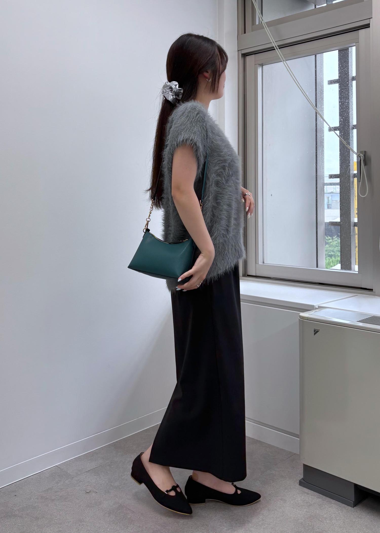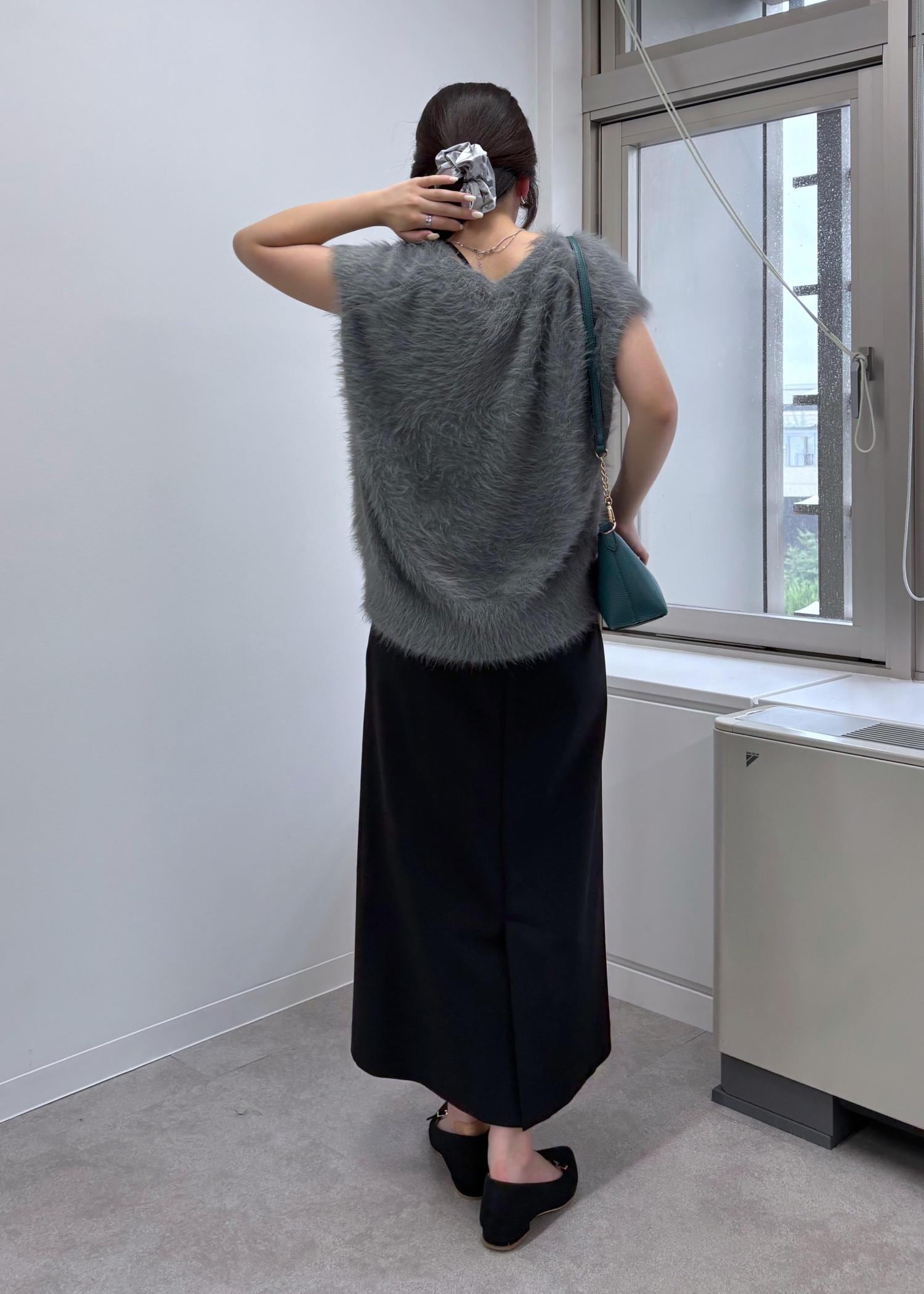 フェザーニットベストを大胆に一枚着として。毛足が長くボリュームが出るのでIラインのスカートを合わせてスッキリとまとめました。