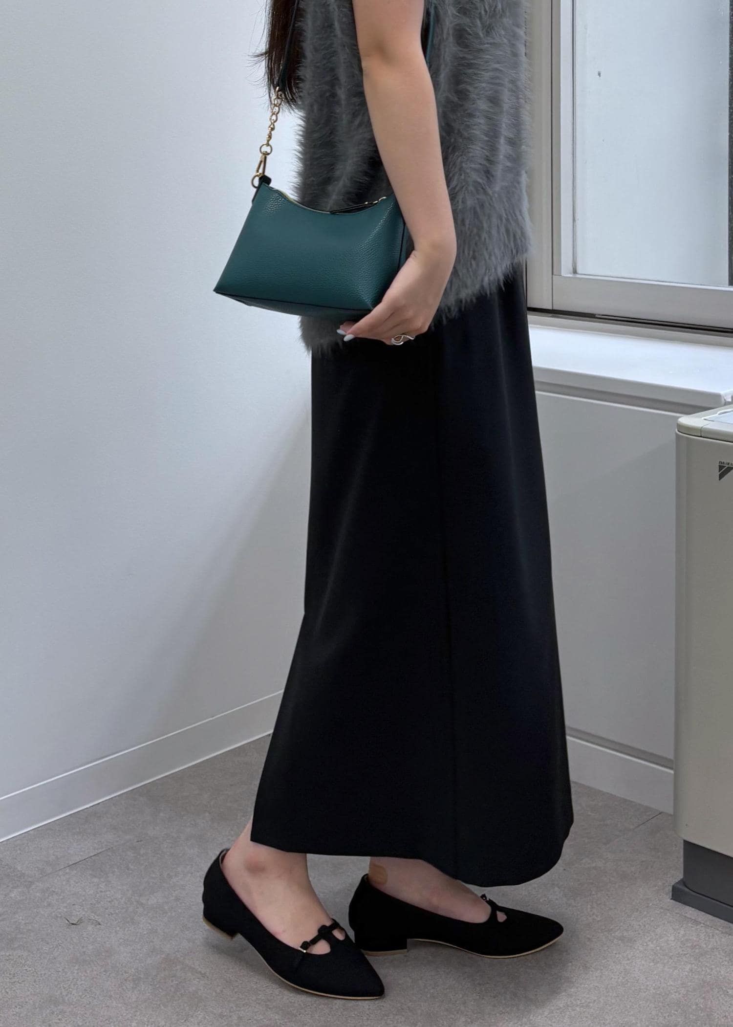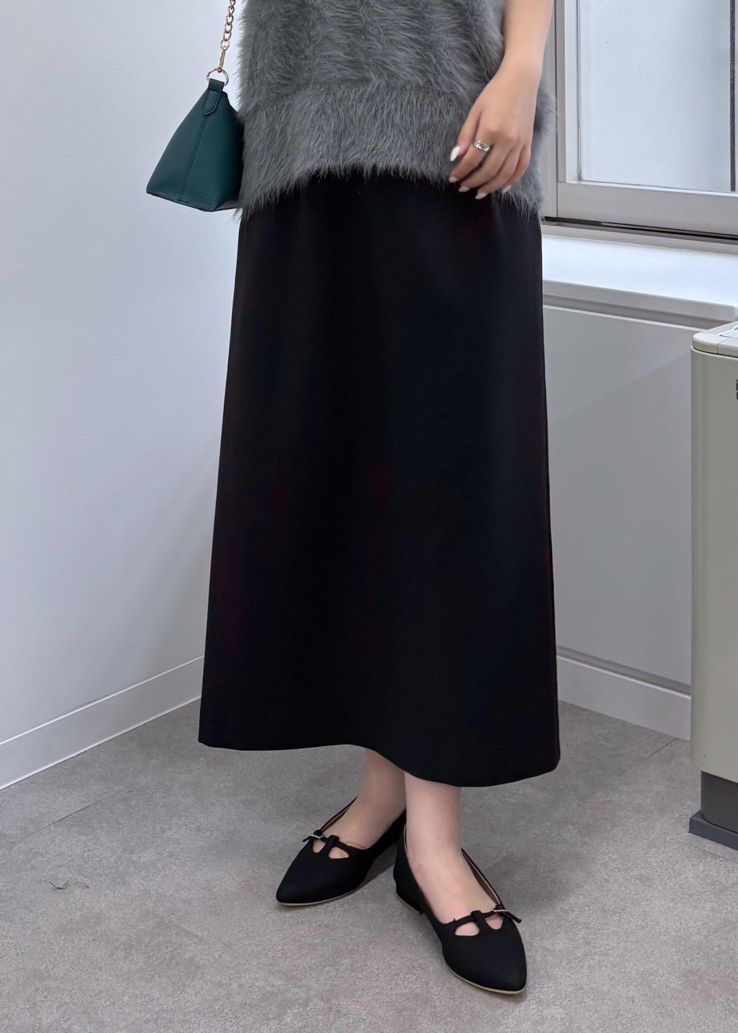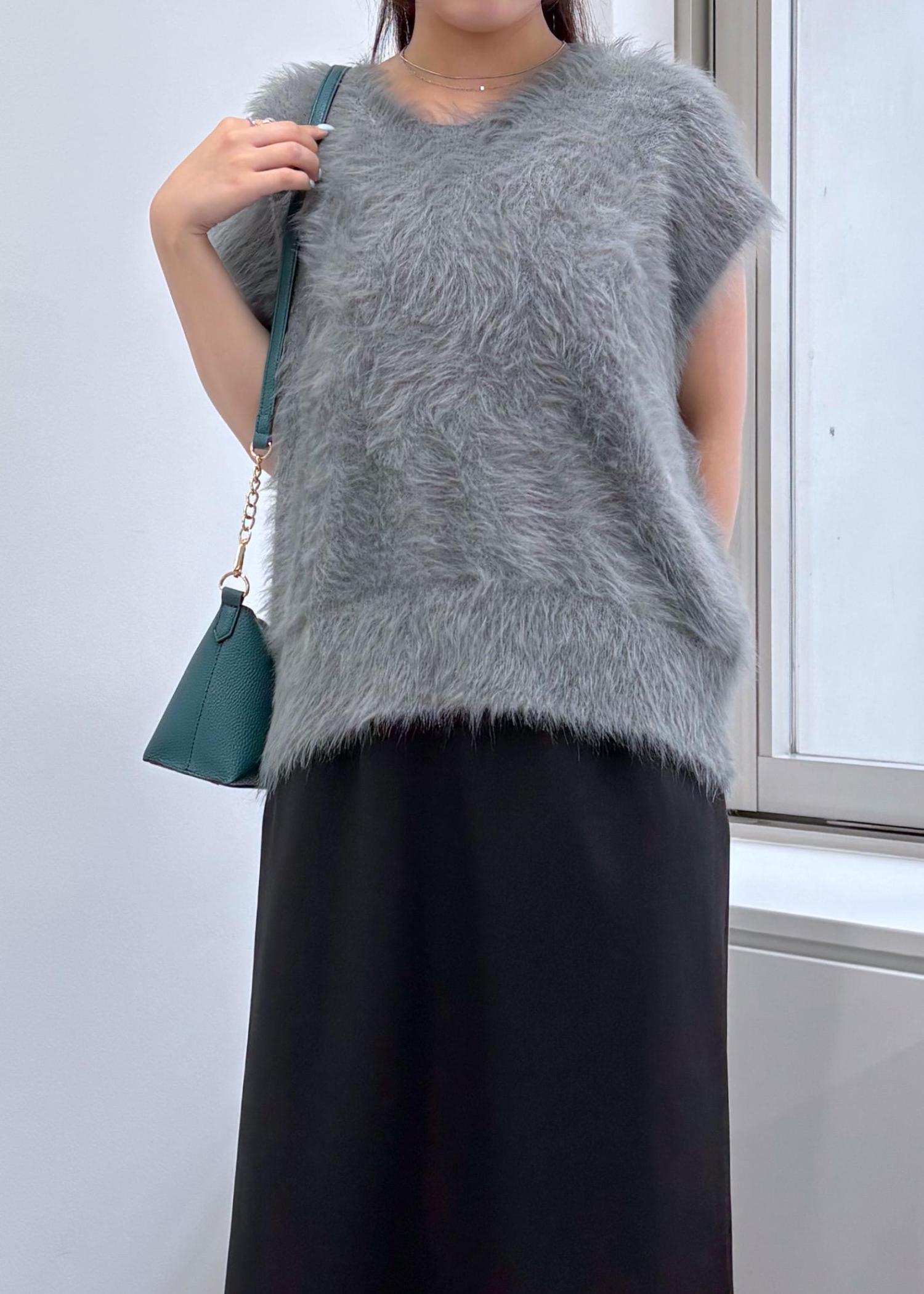 フェザーニットベストを大胆に一枚着として。毛足が長くボリュームが出るのでIラインのスカートを合わせてスッキリとまとめました。