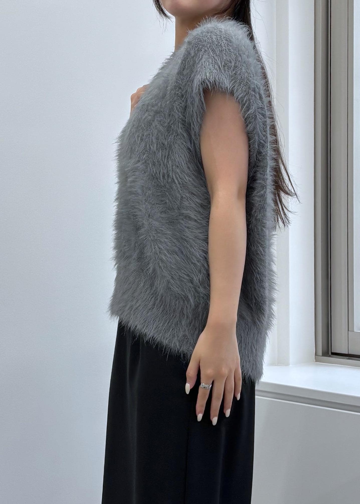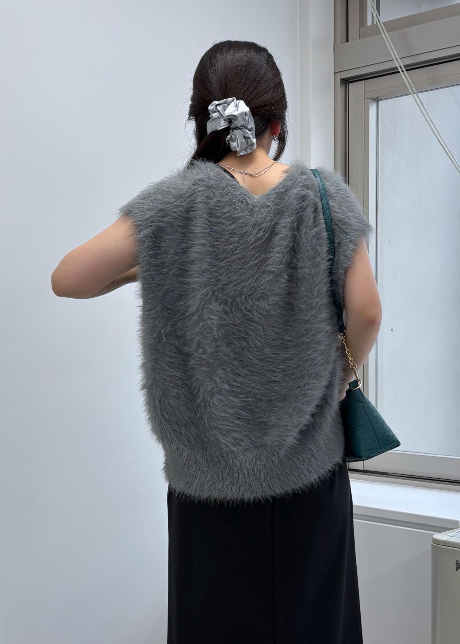 たっぷりの毛足感が様見えするフェザーニットベスト。とても柔らかな肌あたりでチクチク感は感じませんでした。身幅にゆとりがありカットソーや薄手のニットであれば着膨れ感なく重ねることができます。161cmが着用してヒップの三分の一が隠れるくらいの着丈でした。
