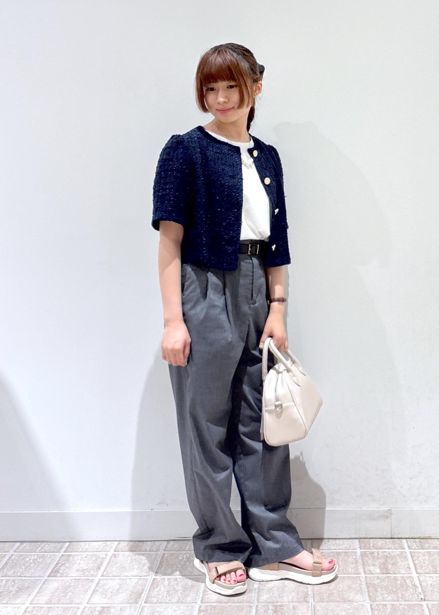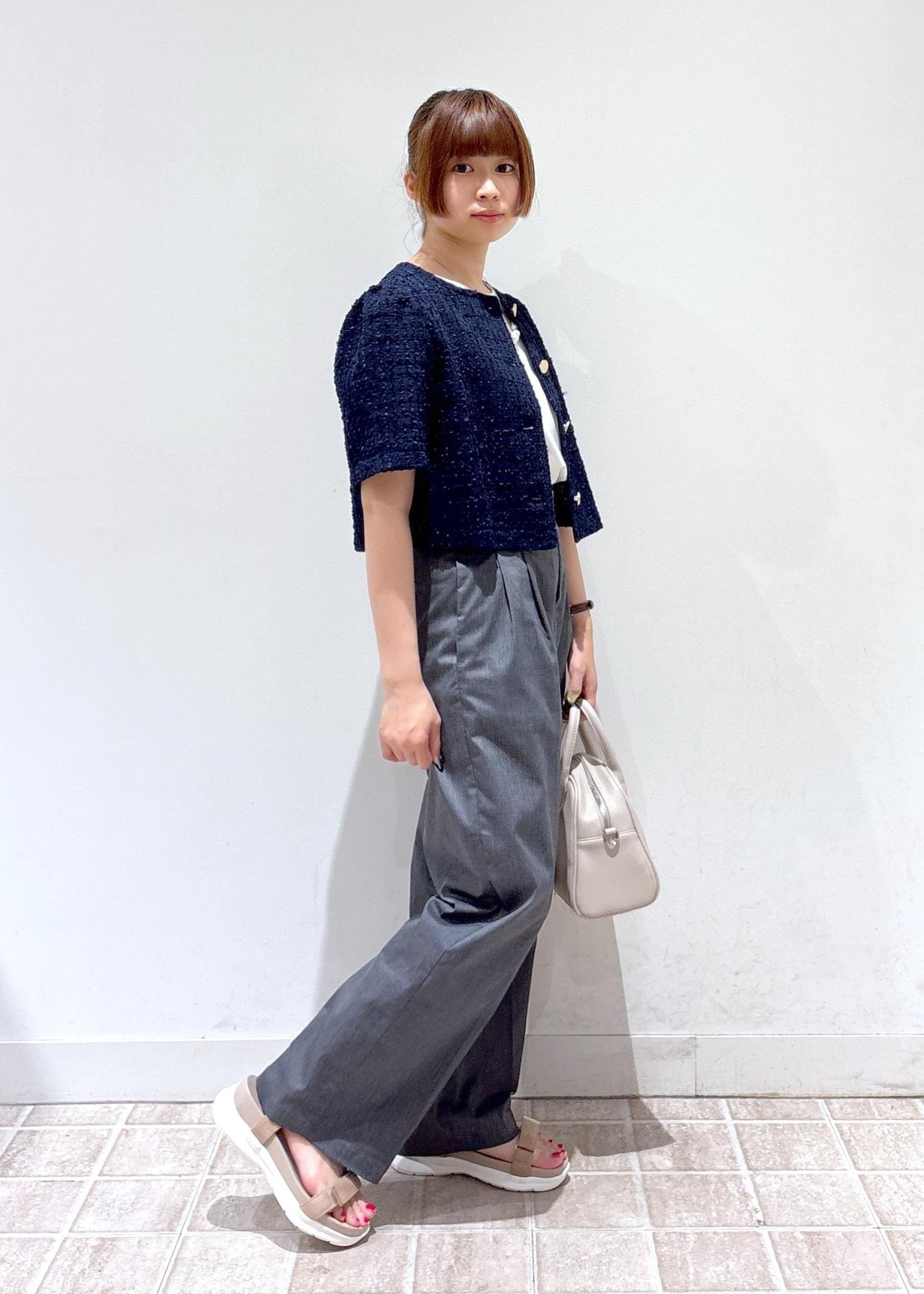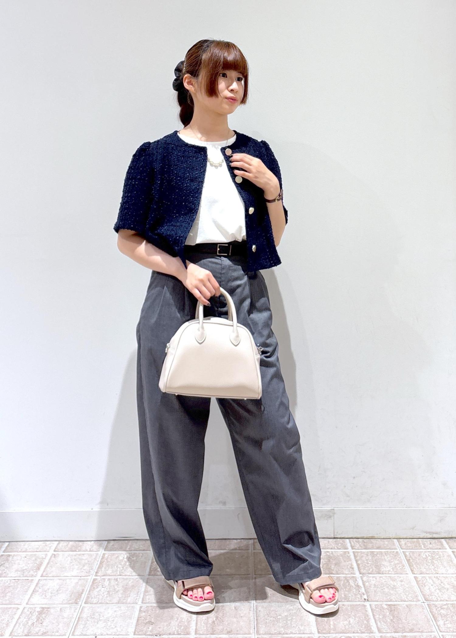 短い丈が特徴のサマーツイードのジャケットとハイウエストで腰周りスッキリ見えるパンツを組み合わせて骨格ウェーブさんにピッタリなコーデにしました。お仕事用でもお使いいただけますし、お出かけ用でもピッタリなコーデです。