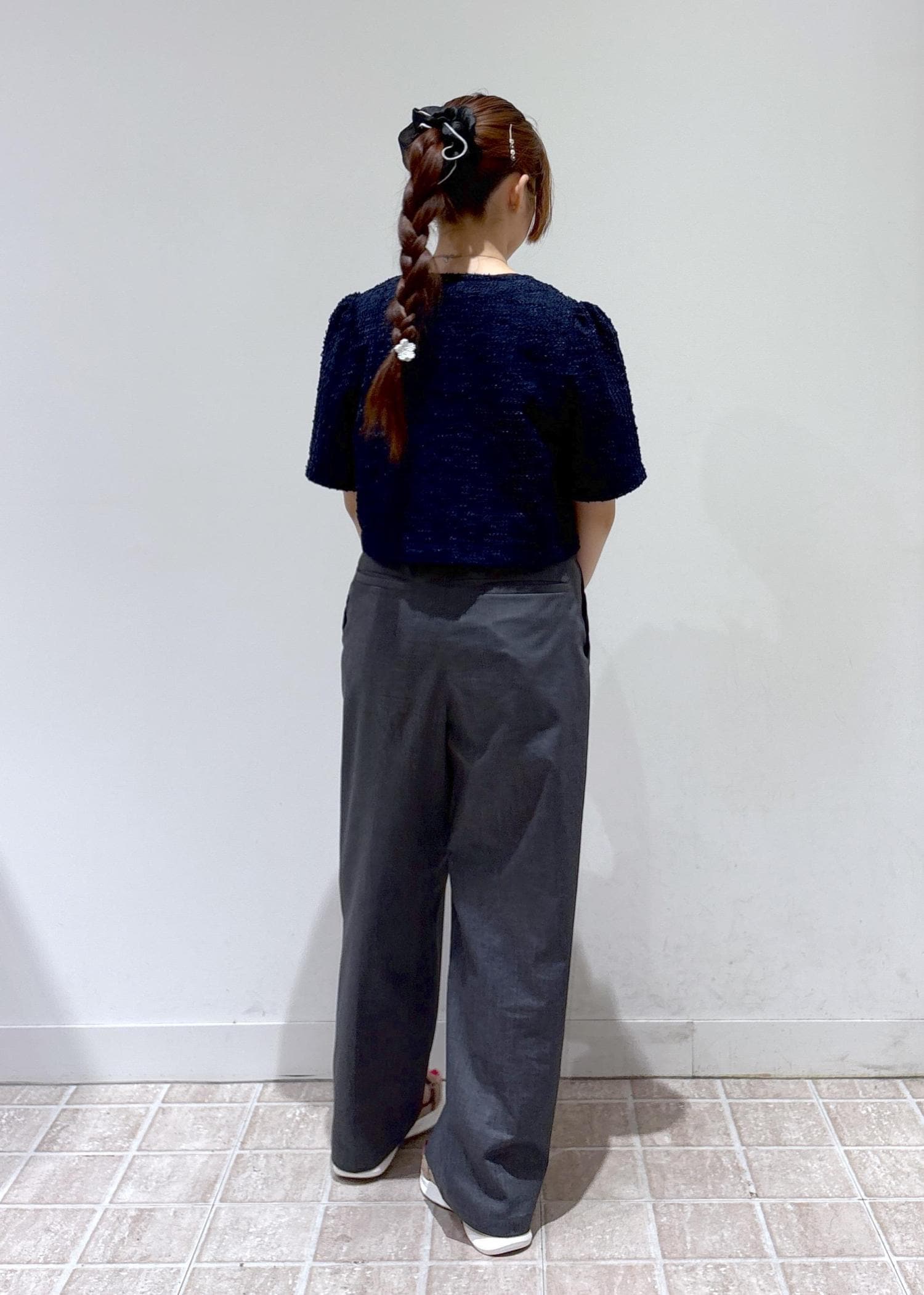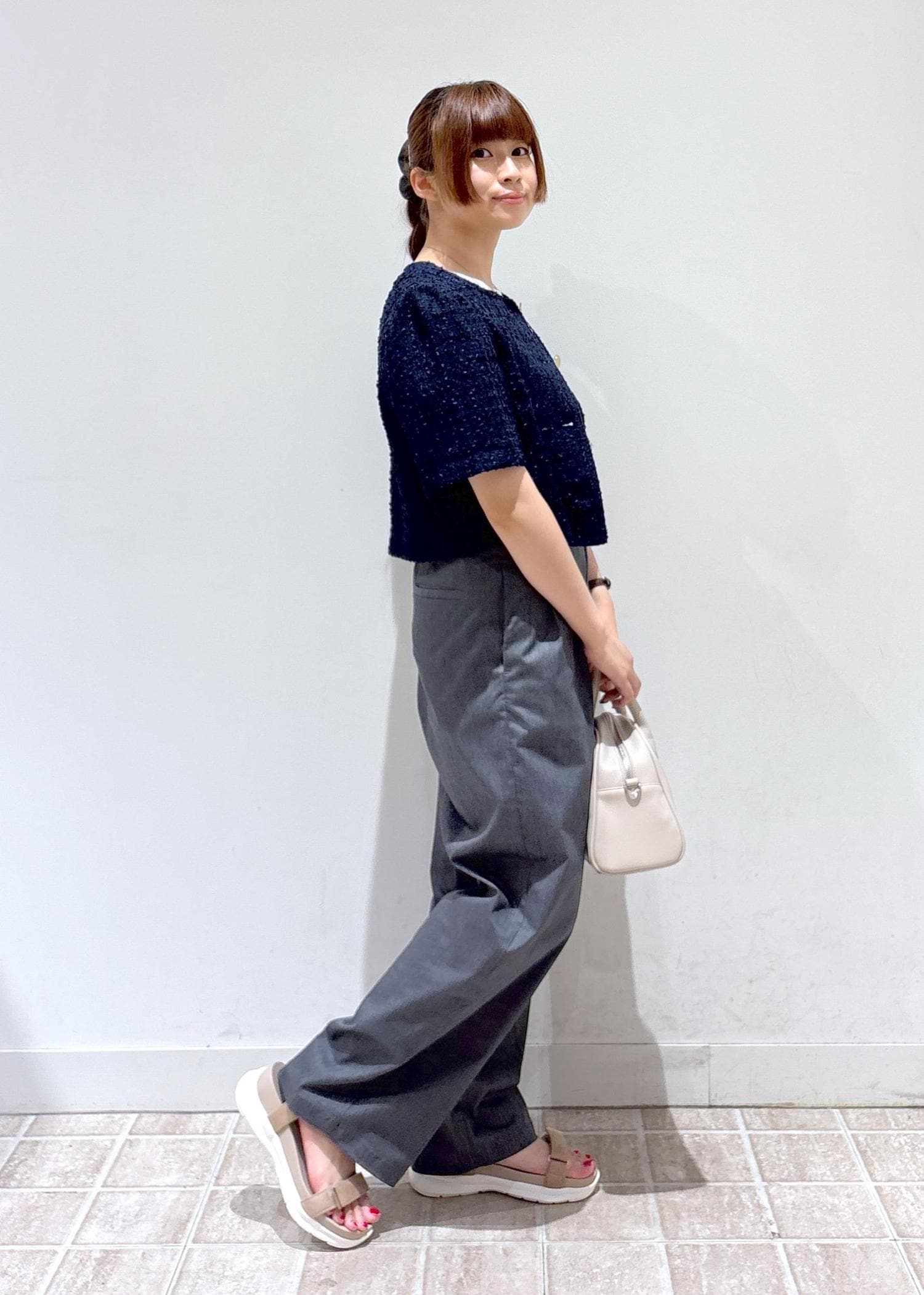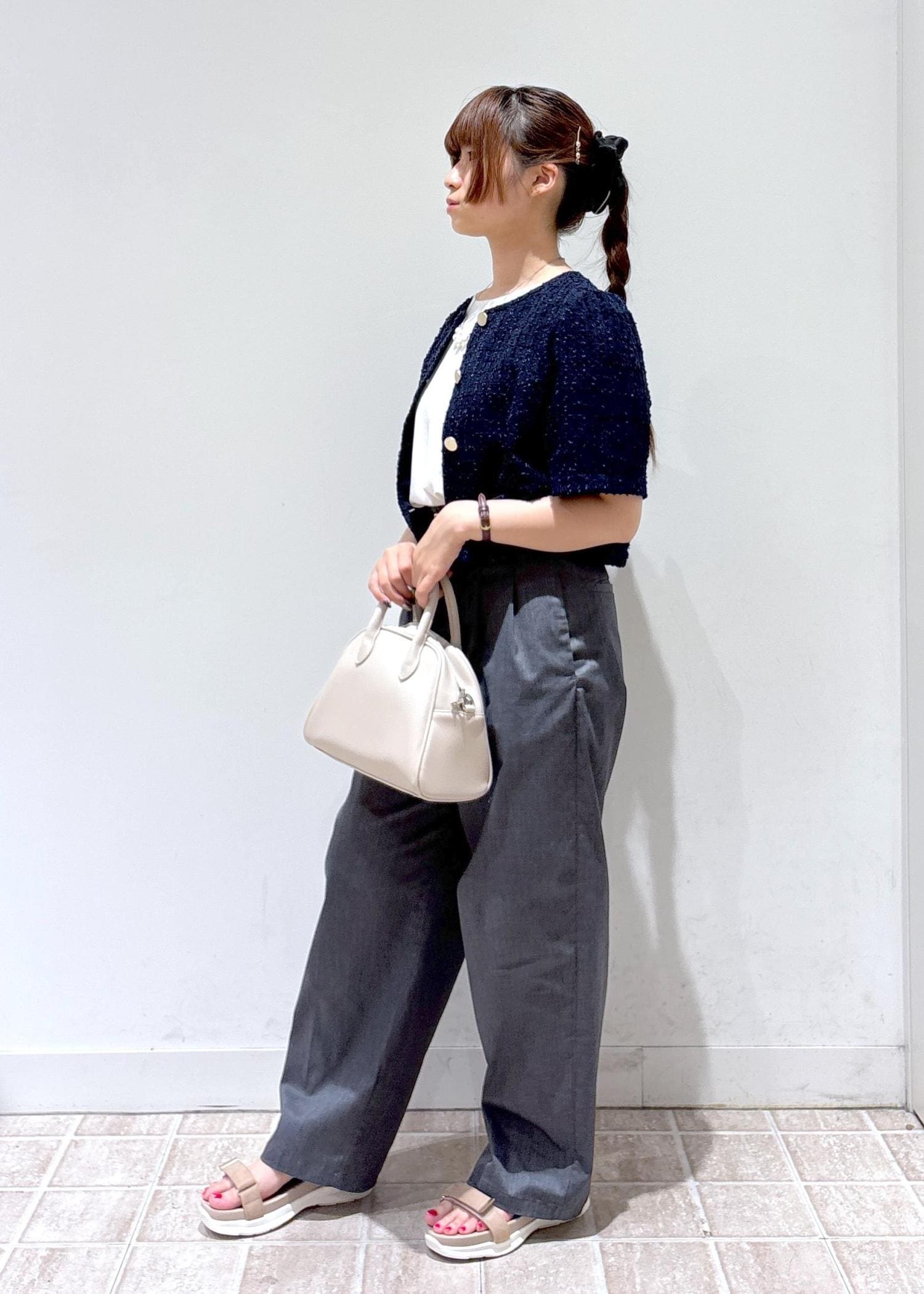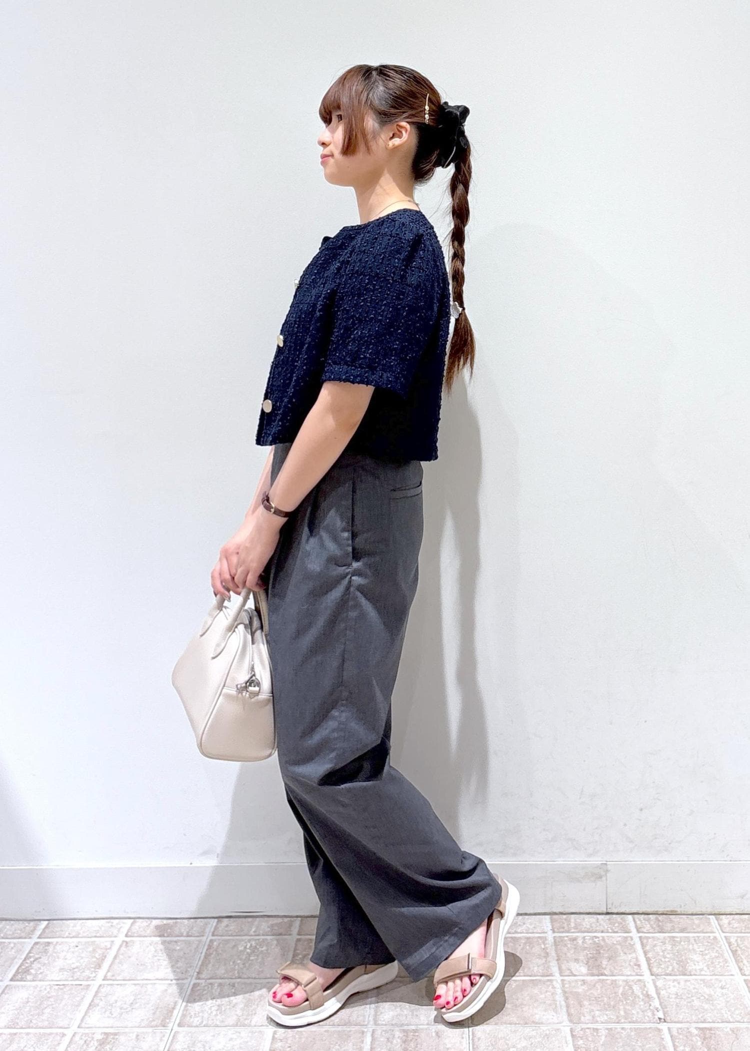 短い丈が特徴のサマーツイードのジャケットとハイウエストで腰周りスッキリ見えるパンツを組み合わせて骨格ウェーブさんにピッタリなコーデにしました。お仕事用でもお使いいただけますし、お出かけ用でもピッタリなコーデです。