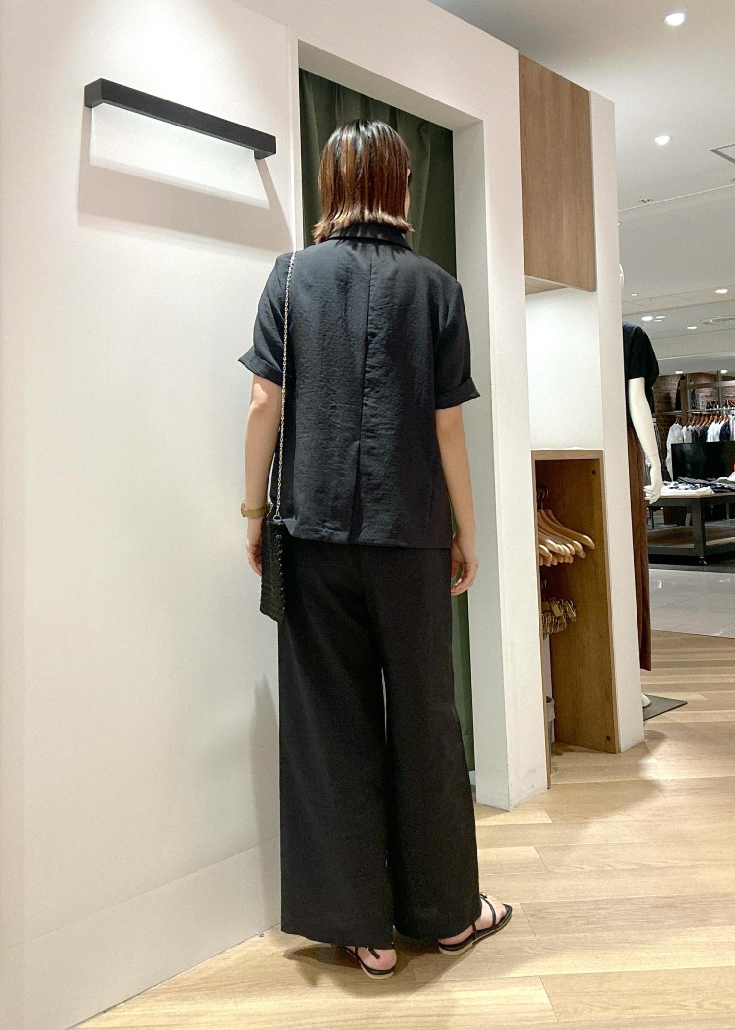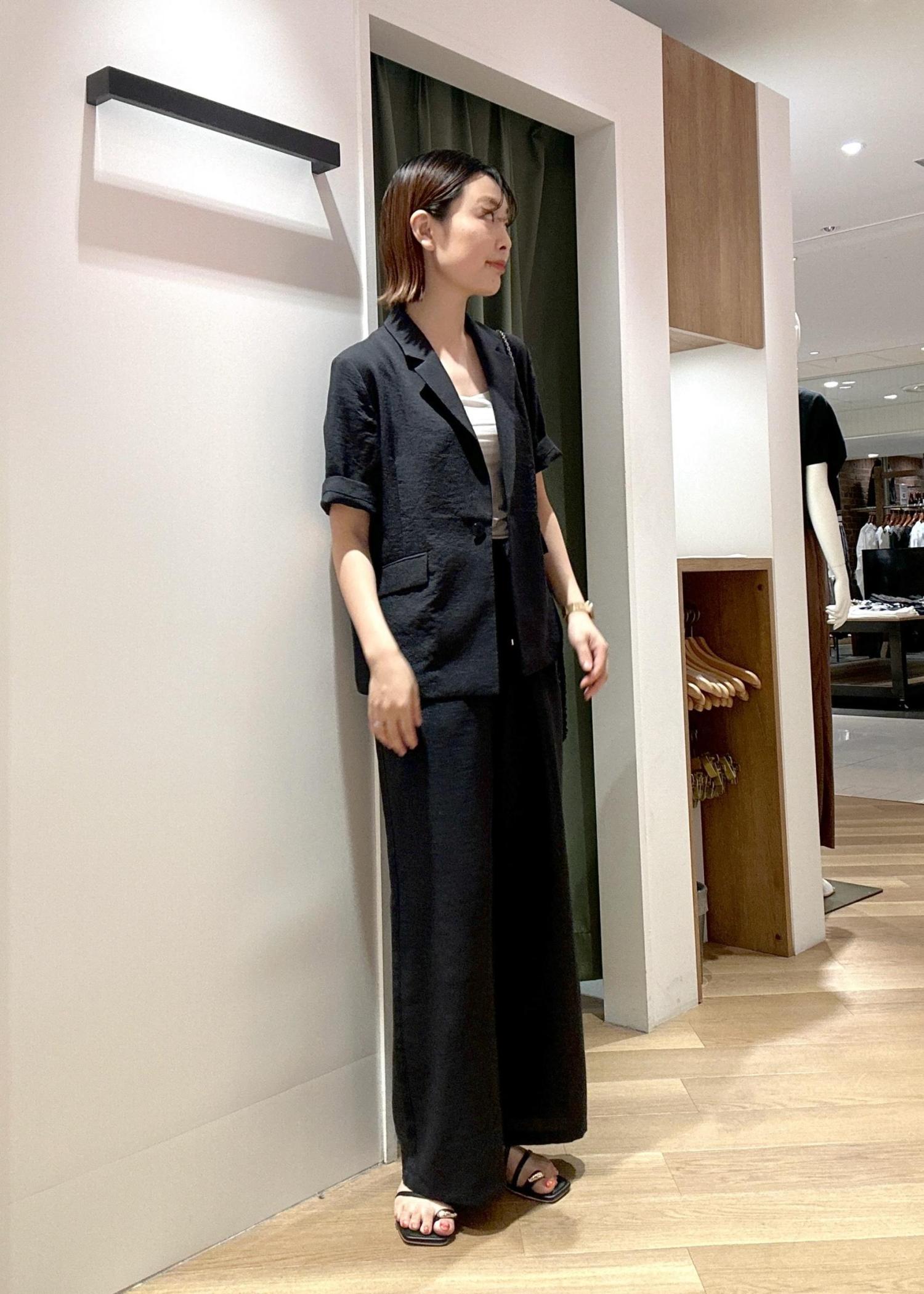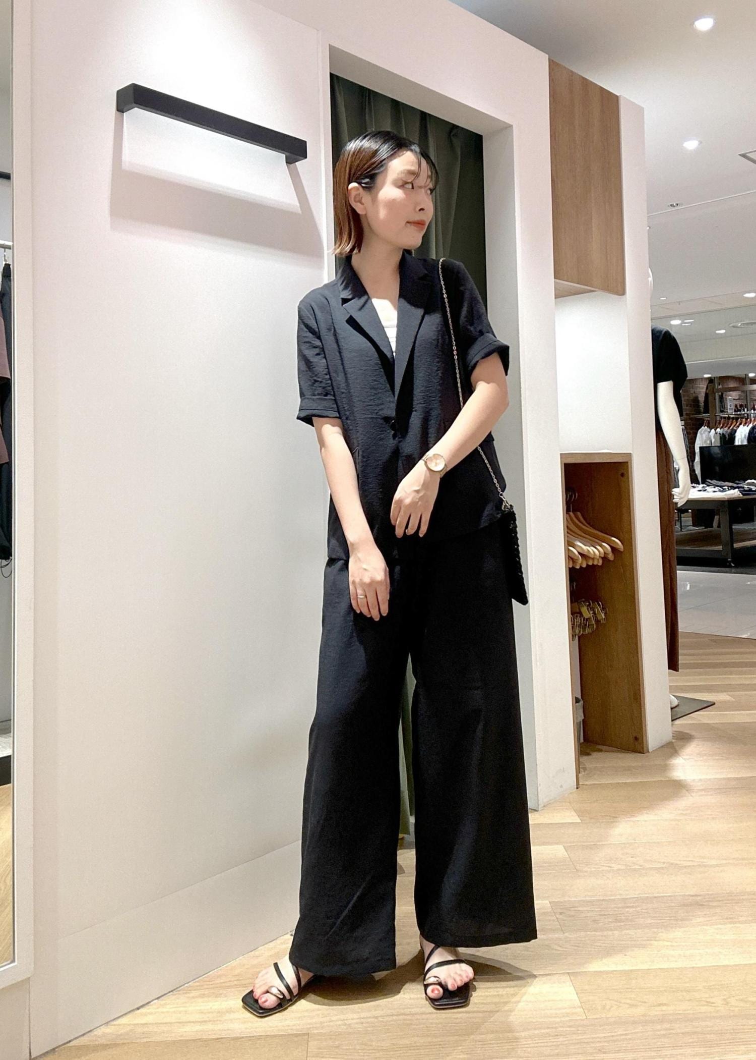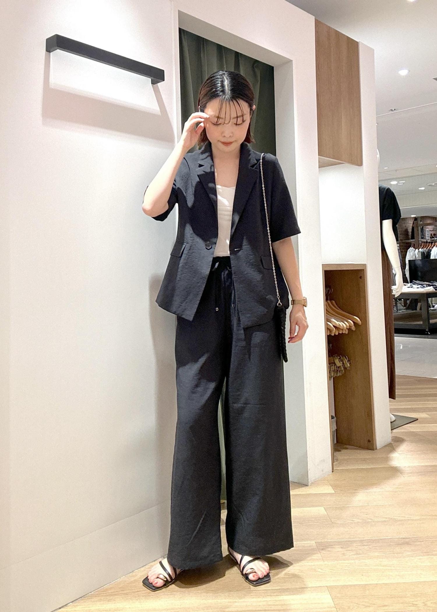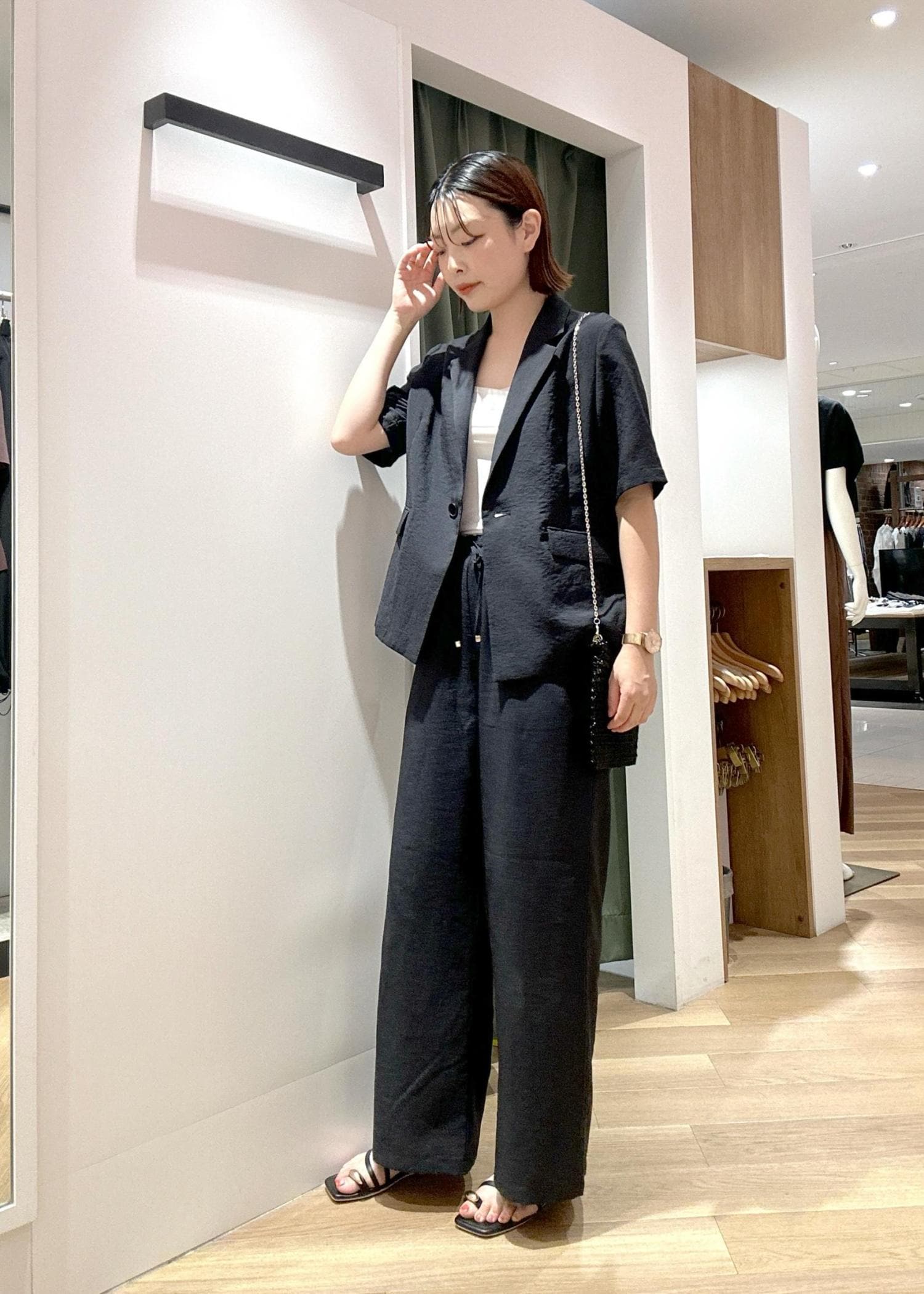 コンパクト目なジャケットにリラックス感のあるワイドパンツを合わせました。足元はフラットなサンダルで抜け感を出せば堅苦しくないセットアップコーデができます。