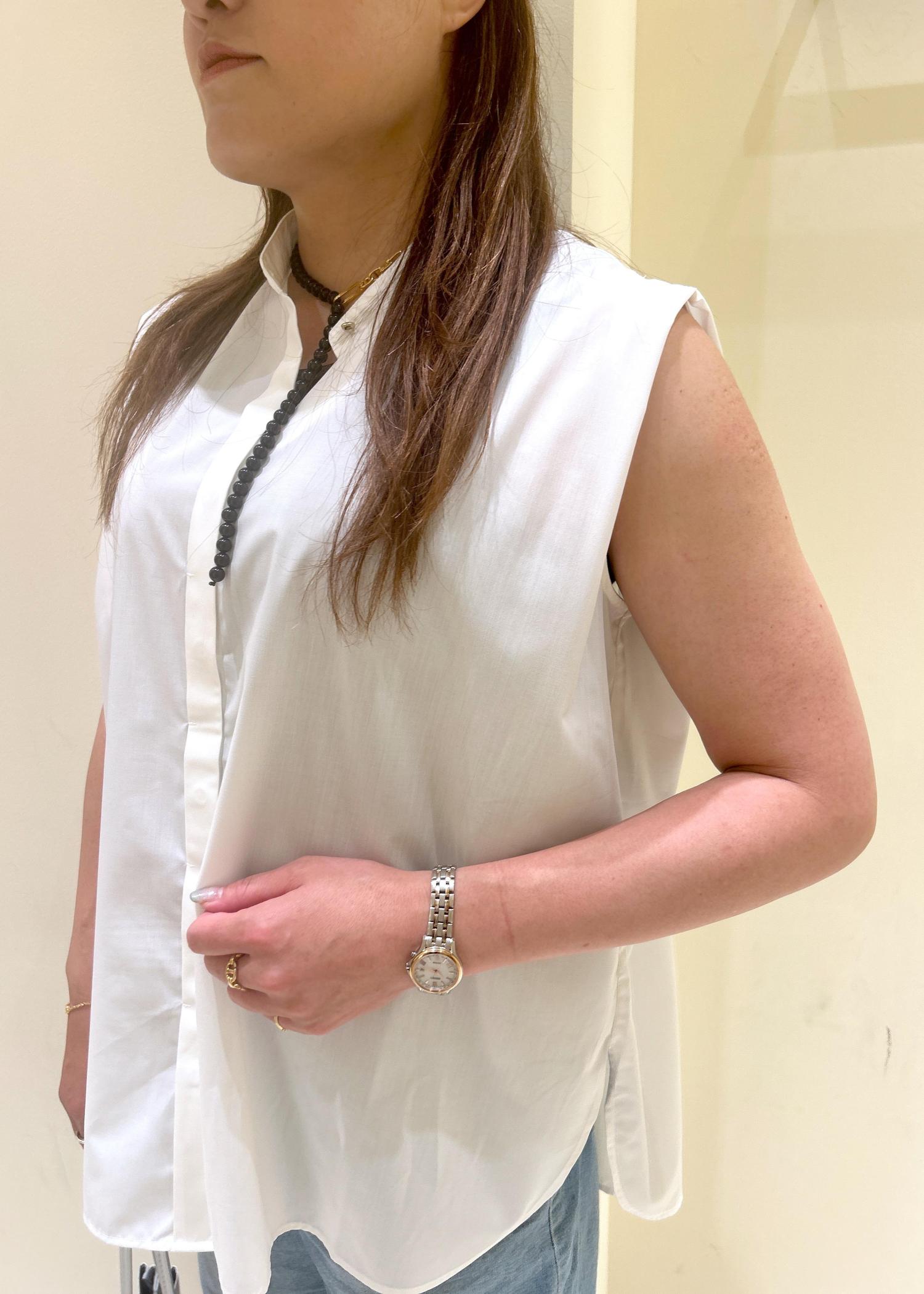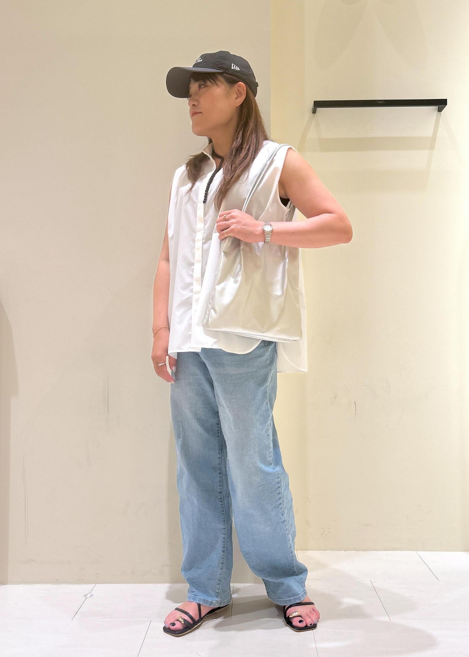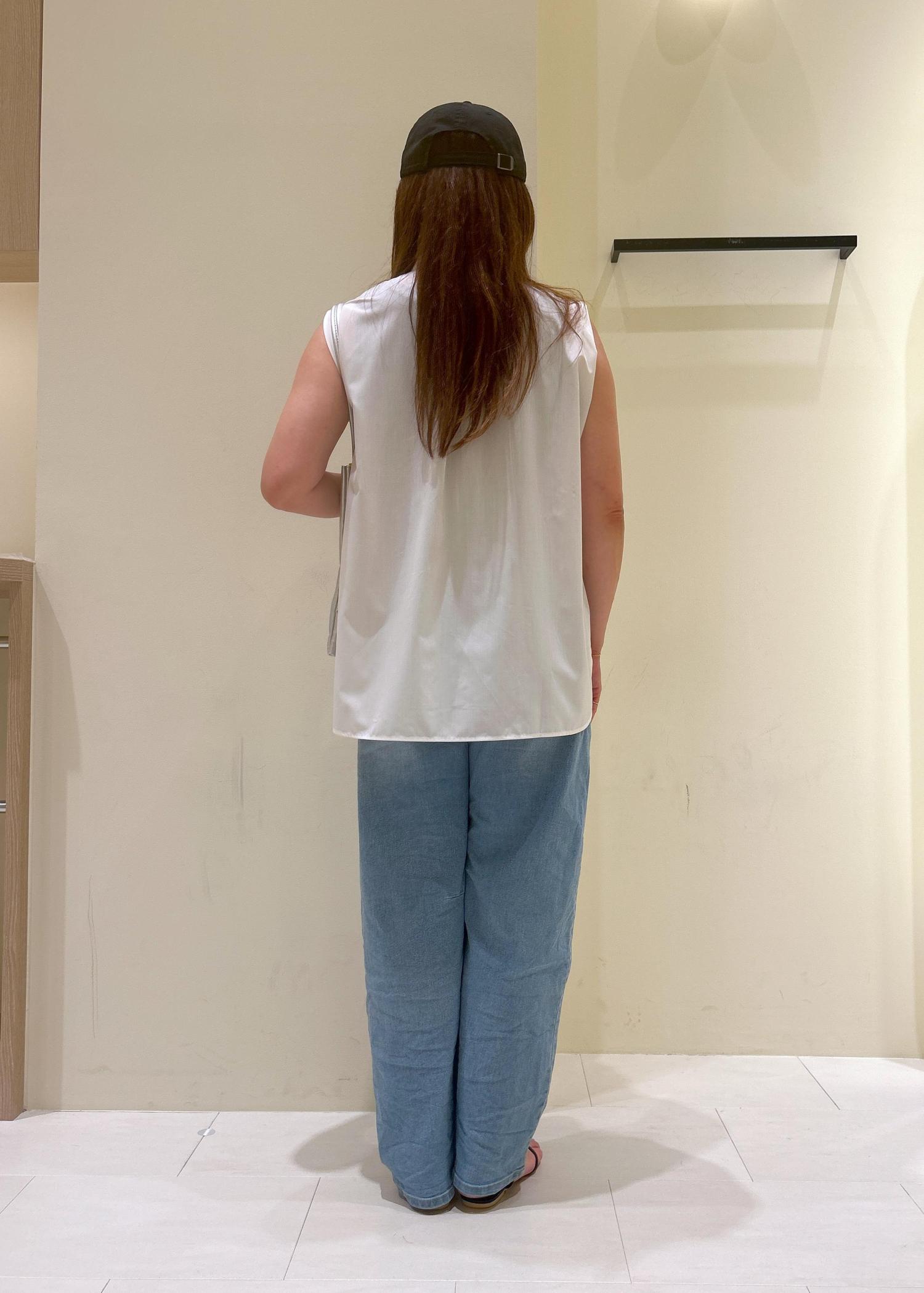 肩のタックが二の腕をスッキリと見せてくれるノースリーブシャツをカジュアルな雰囲気で着てみました。