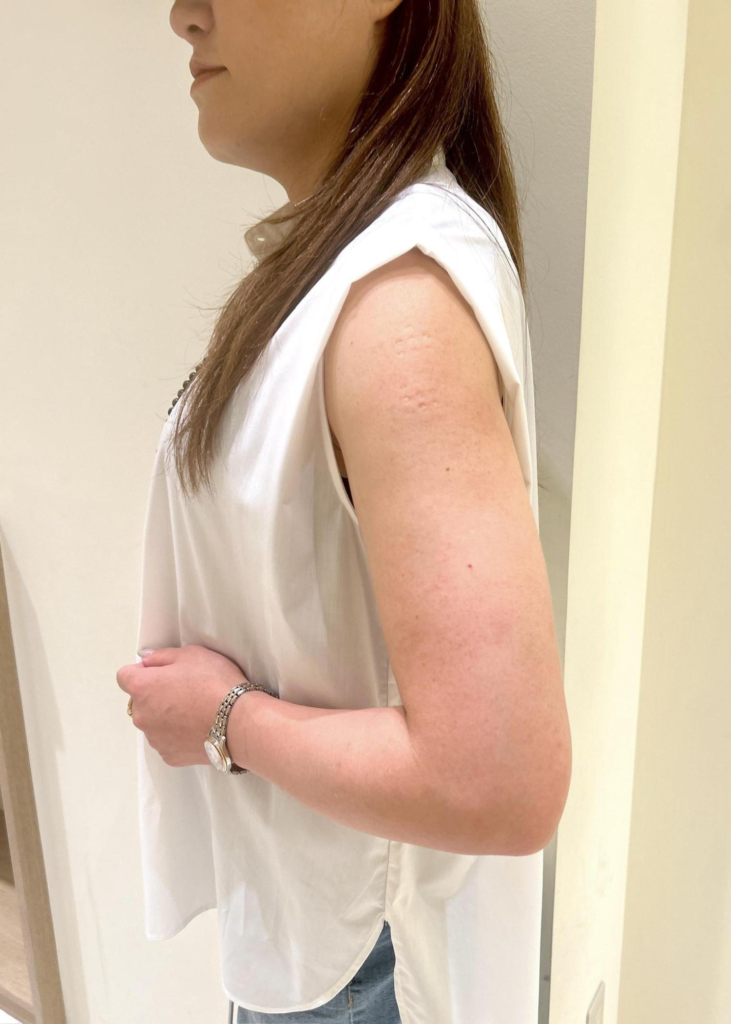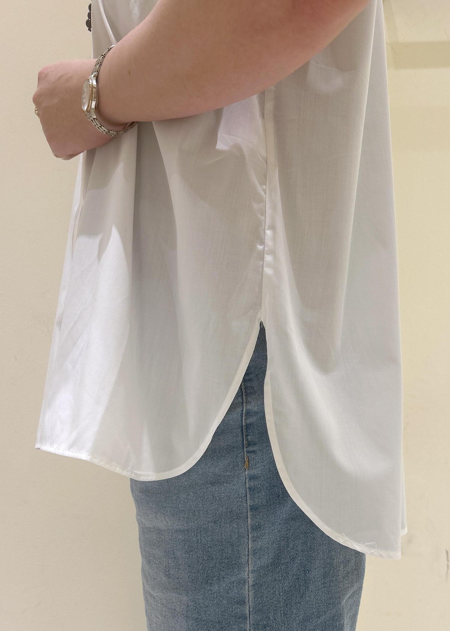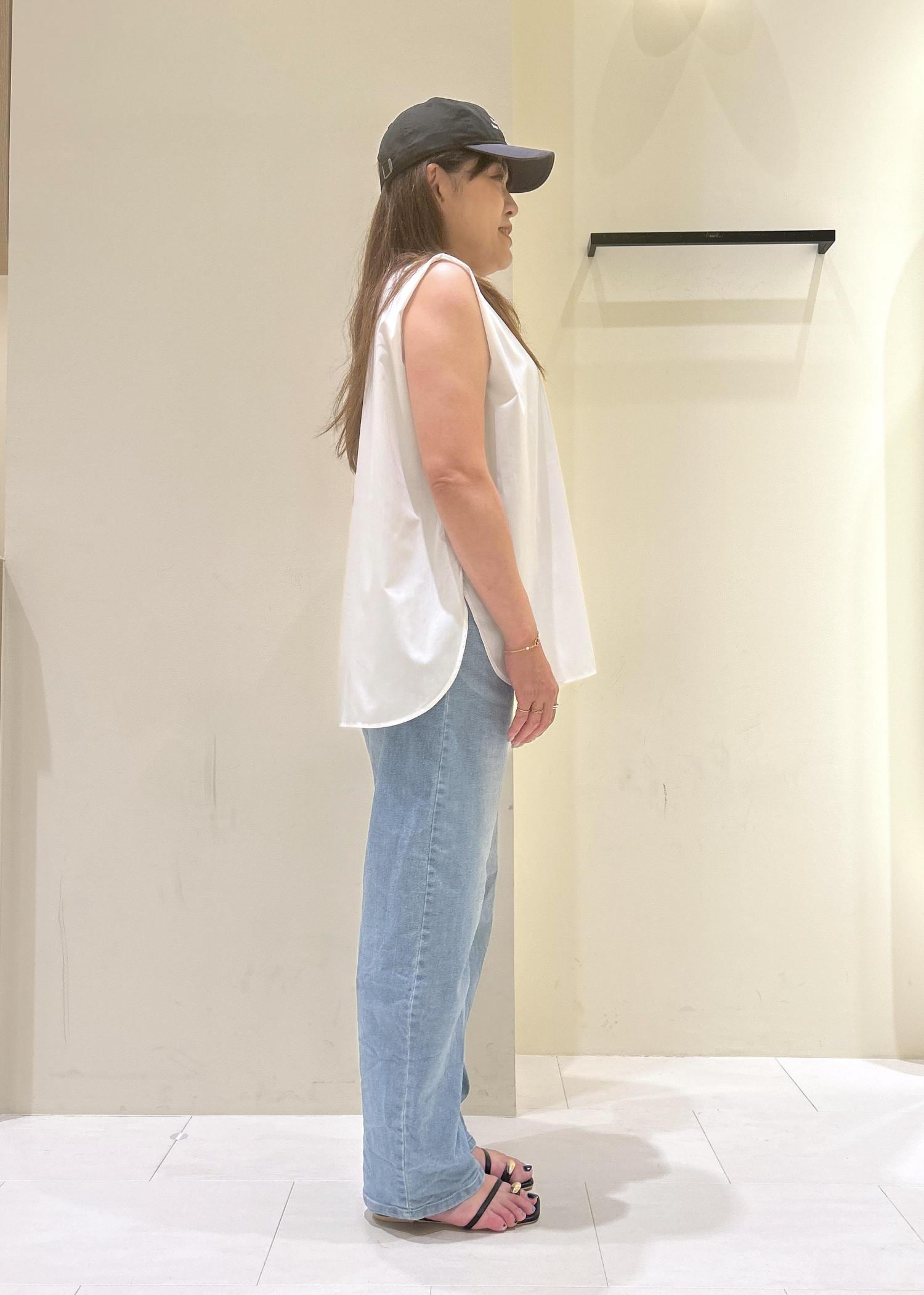 肩のタックが二の腕をスッキリと見せてくれるノースリーブシャツをカジュアルな雰囲気で着てみました。