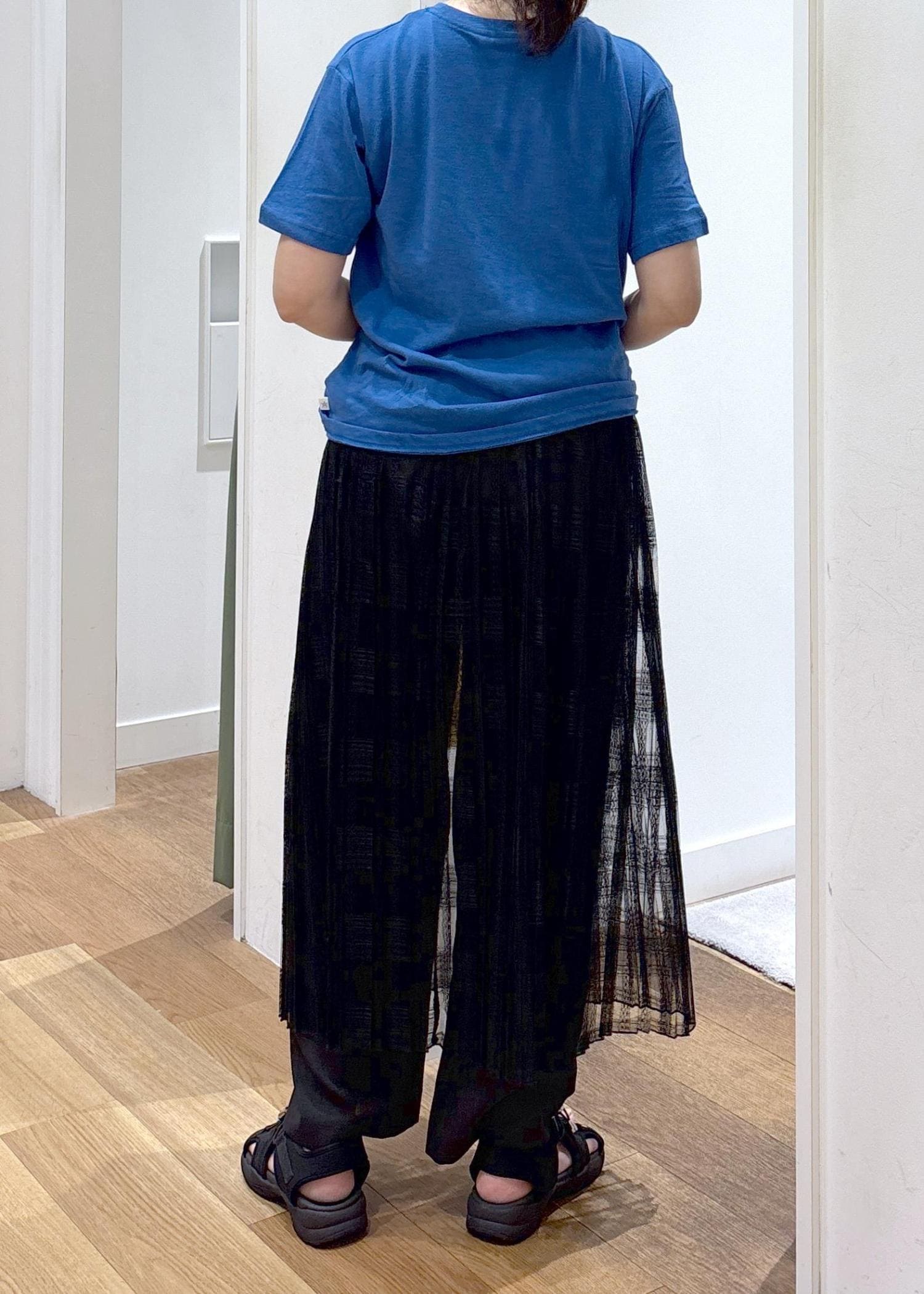 チュールのスカートとパンツをレイヤードし、