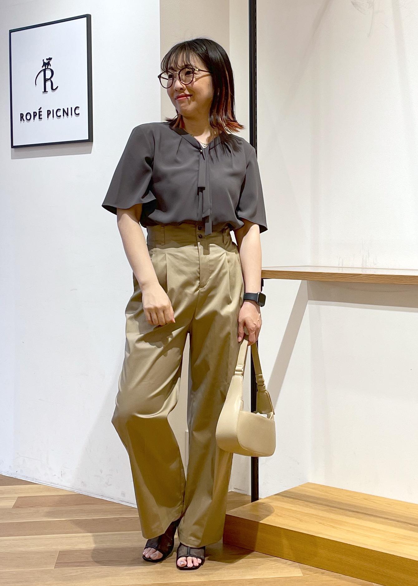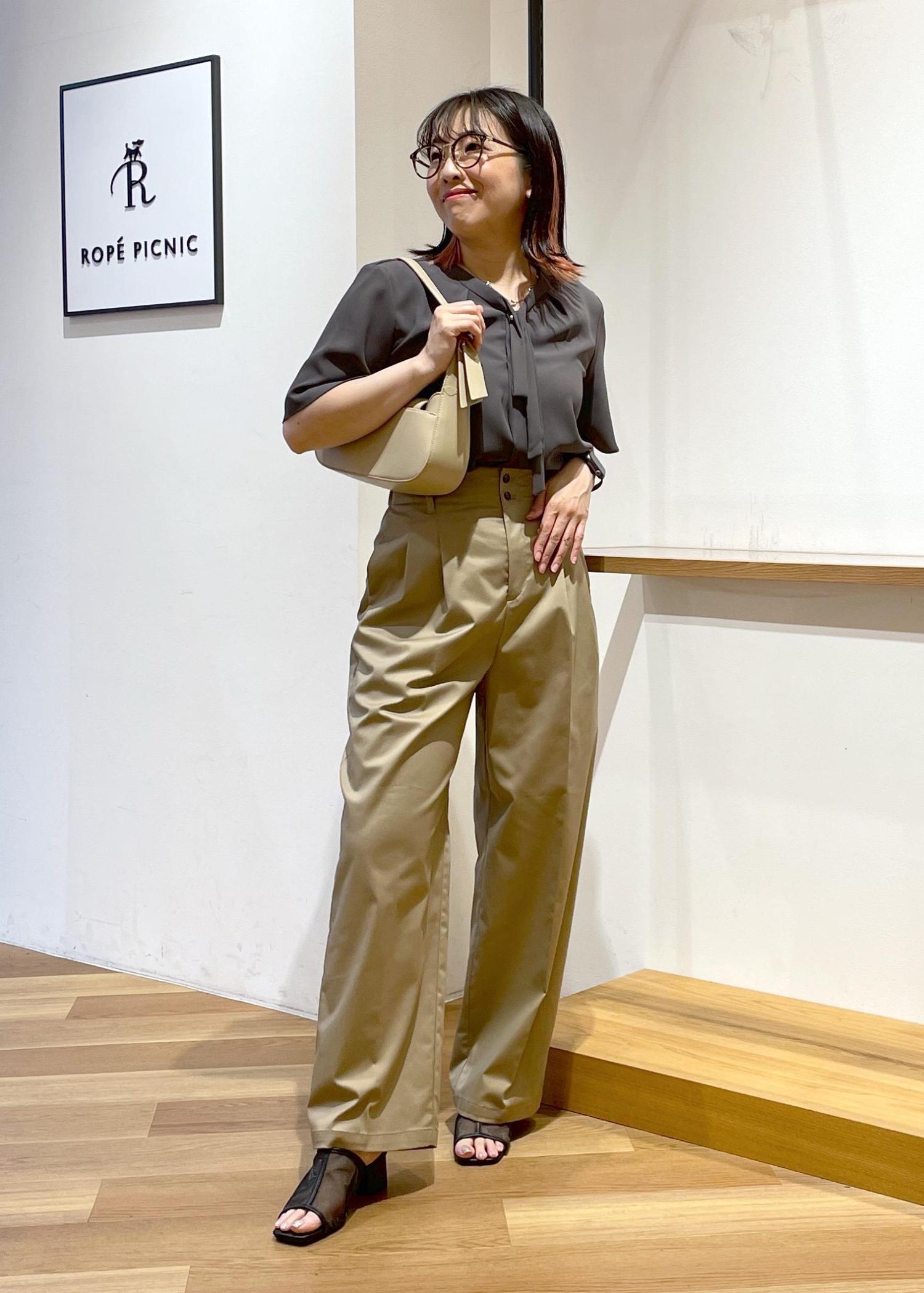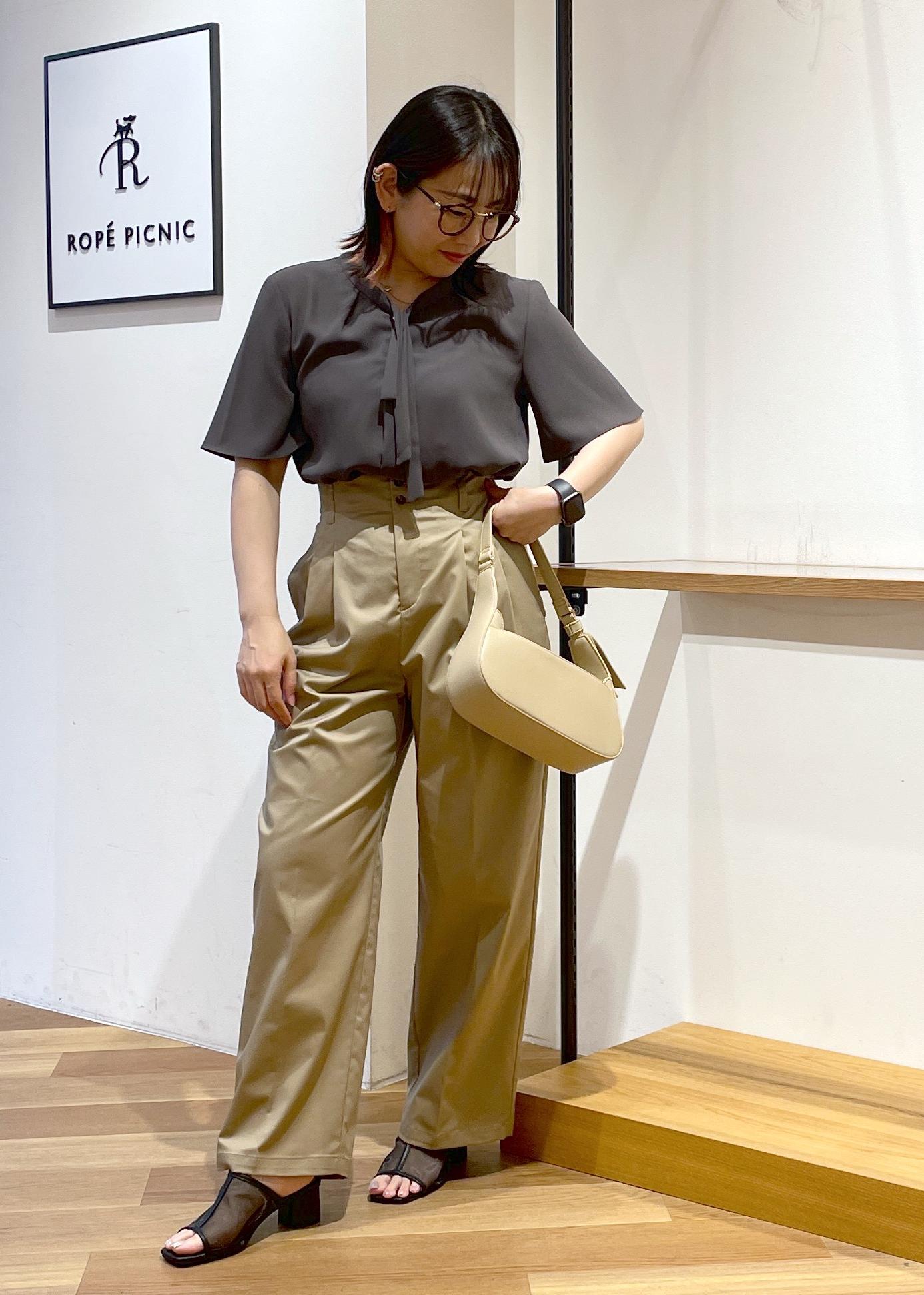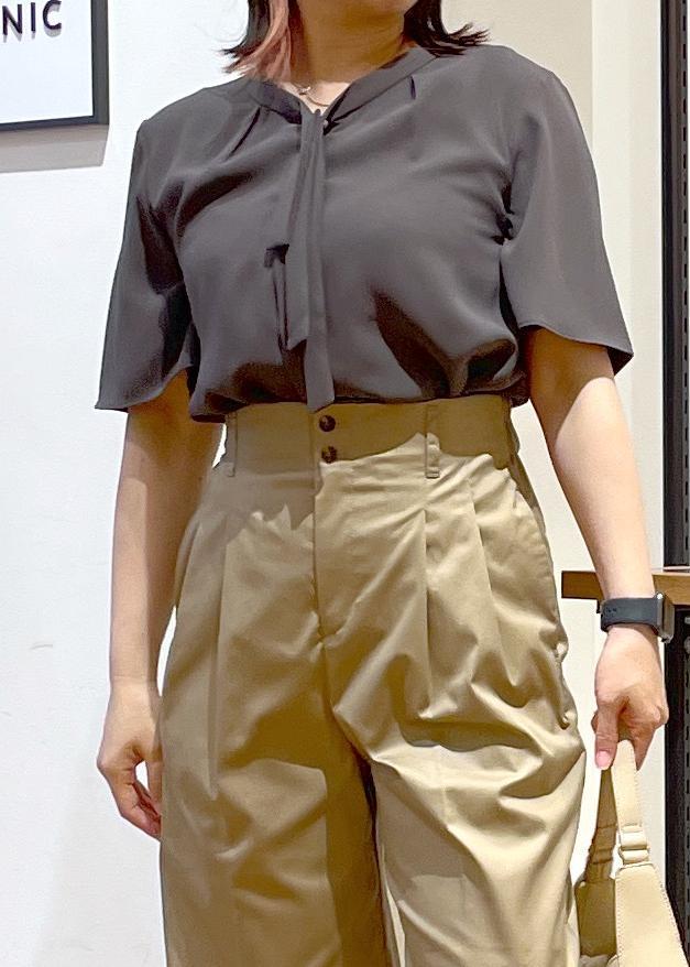 リボンタイの半袖ブラウスです。お首元はVネックでスッキリ見えします。