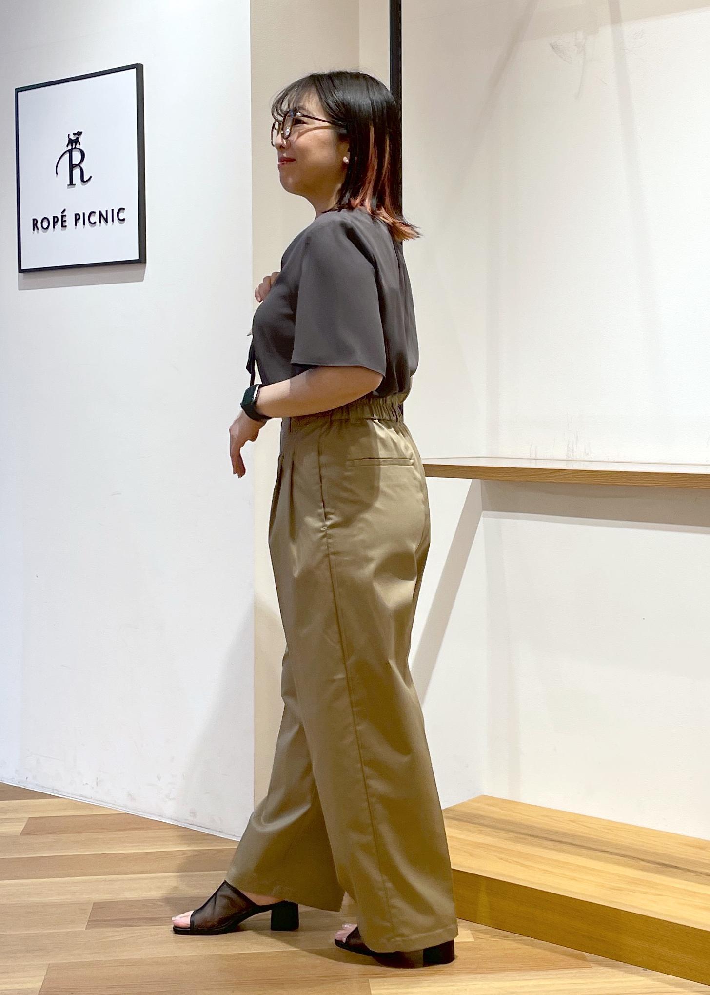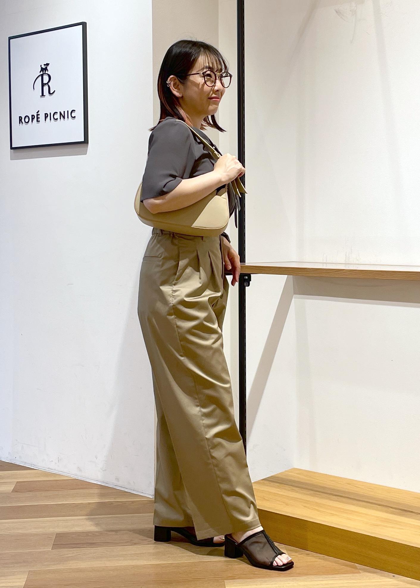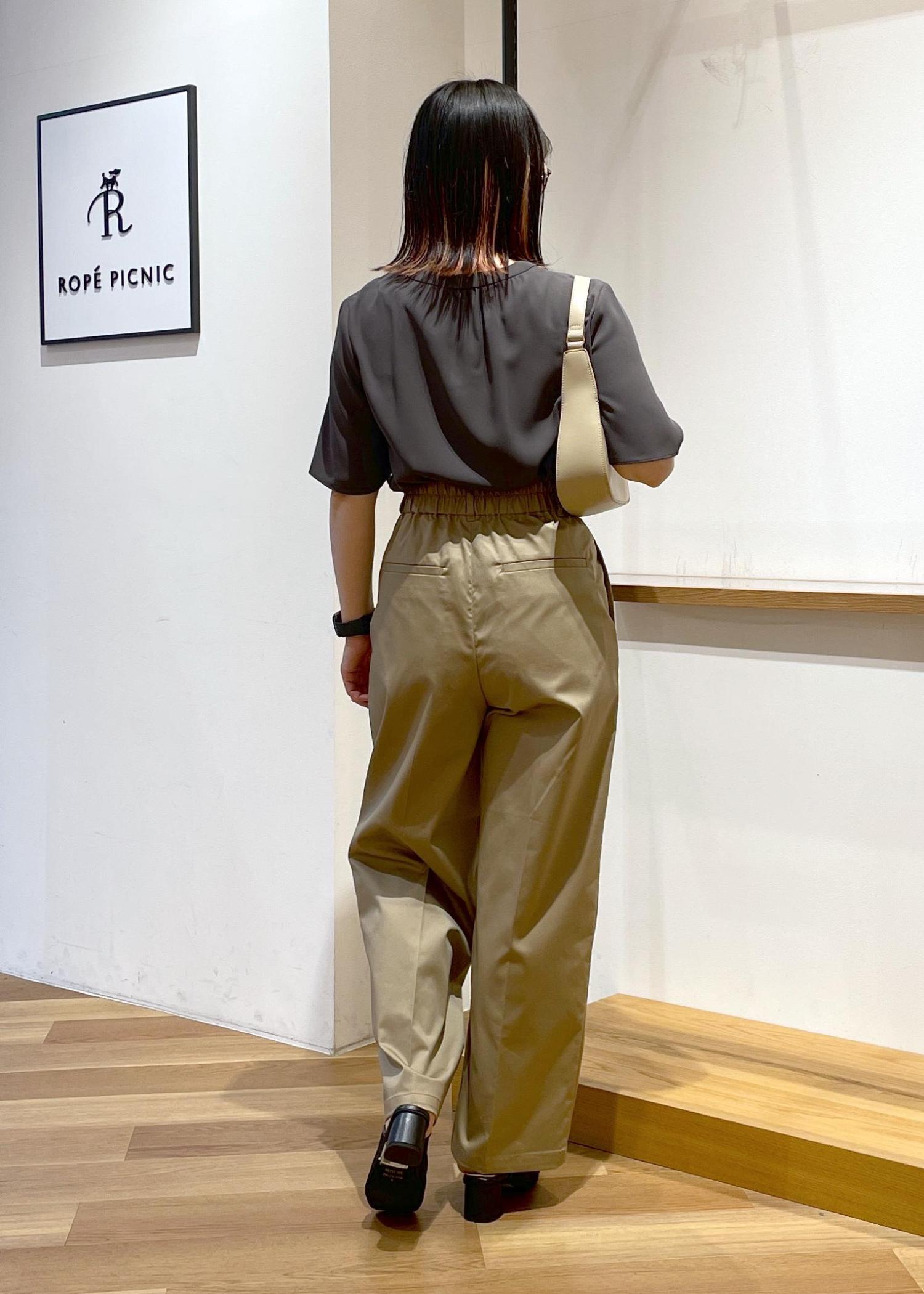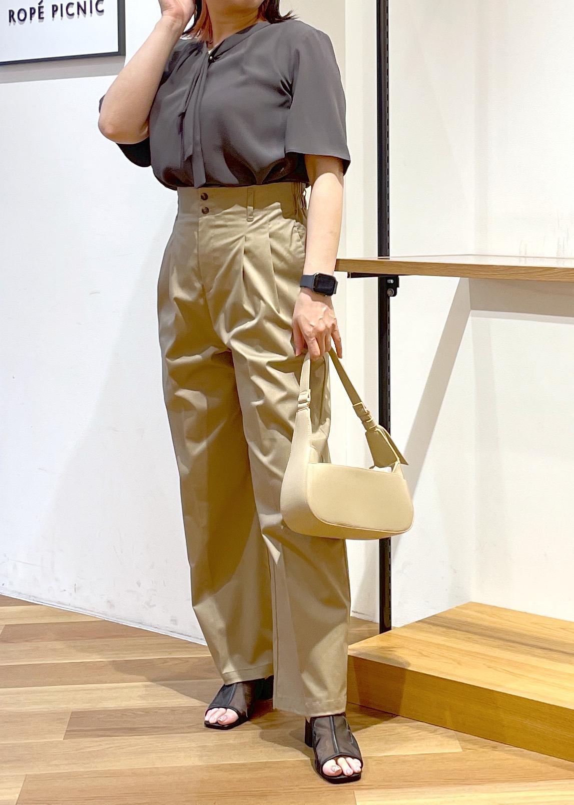 ハイウエストのチノパンツです。脚長効果ありです○程よい光沢感でオフィスカジュアルやキレイめスタイルにも合わせやすいです。